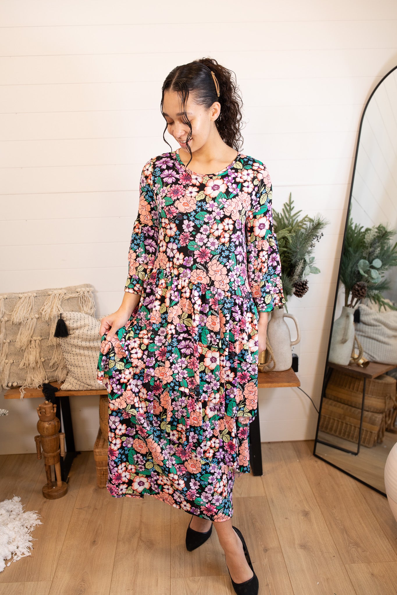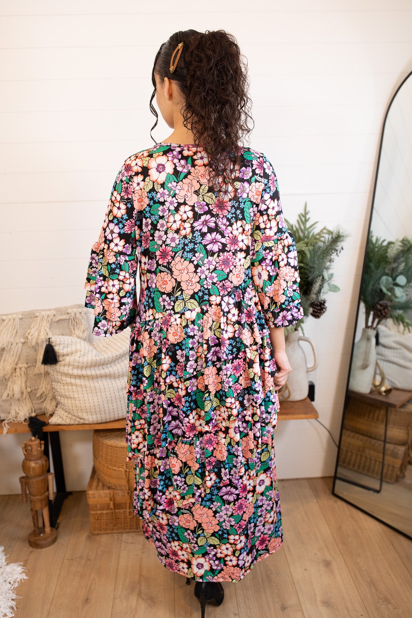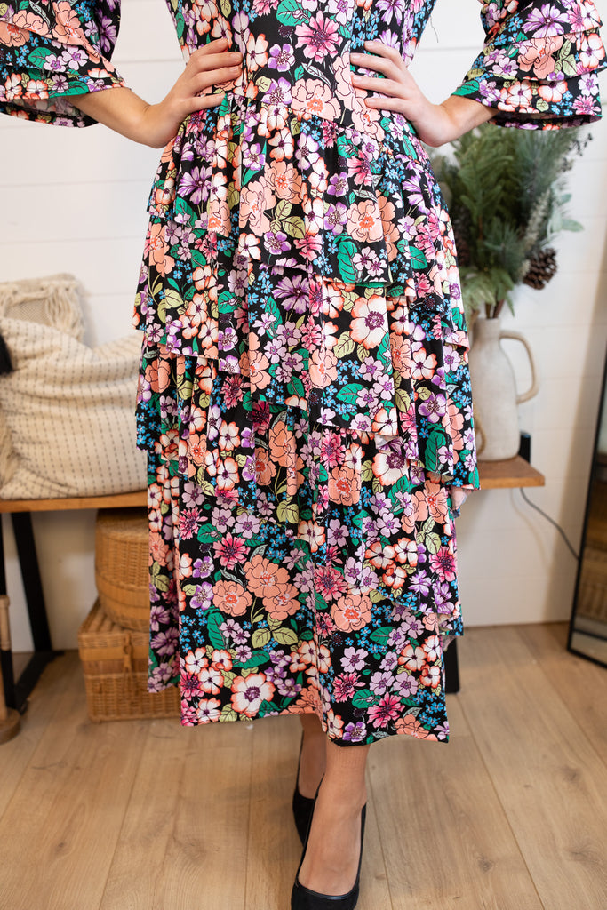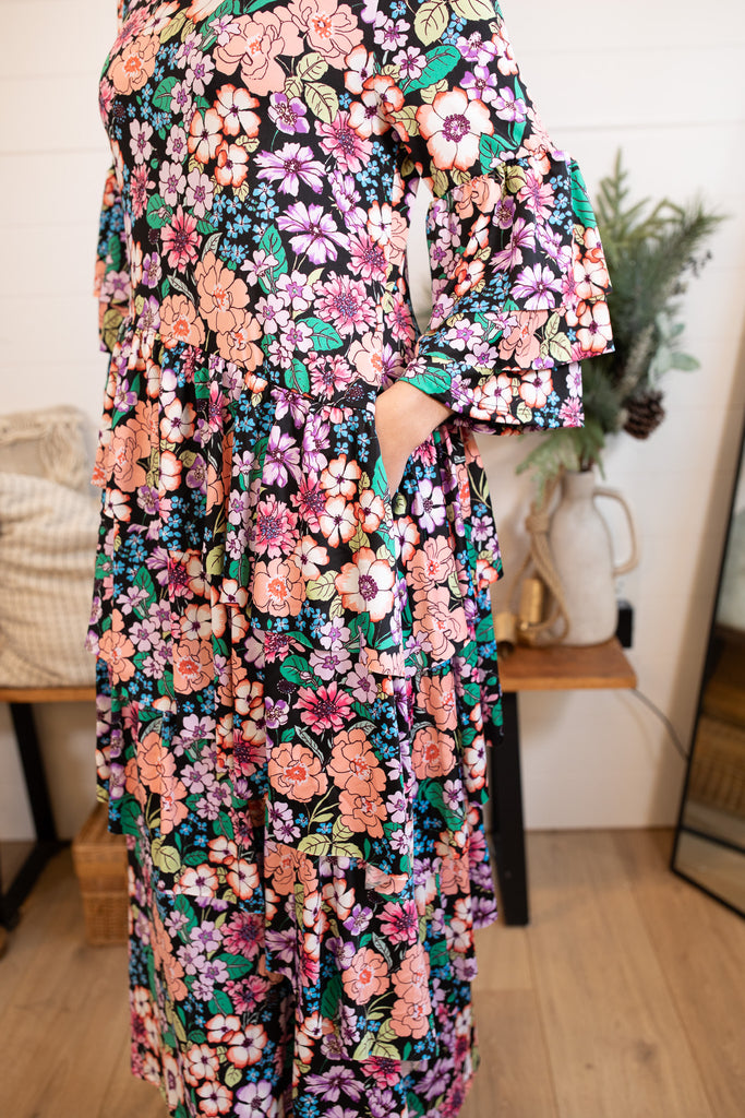 Meet your new everyday favorite—our vibrant floral cascading ruffle dress! Made from our signature non-wrinkle, ultra-stretchy fabric, this beauty keeps you comfortable and polished all day long with zero fuss. The standout feature is the cascading ruffle detail that sweeps diagonally across the front for a flattering, feminine silhouette. It also includes one convenient pocket (the other side is ruffle-covered for a smooth finish!), 3/4 sleeves, and a flowy fit that moves beautifully. Perfect for church, outings, or travel, this easy-care, easy-wear dress is as practical as it is stunning