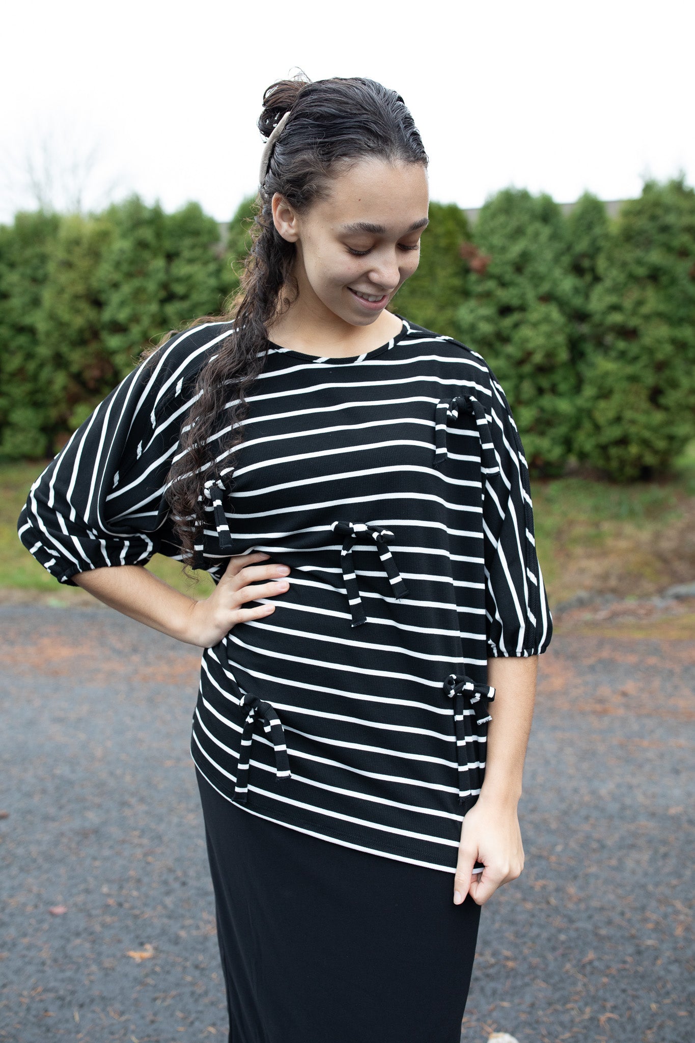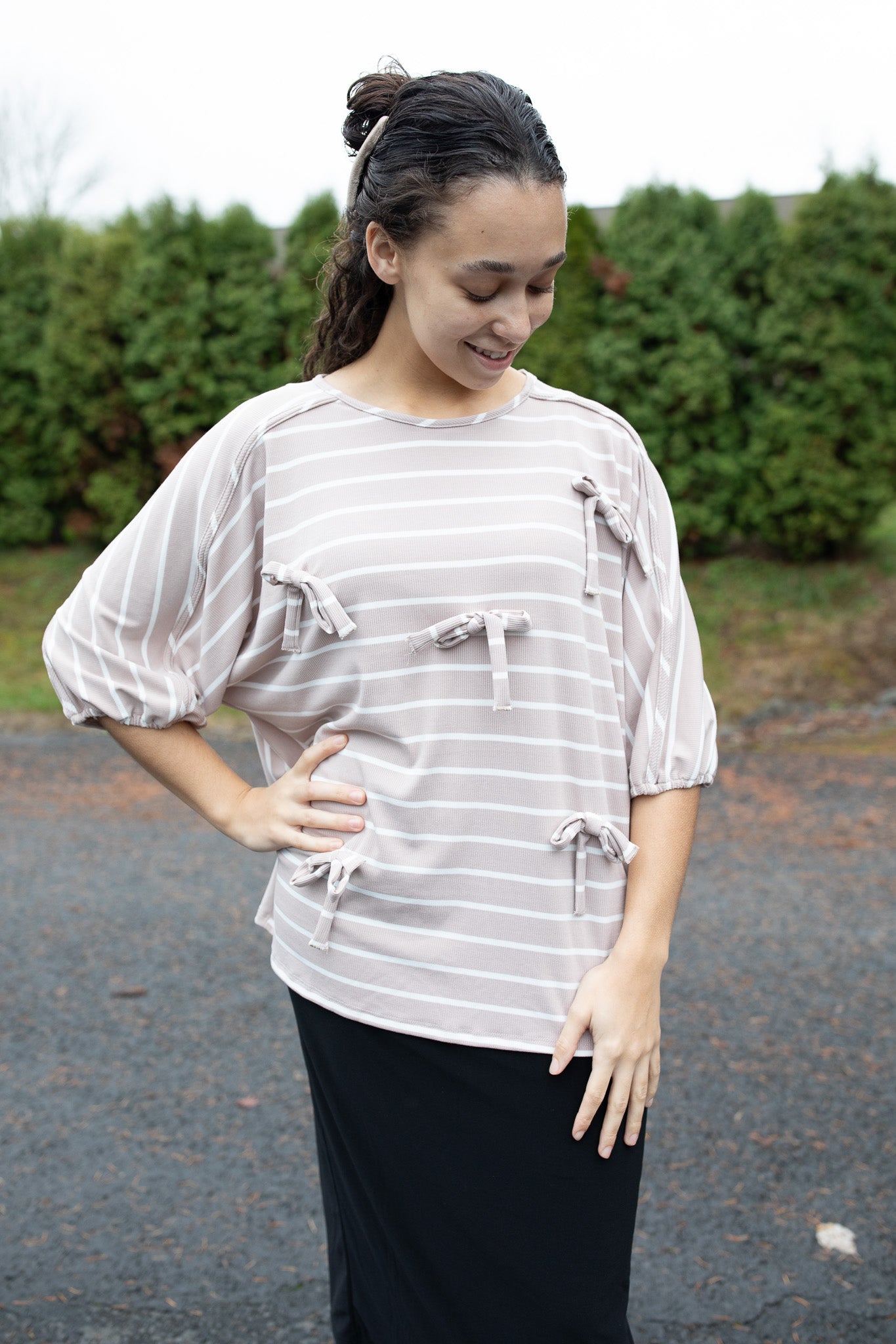 Cozy, cute, and perfect for the season! This striped bow-front top features a relaxed batwing fit with a soft, ribbed fabric that feels amazing on the skin. The playful bow detail adds a feminine touch while keeping the look effortless and stylish. Lightweight yet warm, it’s the ideal throw-on piece for everyday wear — available in two beautiful striped color options to match any outfit! -LIMITED - LOW PRICE DOORBUSTER