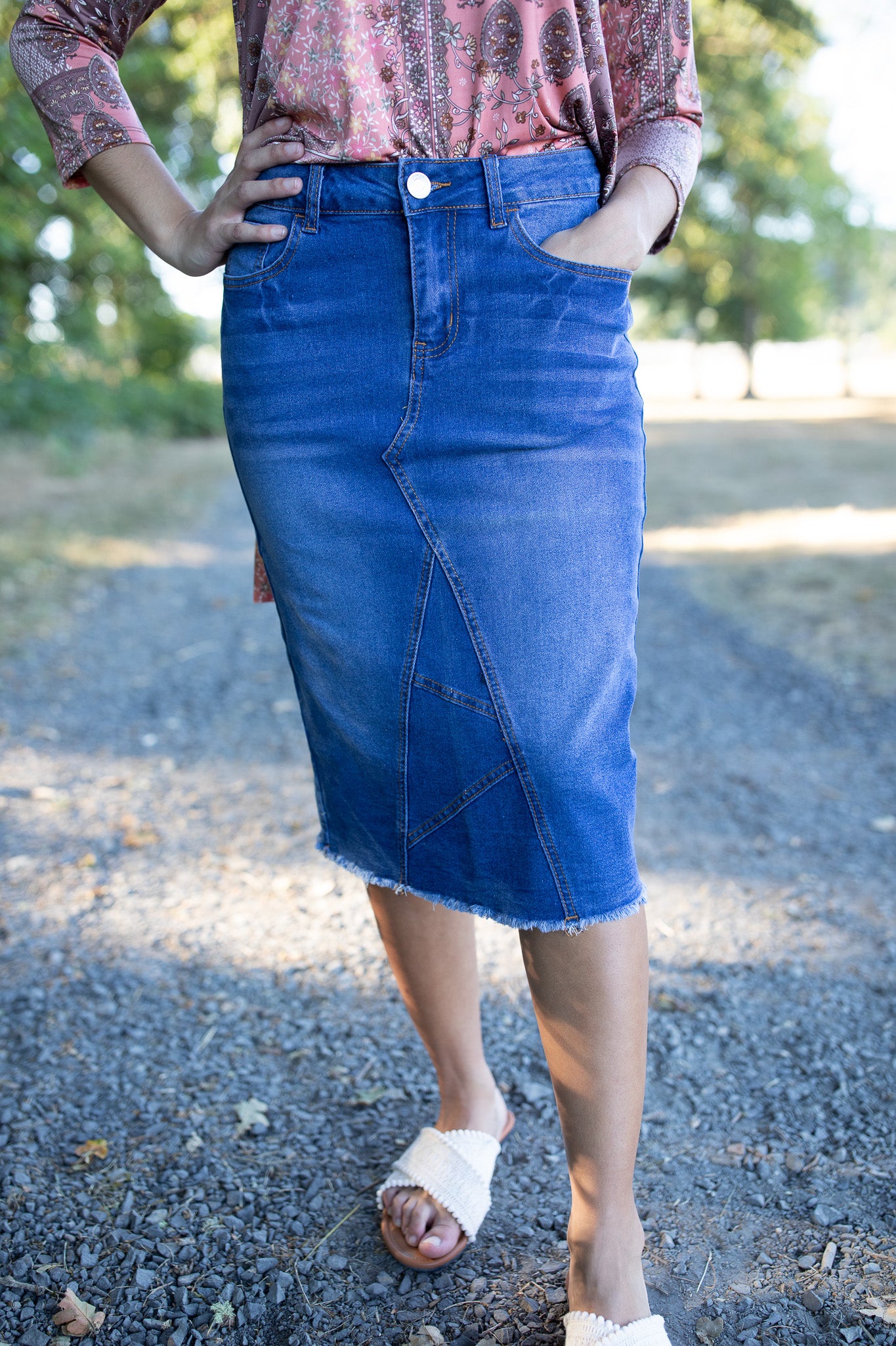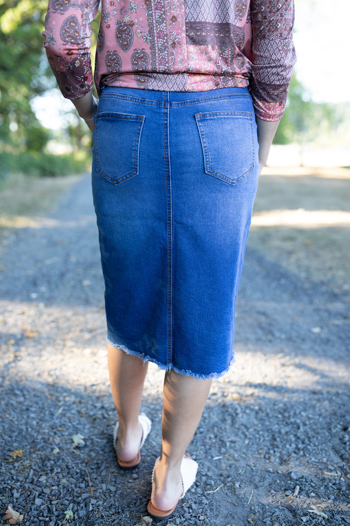 Meet your new go-to for effortless fall style! The Harvest Indigo Skirt features a rich indigo wash, unique angled seam detail, and just the right amount of stretch for all-day comfort. With no slit and a flattering modest fit, it's a perfect match for cozy sweaters, boots, or your favorite layering tops. Designed for style and function, this skirt is a fall wardrobe essential!