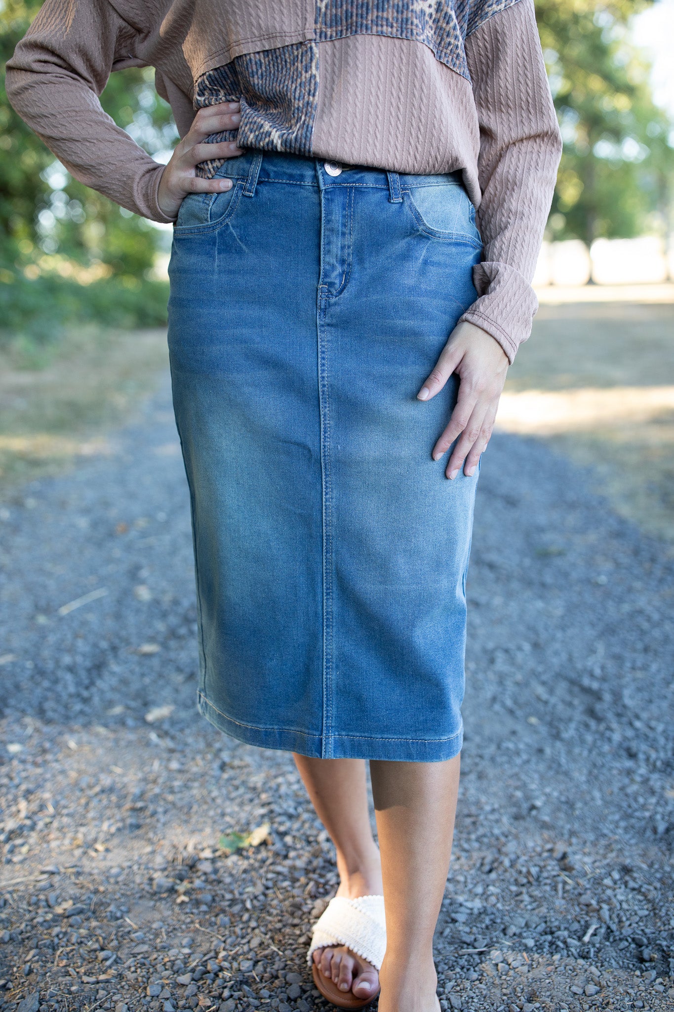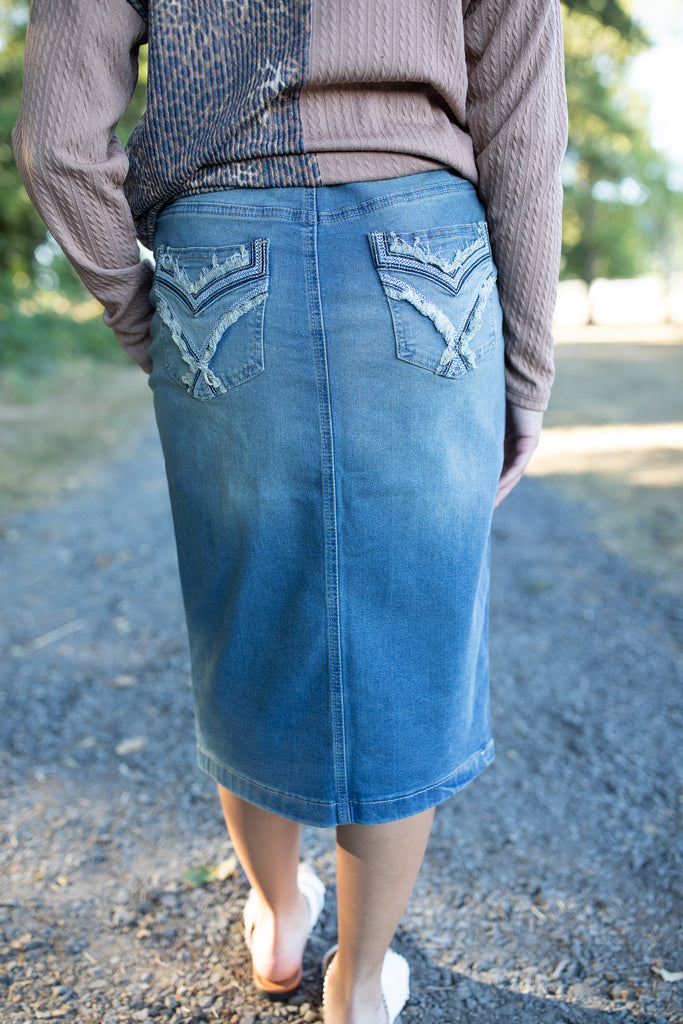 Step into timeless style with our Vintage Charm Skirt! Featuring a soft vintage wash and beautifully detailed back pockets with frayed embroidery, this denim piece adds flair from every angle. The modest, no-slit design offers full coverage while the stretchy fabric keeps it comfortable for everyday wear. Dress it up or downβthis skirt is a must-have for your fall wardrobe.
