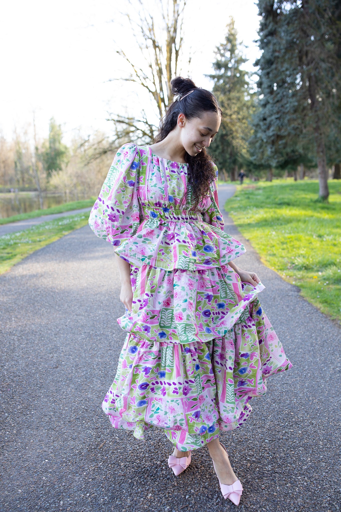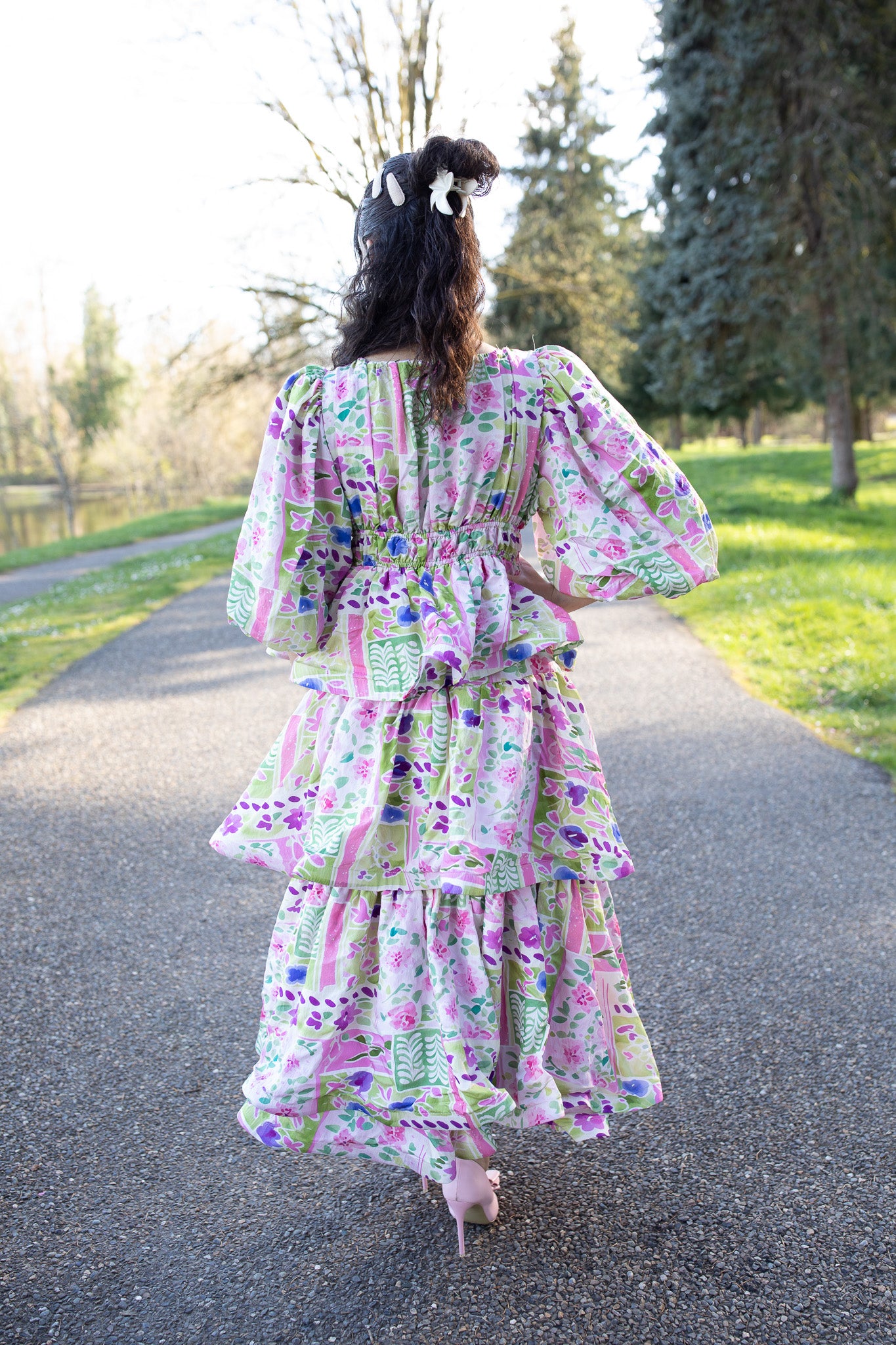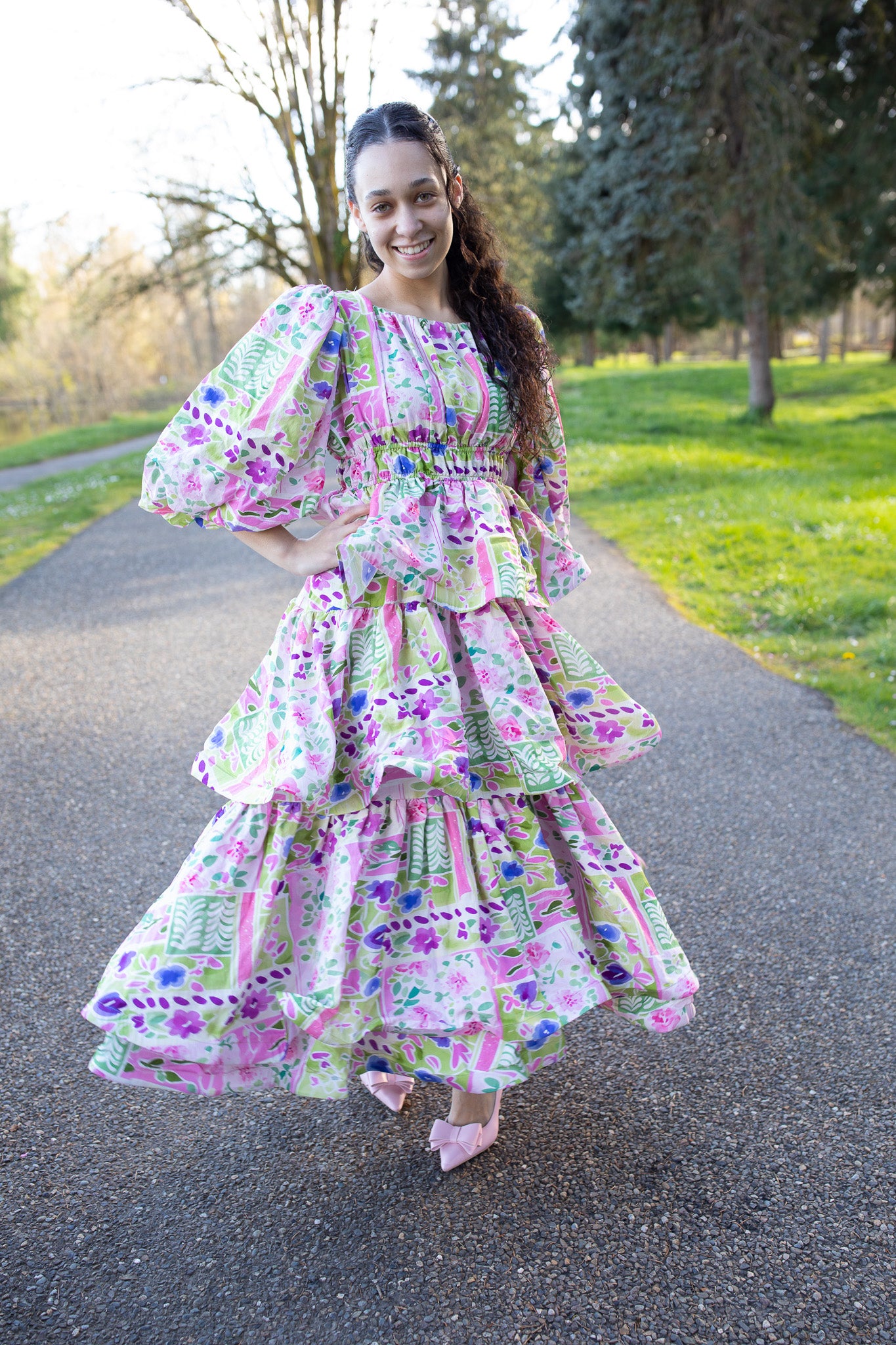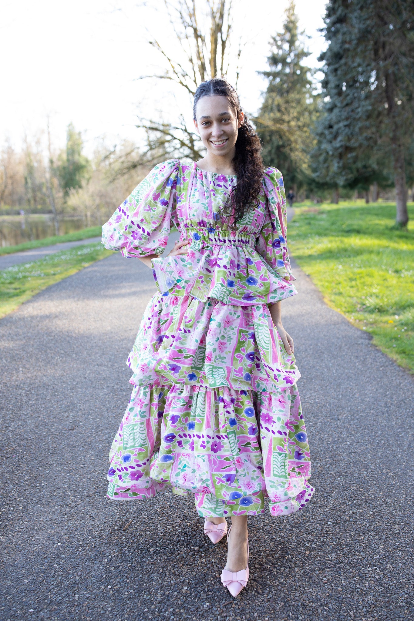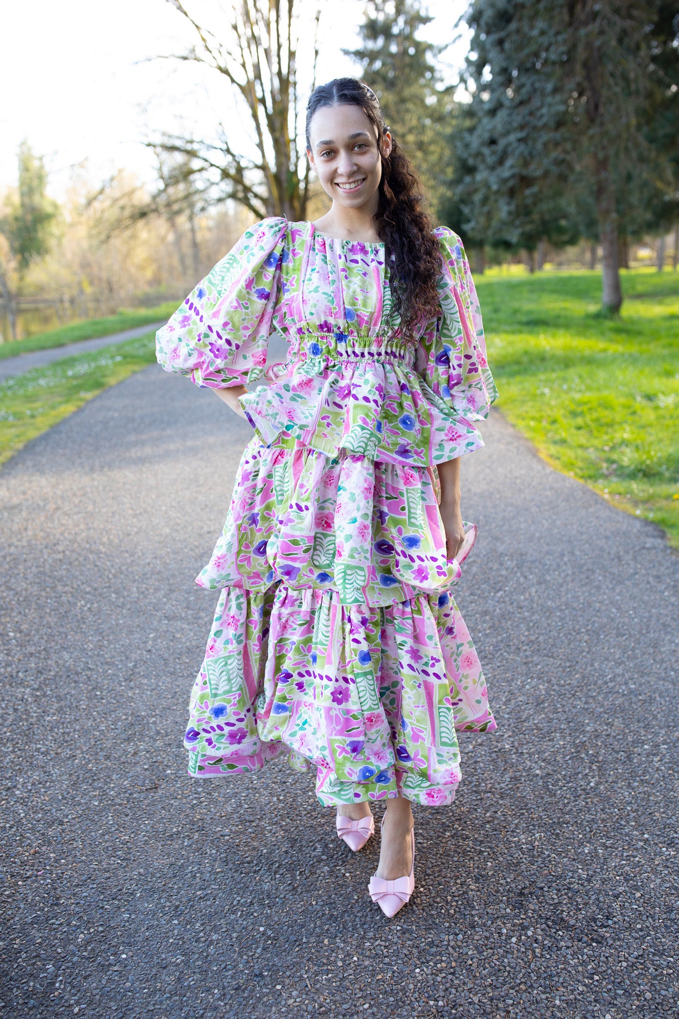 Designed with a comfortable elastic waist, soft puffy sleeves, and a single-layer tiered design, it has the perfect amount of flow without feeling too full. Made from a breathable cotton woven fabric, it offers a more structured feel with little to no stretch while still keeping you comfortable all day long.