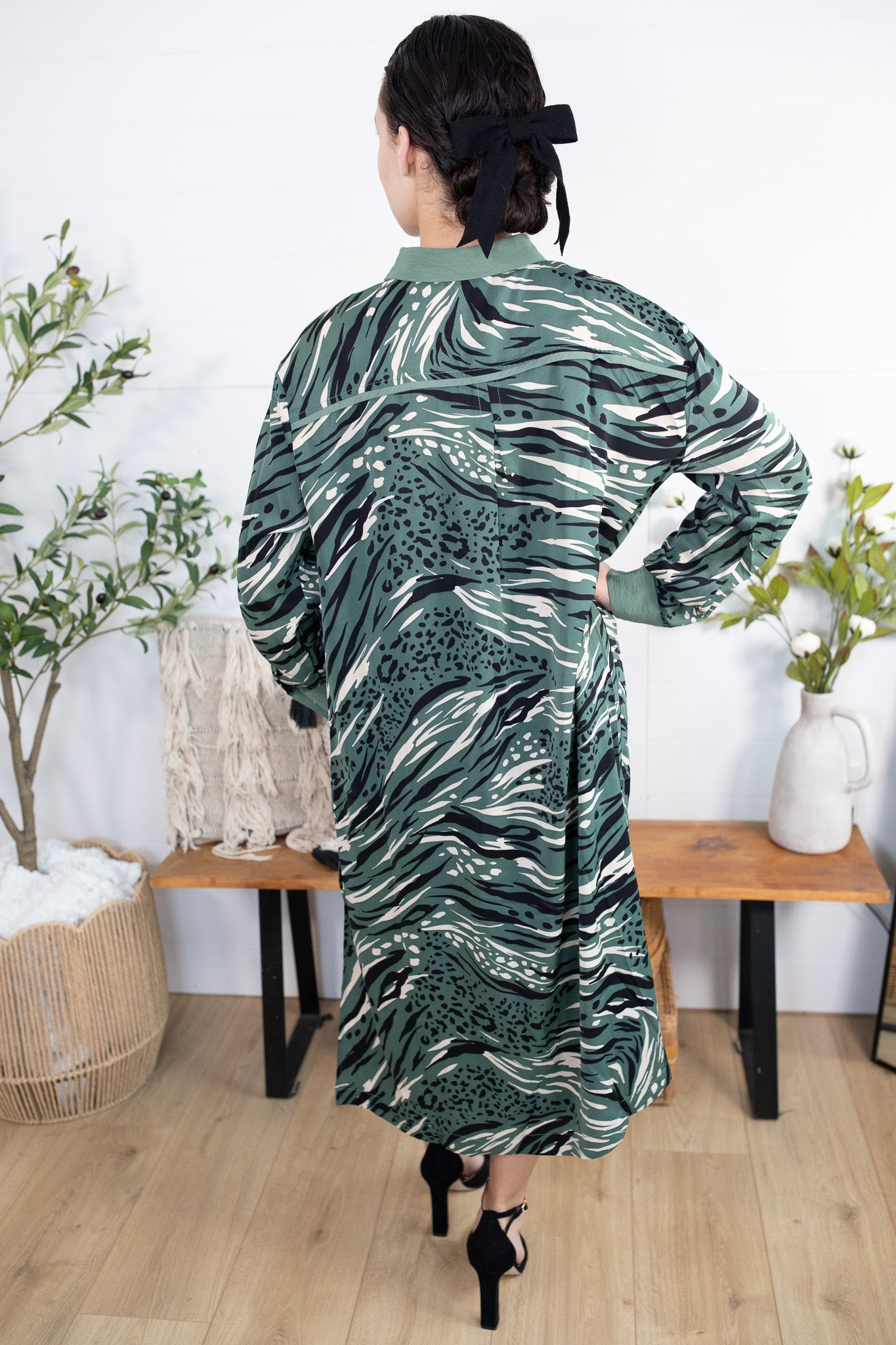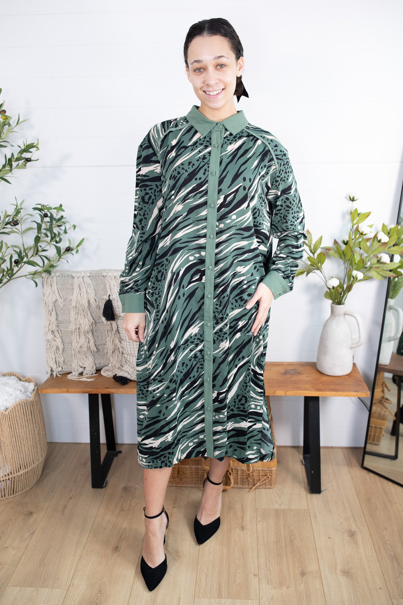 Meet your new favorite throw-on-and-go dress! Our Animal Print Shirt Dress features a lightweight, breezy feel with a modest collar neckline and functional buttons down the front for easy styling. The sleeves can be worn long or rolled up and secured with the attached button tab—perfect for everyday life.