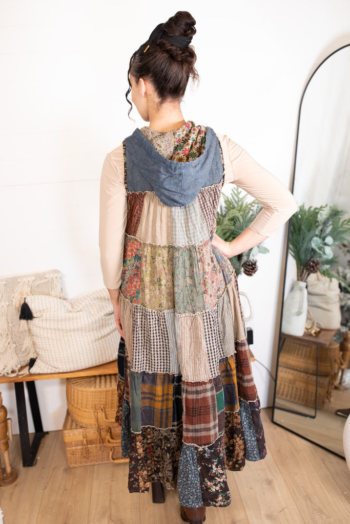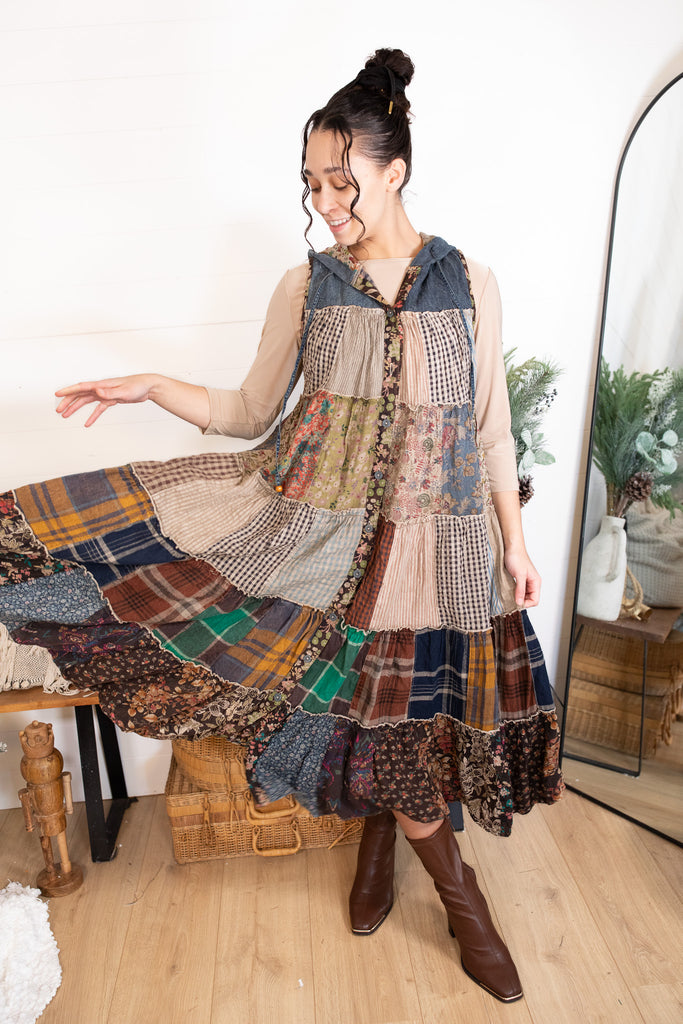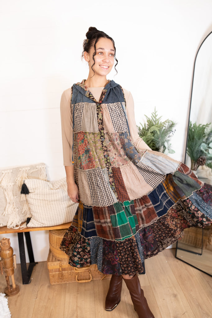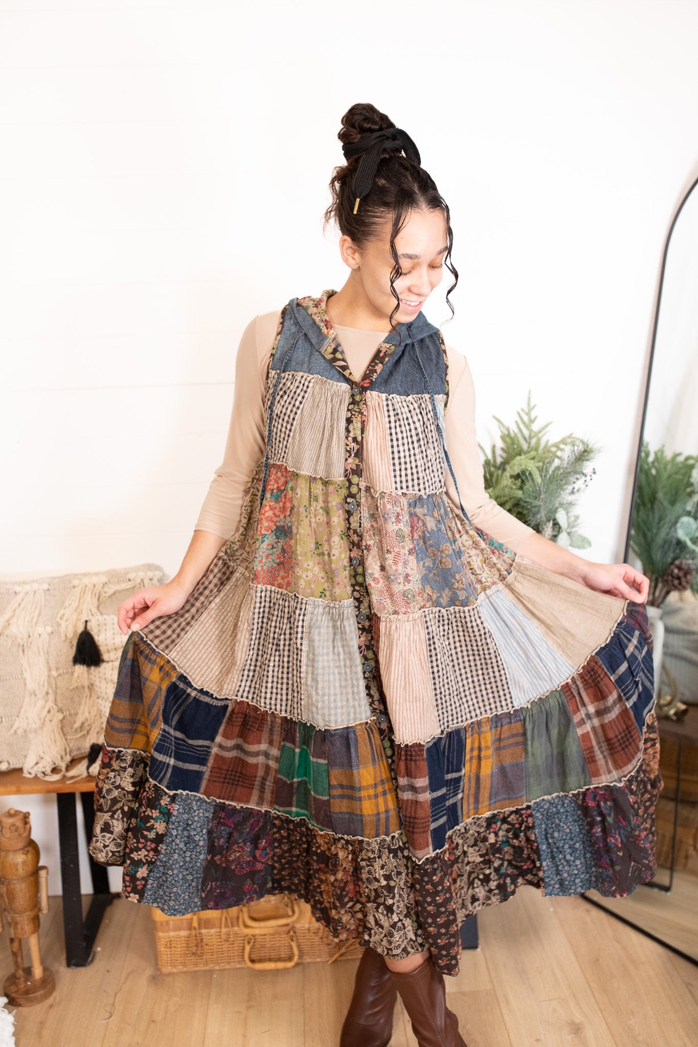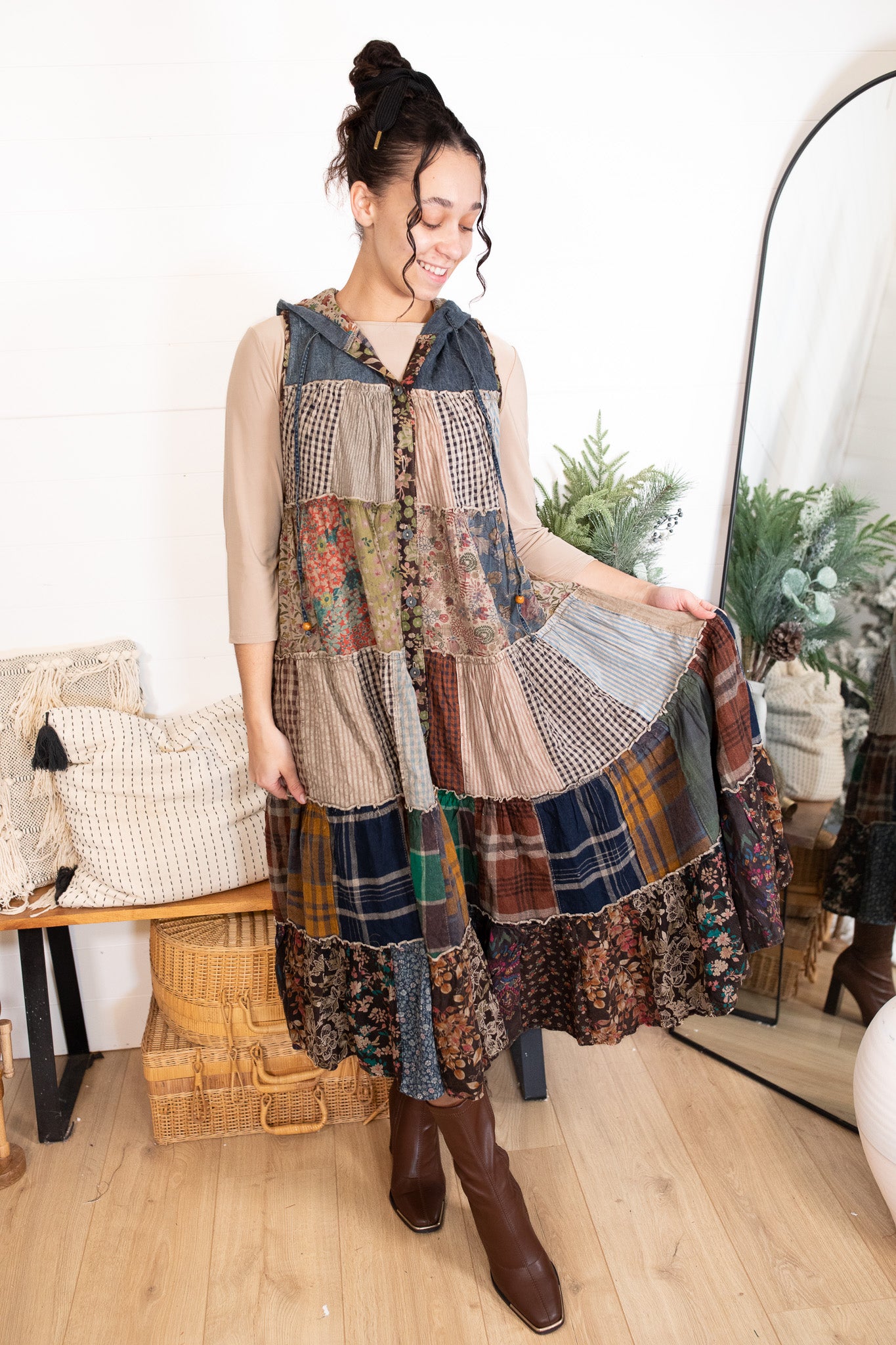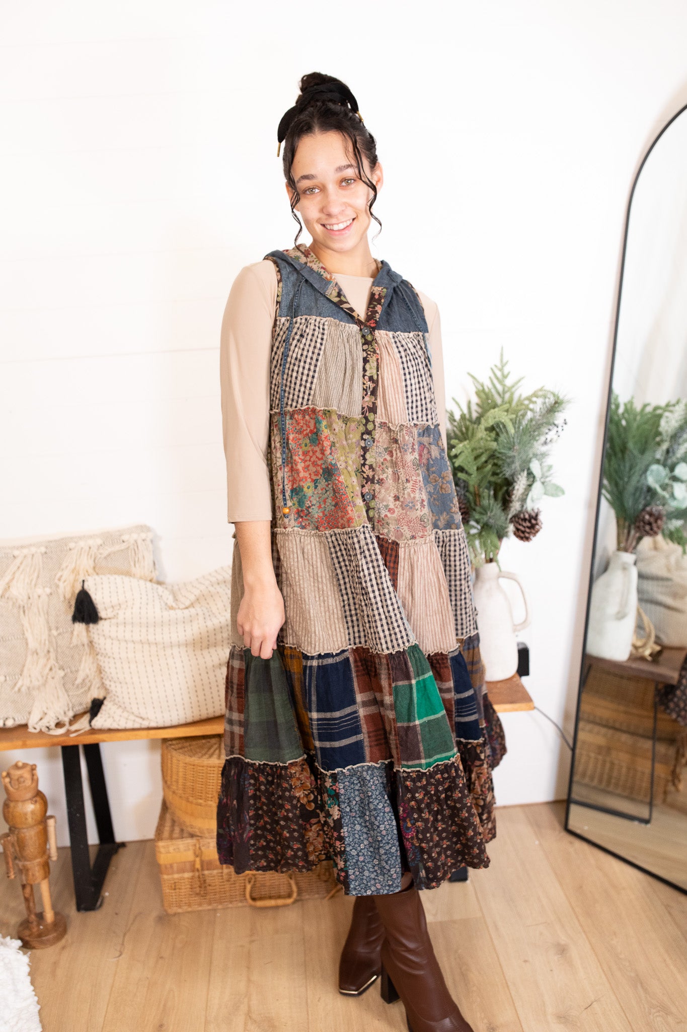 A statement piece that captures true boho charm — our Autumn Patchwork Duster is a sleeveless, hooded layering dress crafted from a soft cotton-rayon blend. Each piece is uniquely designed with a mix of vintage-inspired patchwork patterns, offering one-of-a-kind character and texture. The button-down front and flowy silhouette make it perfect for layering through the fall and winter seasons. Light yet warm, this cozy duster combines effortless comfort with timeless style. Model is wearing with a layering top not included.