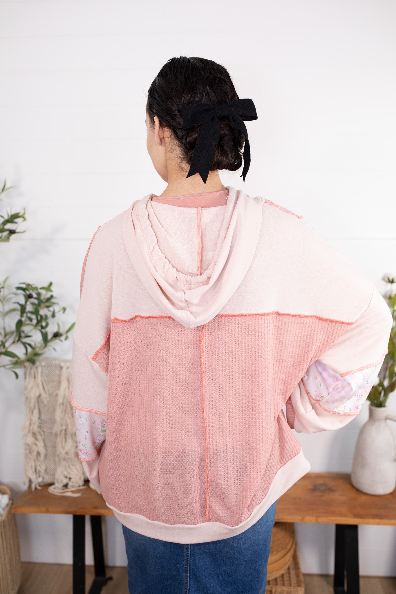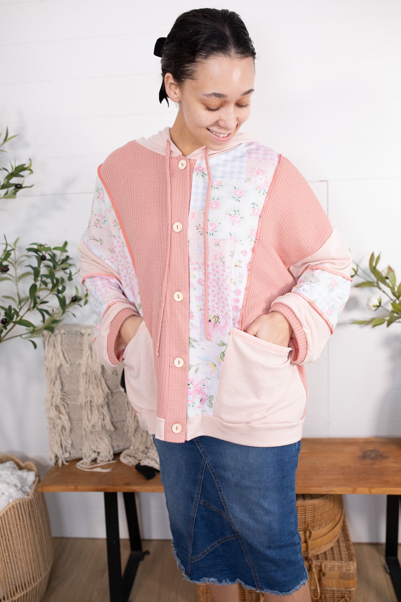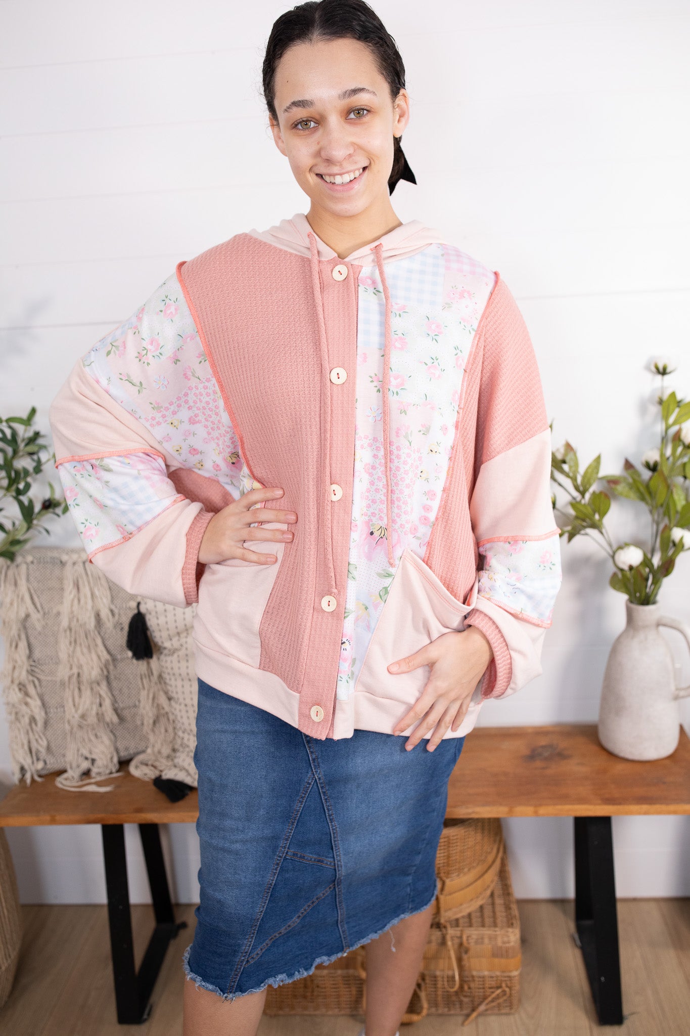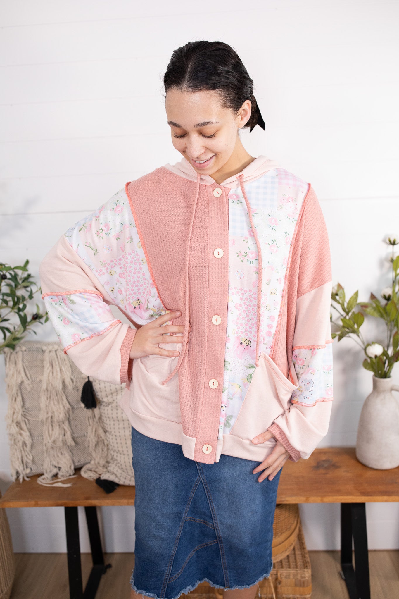 Meet your new favorite throw-on-and-go layer! This oversized hooded button up jacket/top is the perfect lightweight piece for transitioning into spring. Designed with a mix of soft textures and dreamy patchwork details, it gives you that cozy feel without being too heavy. Style it open like a jacket or buttoned up as a topโeither way itโs a must-have for everyday wear!