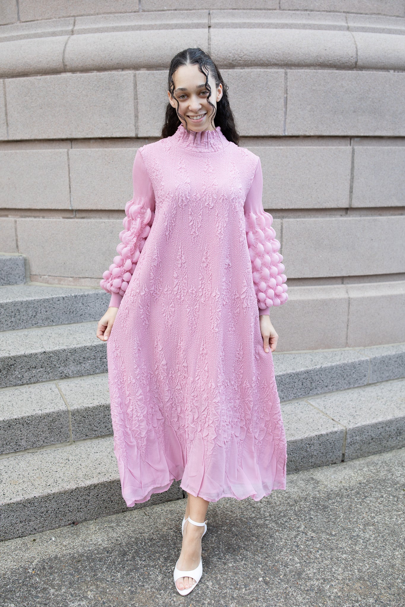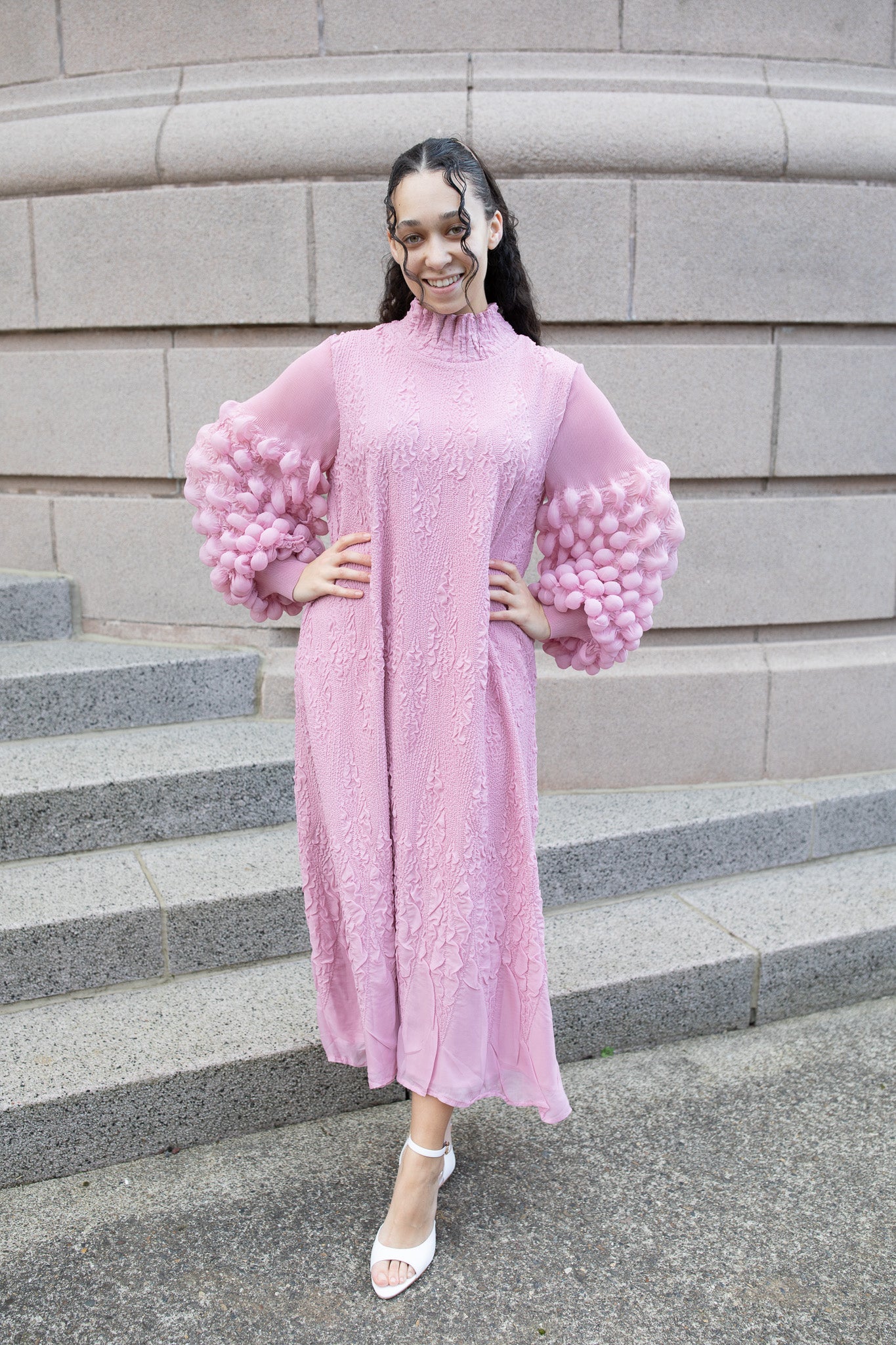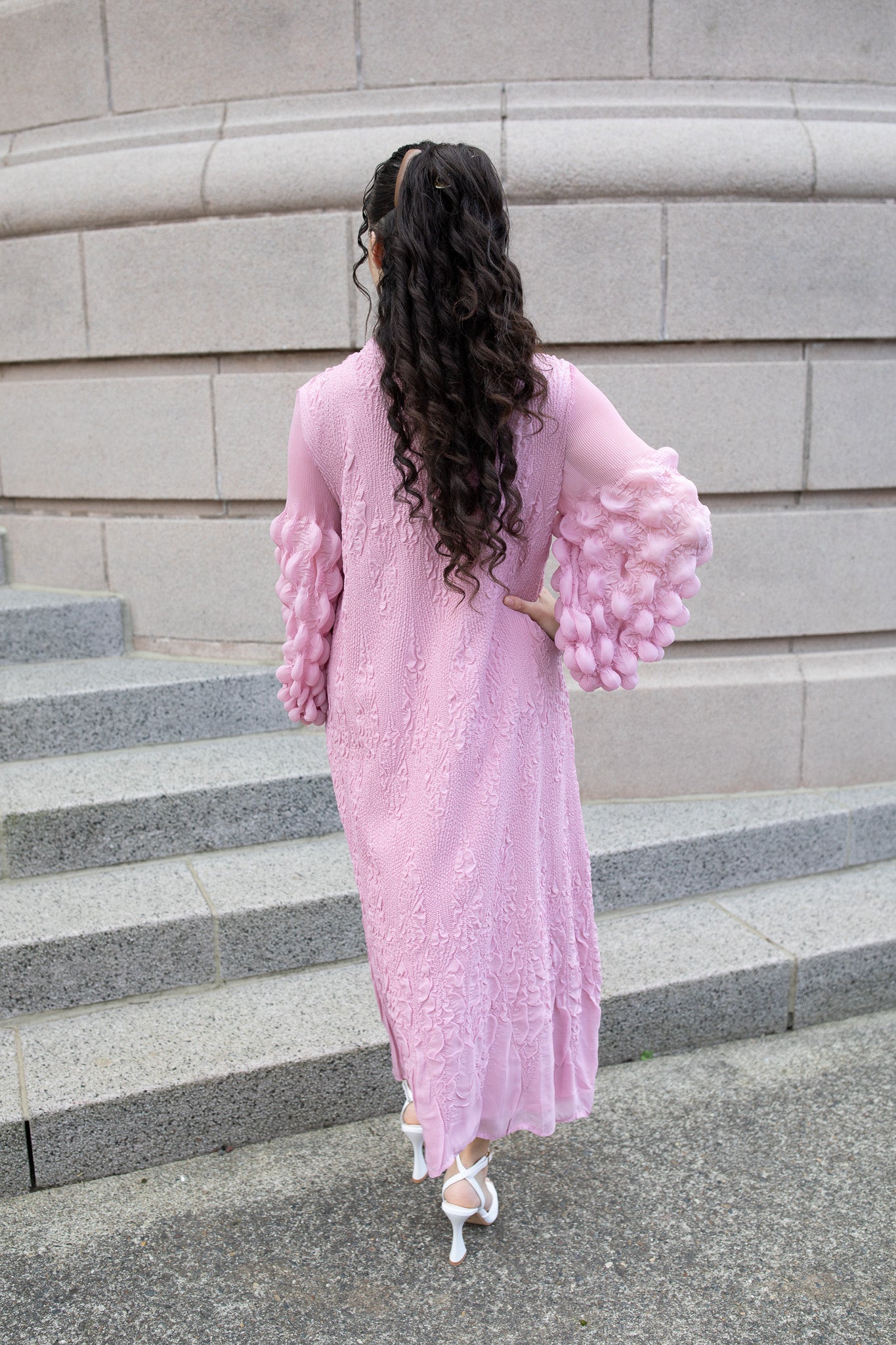 Unleash your inner elegance with the She Walks With Dignity Dress! This unique dress features a lined body, crinkled embroidered fabric, and puffy pleated sleeves for a touch of sophistication. Its lightweight material offers some stretch for a comfortable fit. Limited stock available, so make it your new favorite dress now! Please Note: Sleeves are not lined and have some sheerness to them.ย
