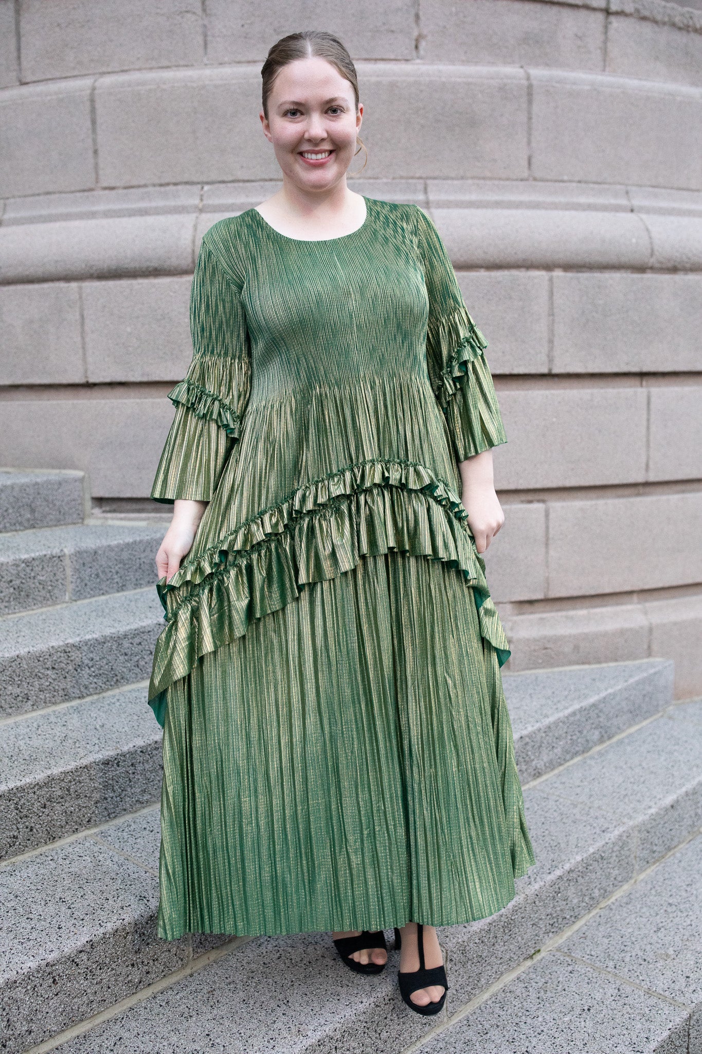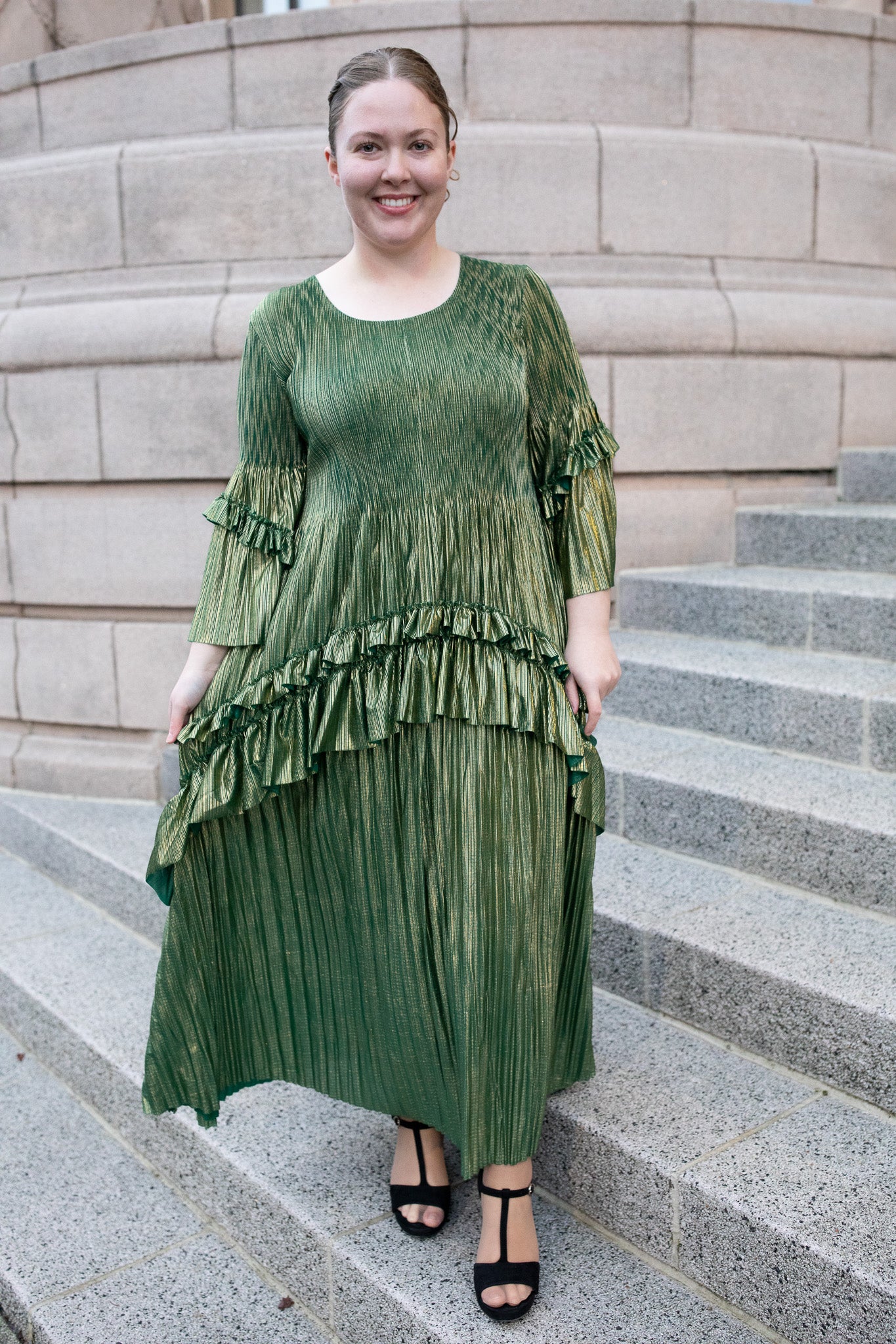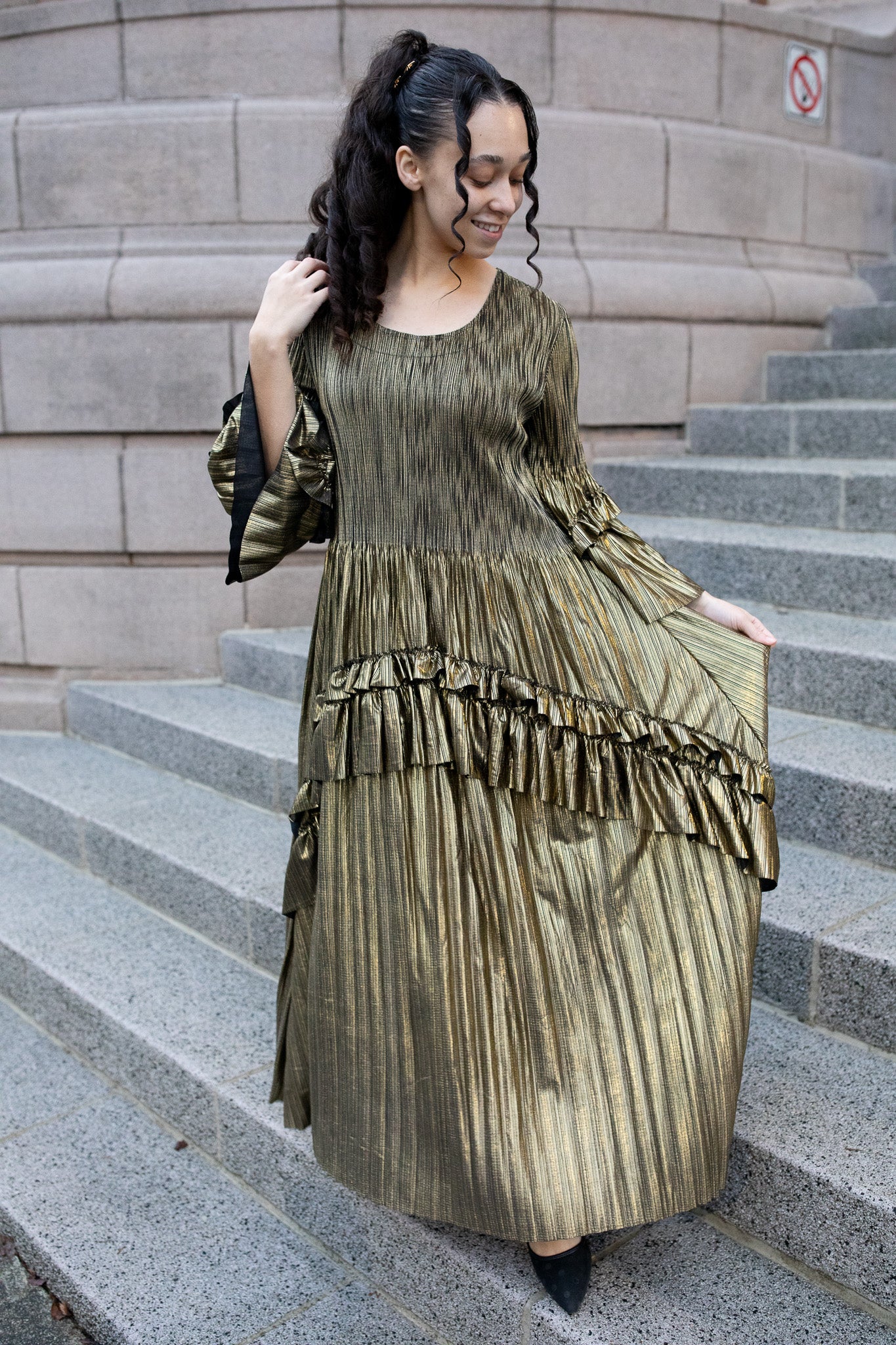 Make a grand entrance in our Shimmering NIghts Dress, a one-size showstopper crafted in a stunning gold-infused fabric that catches the light beautifully. This elegant piece features a pleated skirt, soft stretch throughout.
