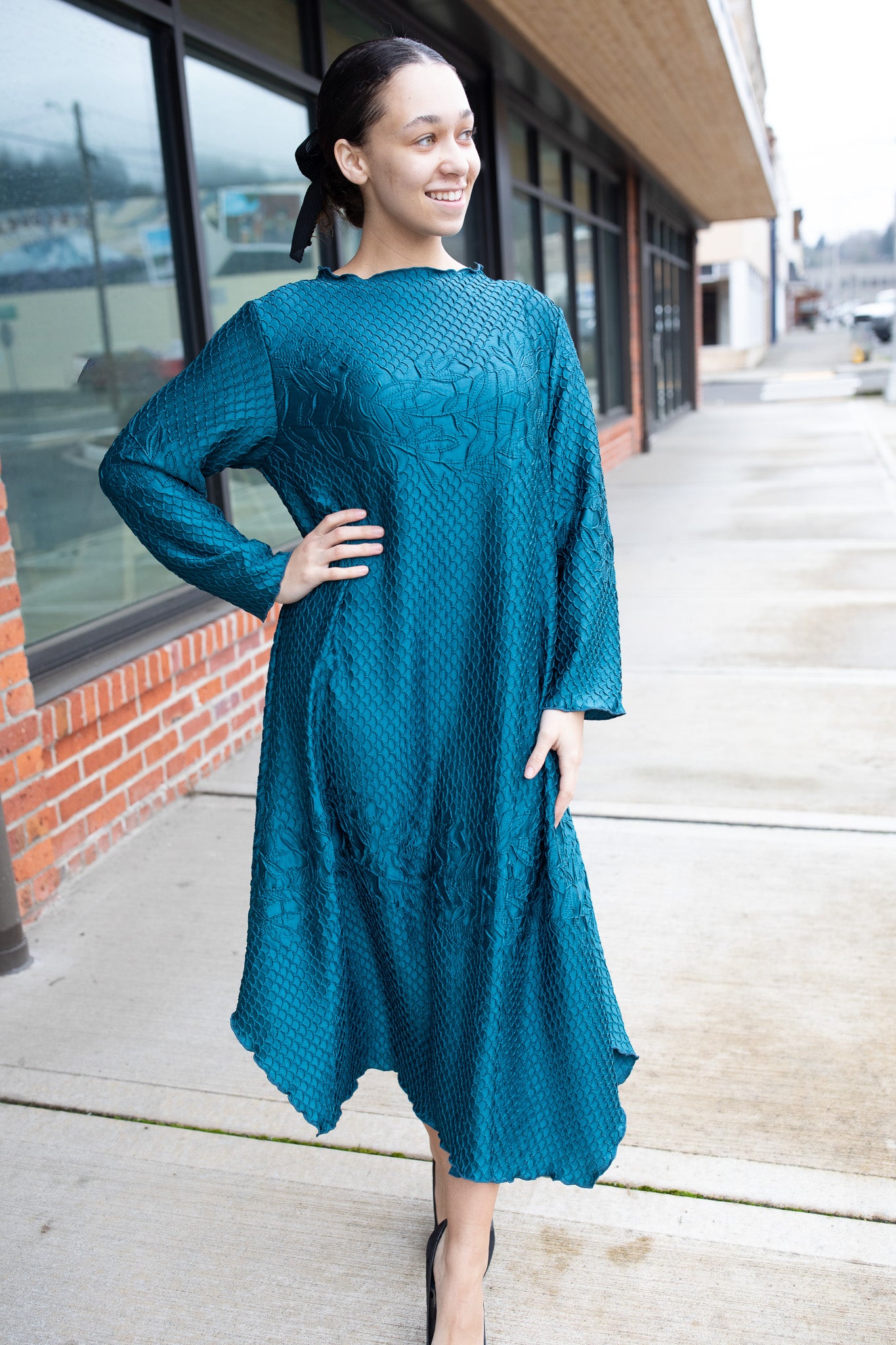 This fabric has little to no stretch, so we highly recommend checking measurements for the best fit. Finished with a unique hem that creates a flattering drape and movement, this dress is a standout for every season.