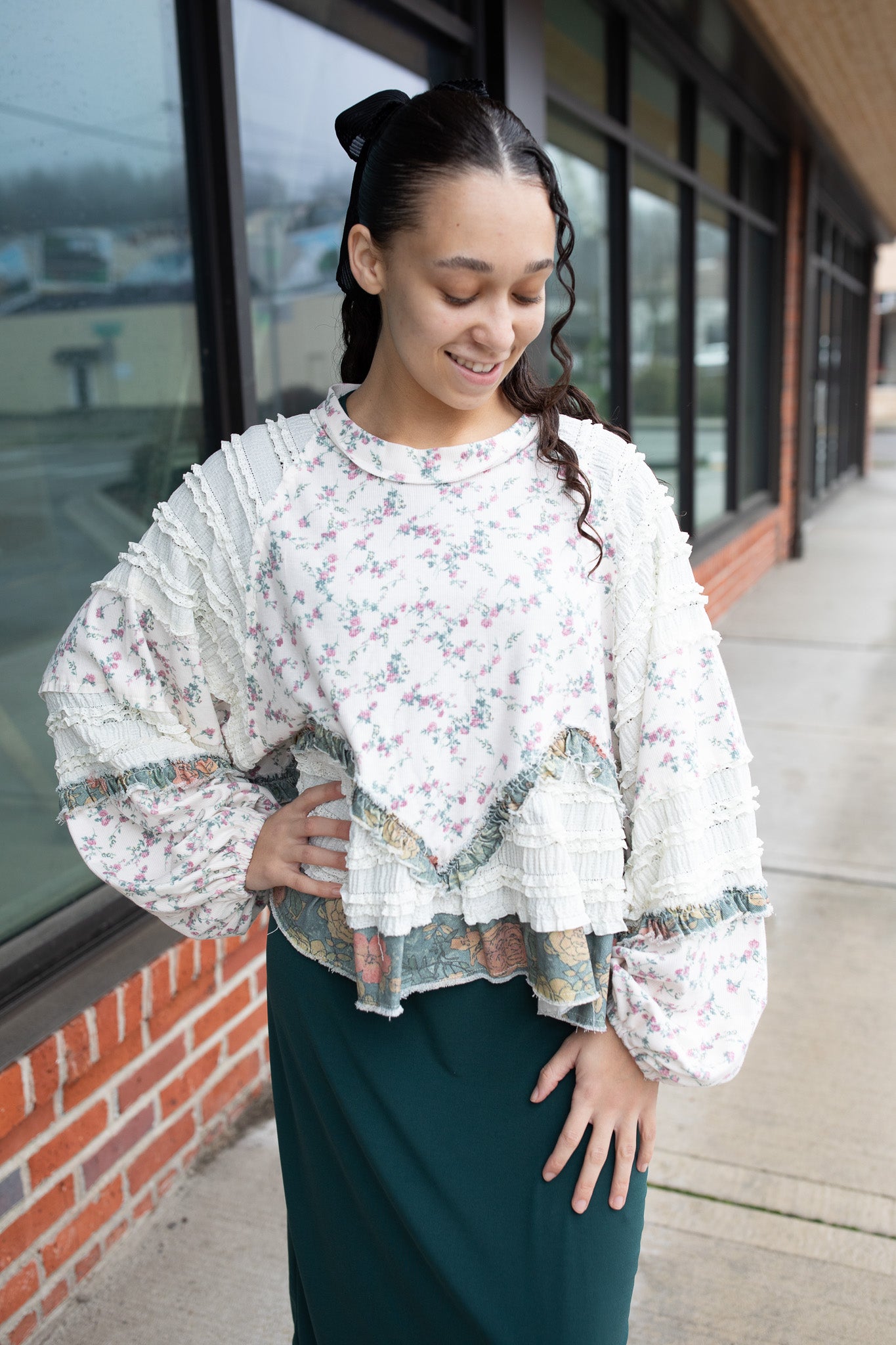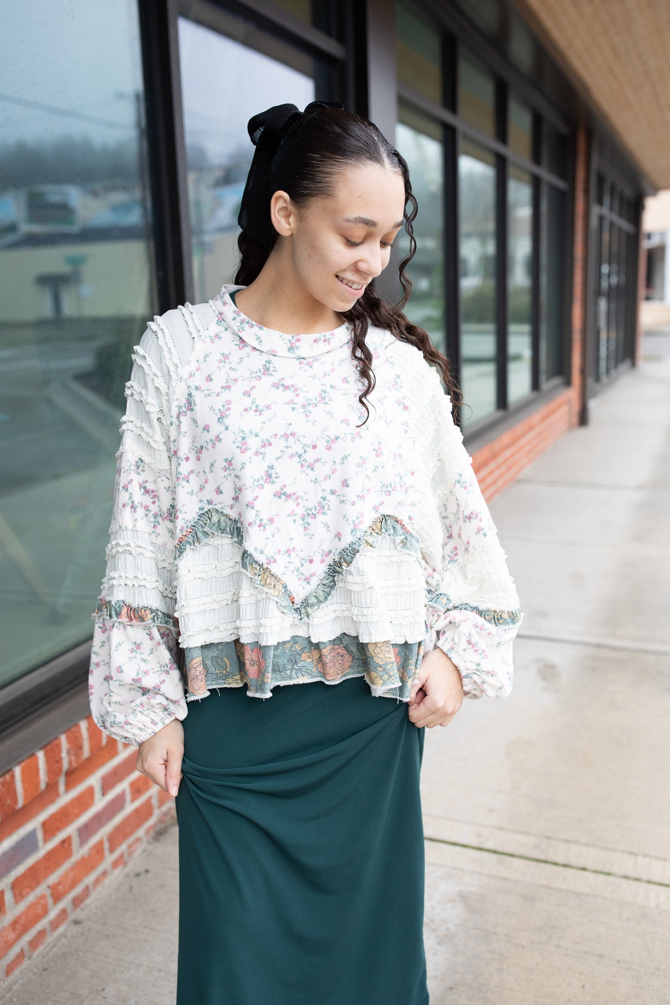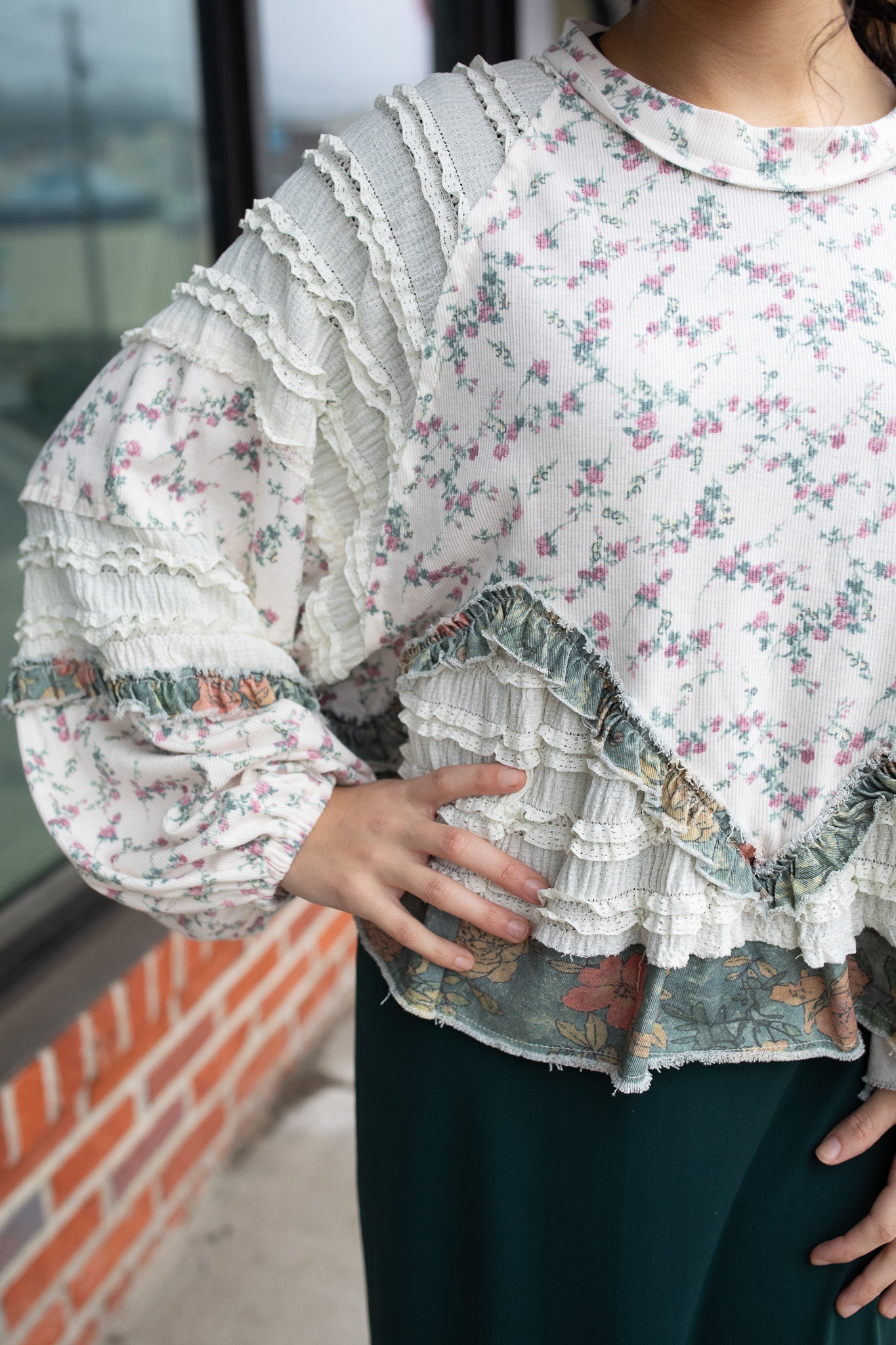 Meet your new statement piece— The Vintage Meadow Top, a beautifully unique blend of florals, textures, and feminine charm. This top features a soft ribbed knit base sprinkled with delicate floral prints, layered with rows of lace-trimmed ruffles for the dreamiest cottage-inspired look.