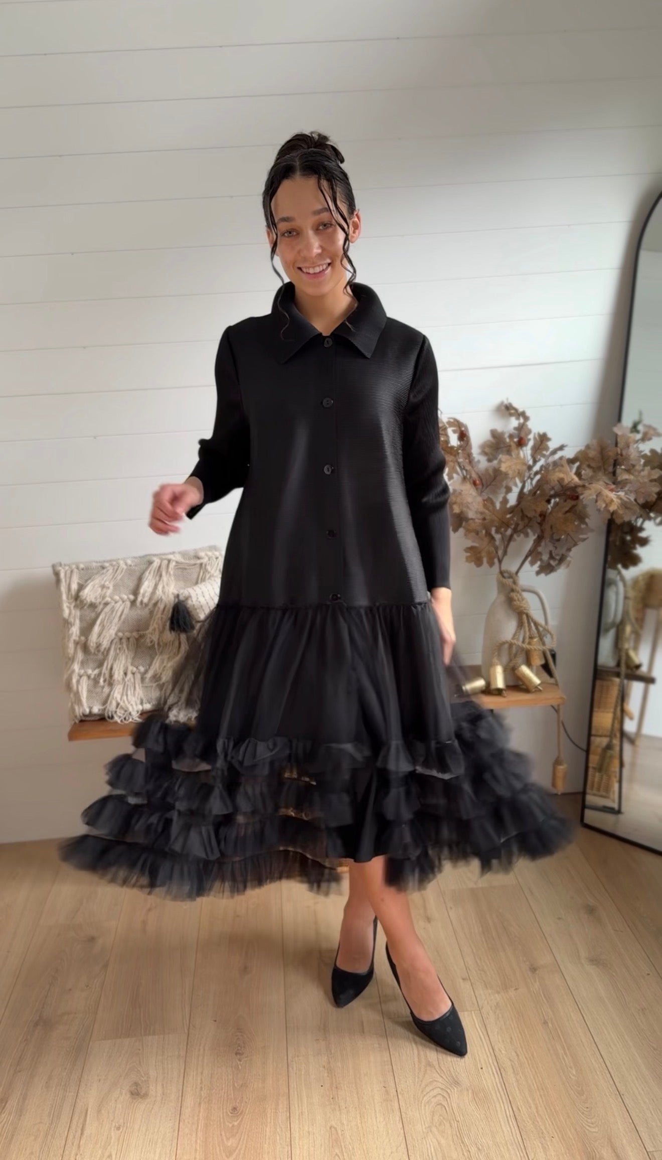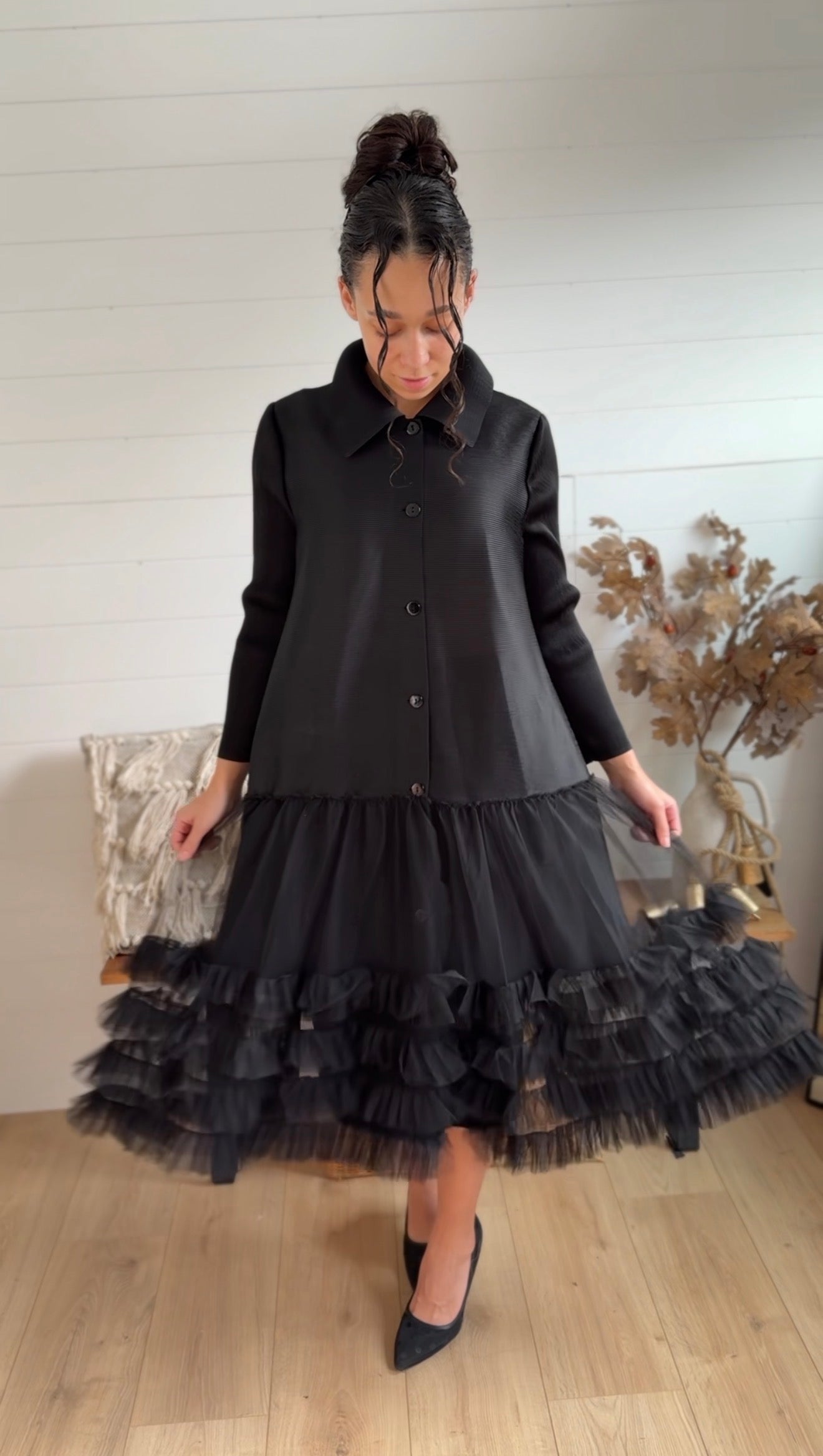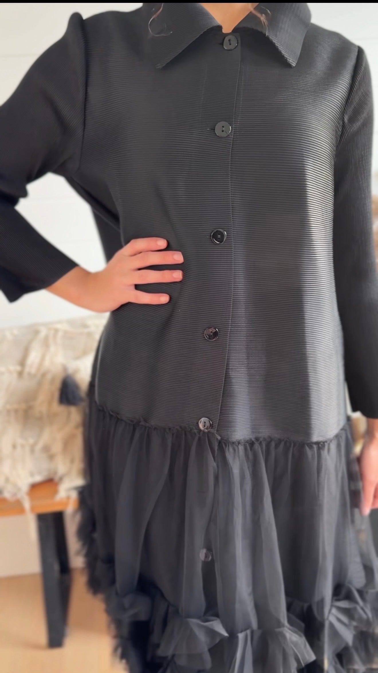 Elegant and unique, our Tulle Jacket Dress is a true statement piece. Designed with a classic button-down front, collared neckline, and tiers of soft tulle that create stunning volume and movement. This one-size style is meant to be layered โ€” the sheer tulle bottom makes it perfect for pairing over your favorite slip dress or layering set. Check measurements to ensure your ideal fit.