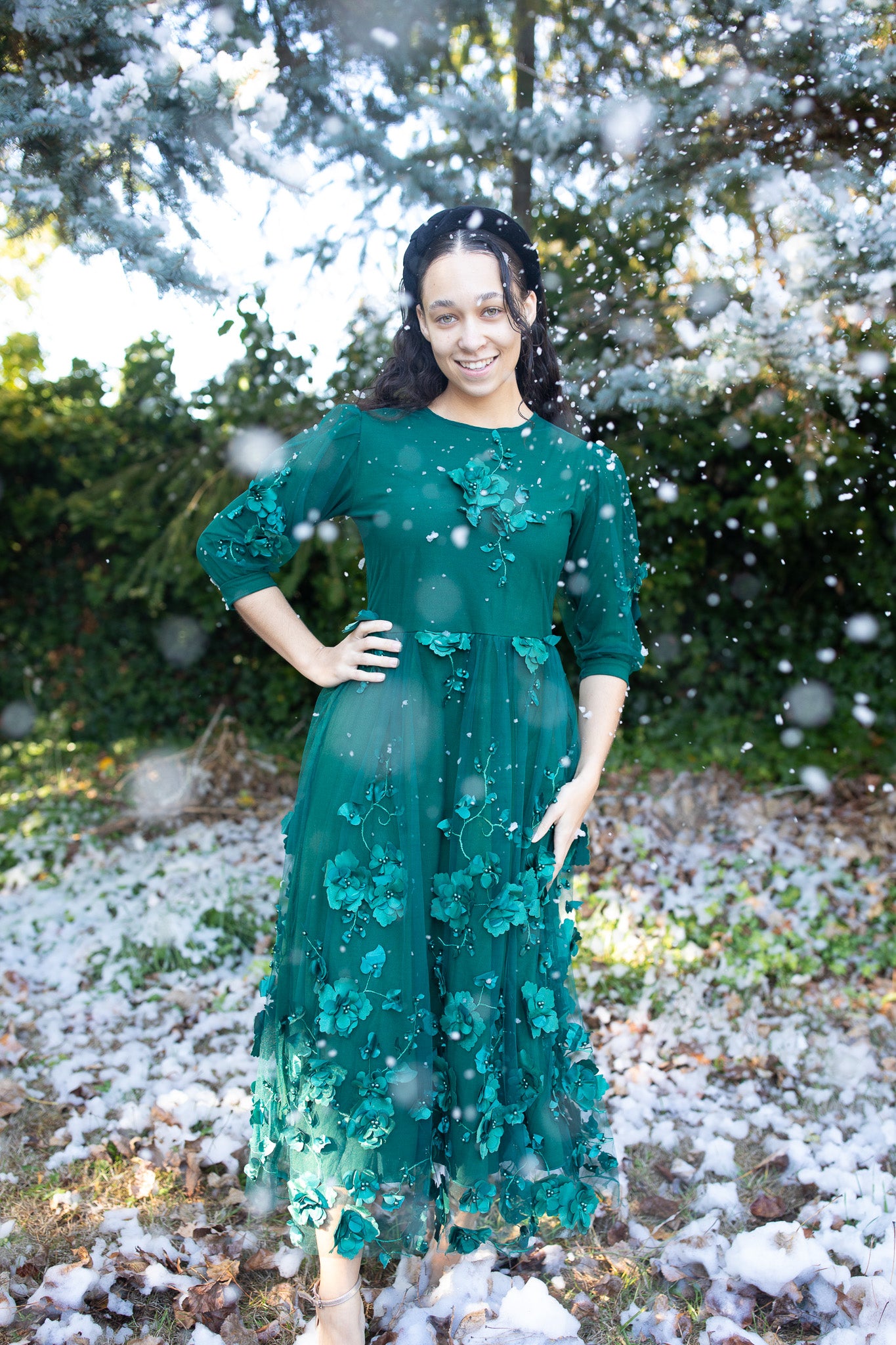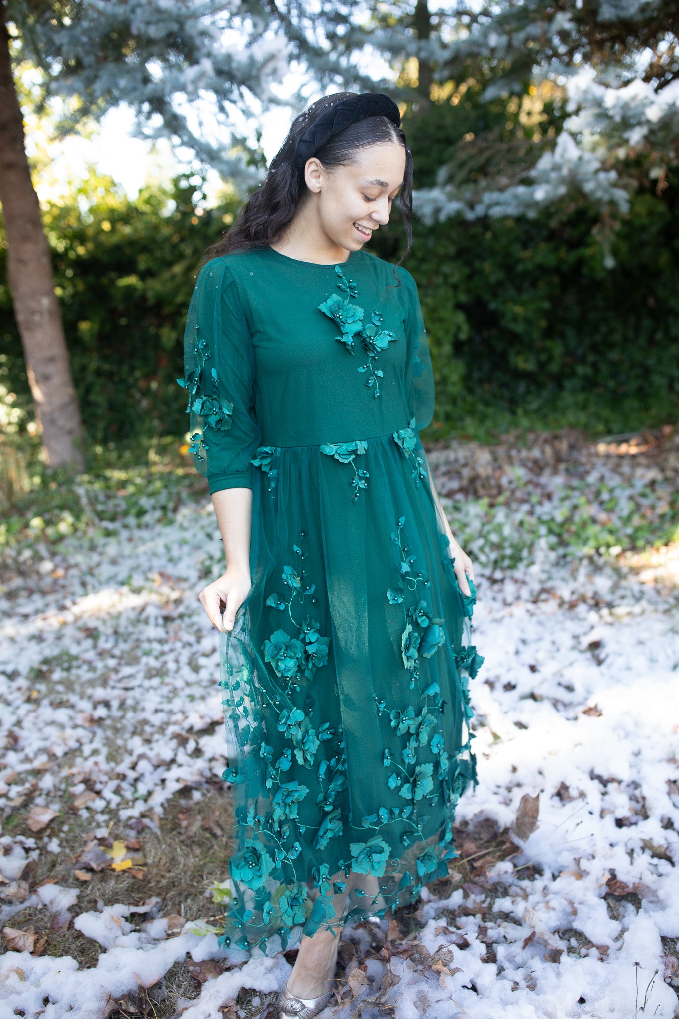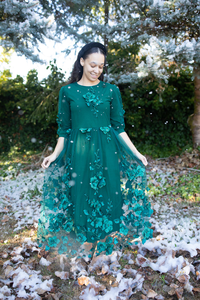 Step into the magic of the season with The Evergreen Petal Dress. This stunning Christmas-inspired piece features intricate 3D floral appliqués that create a romantic, garden-like texture across soft tulle. Fully lined for comfort, it offers a graceful flow that’s perfect for holiday gatherings, Christmas photos, and special celebrations.