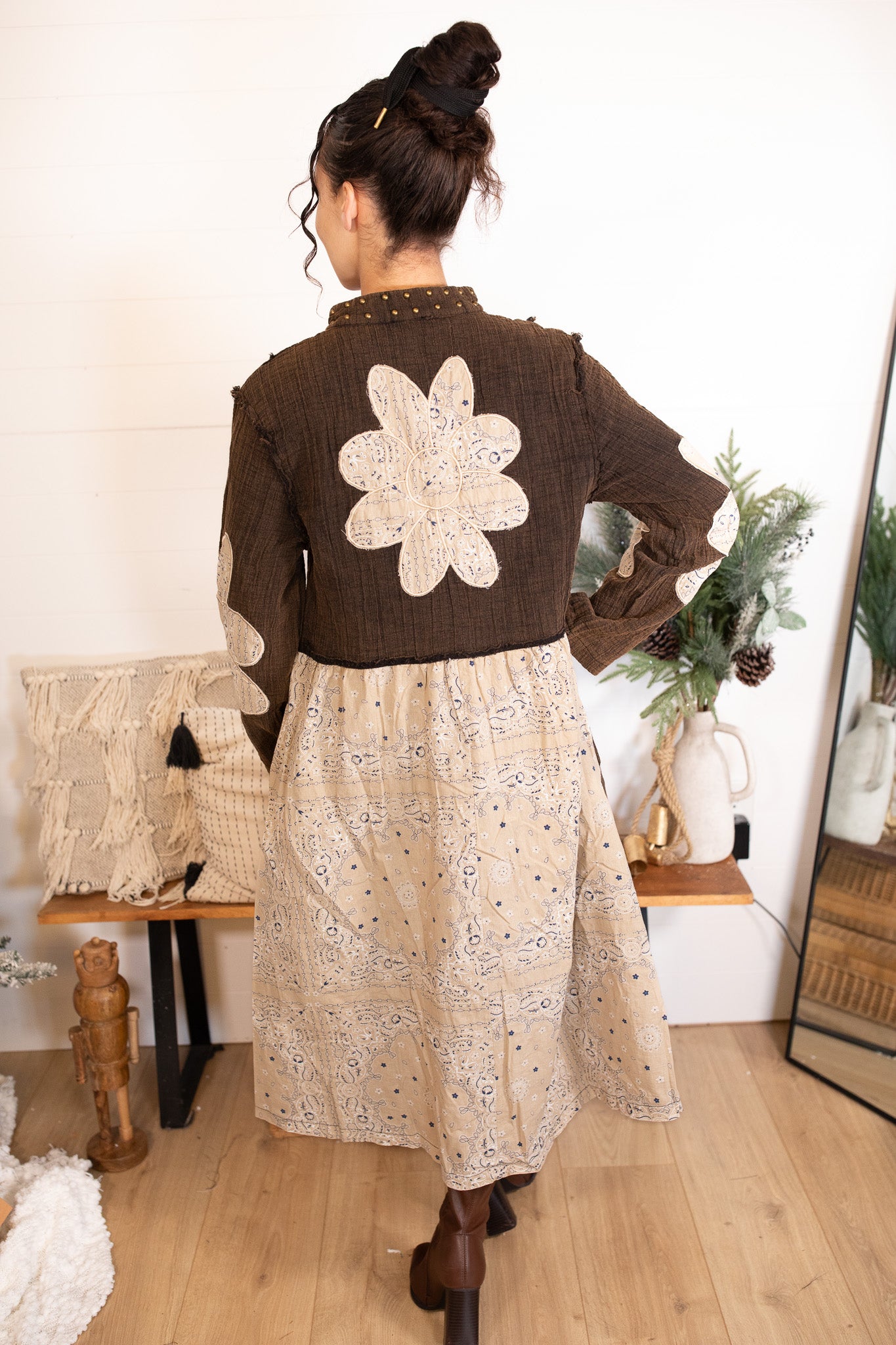 Designed with a relaxed, flowy silhouette, it layers beautifully over dresses or skirts for an effortlessly styled look. The lightweight feel makes it perfect for transitional seasons, while the detailed embroidery and unique patch placement make every jacket feel special and one-of-a-kind.