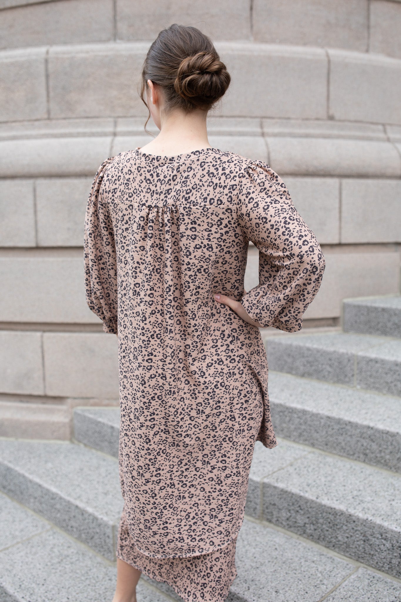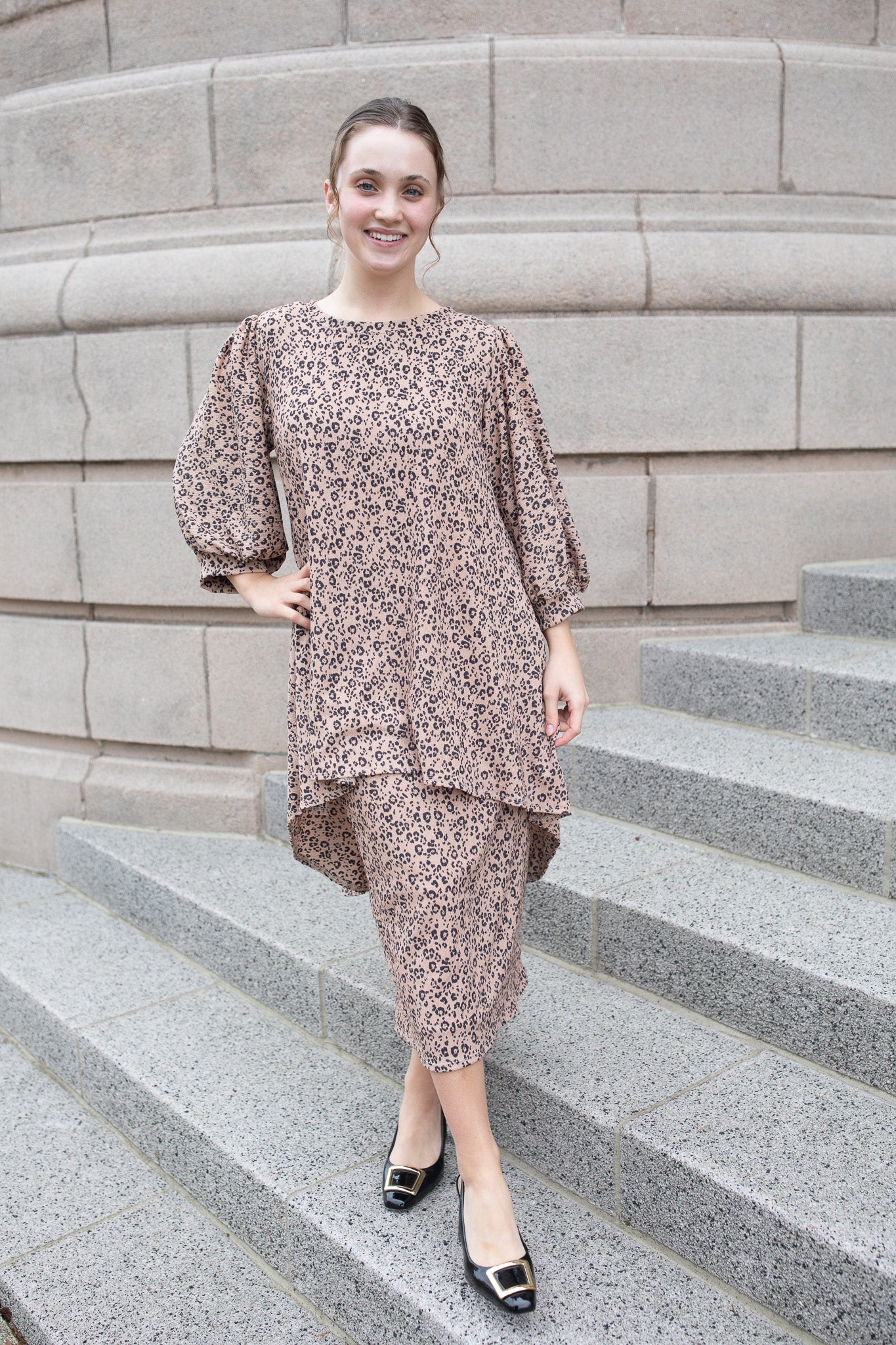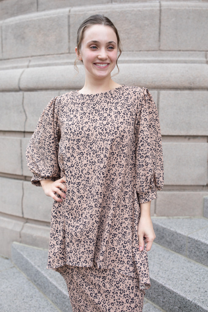 Our popular Brooklynn silhouette is back in a gorgeous new print. This top features a soft, slightly textured fabric with the perfect amount of stretch for all-day comfort. Fully lined for a smooth, modest fit and finished with a puffy sleeve and high-low hem that adds effortless movement. Pair it with our matching Brooklynn Leopard Skirt (sold separately) for a coordinated look, or style it on its own for a chic statement.