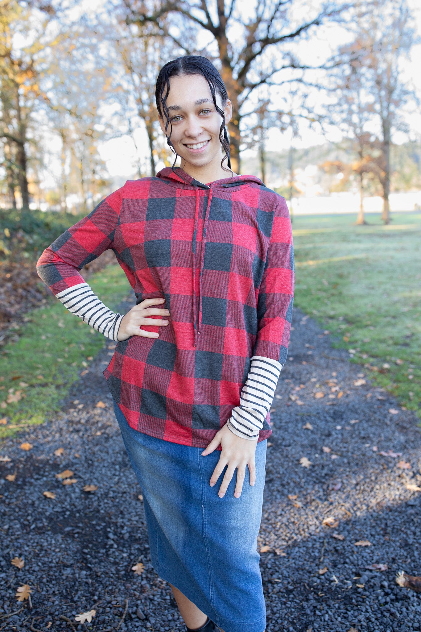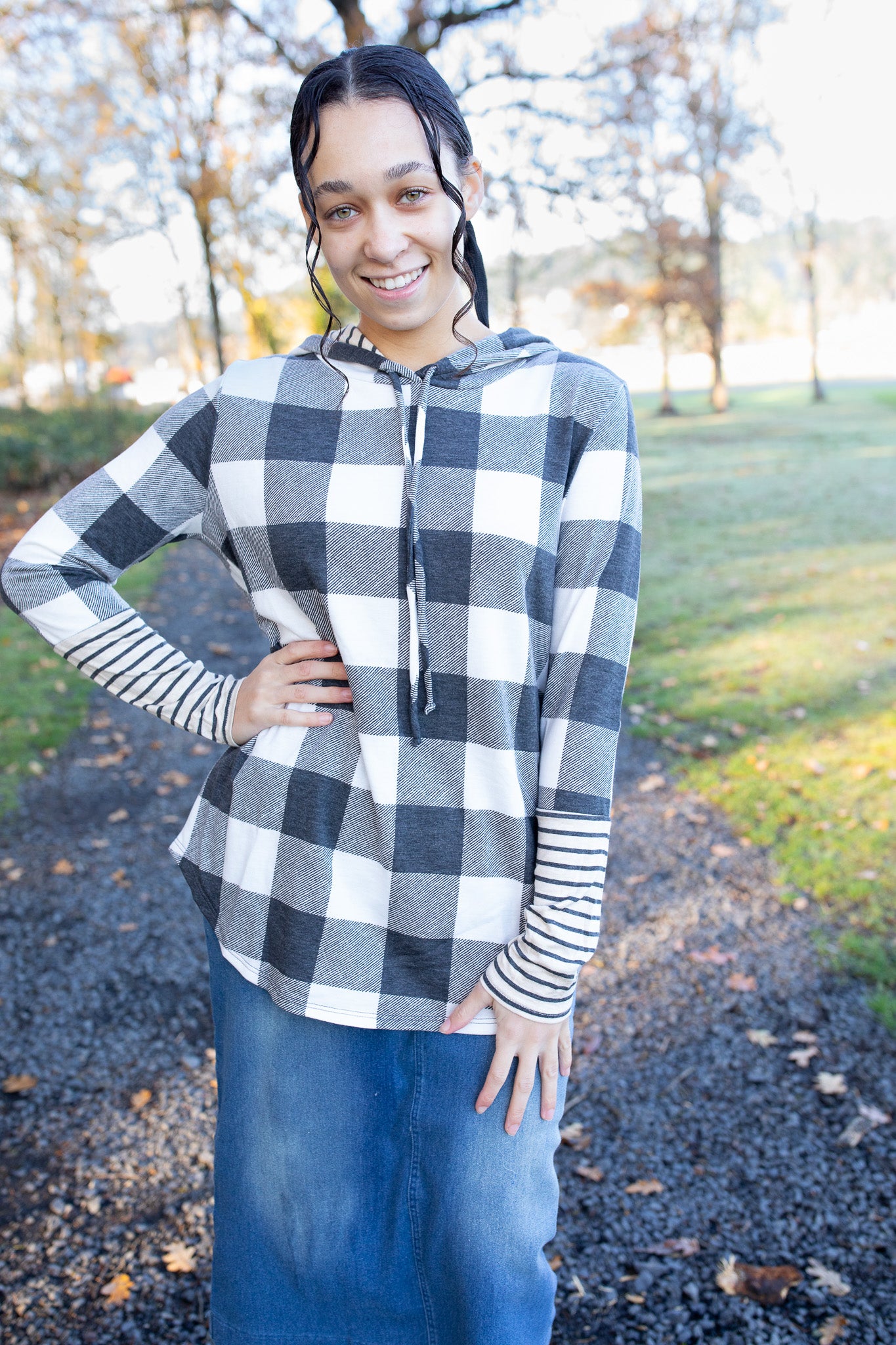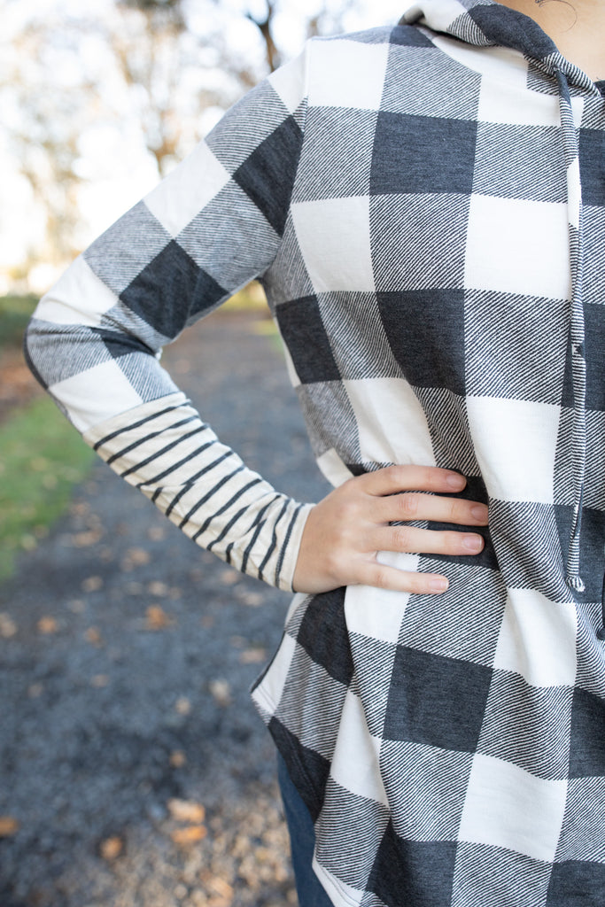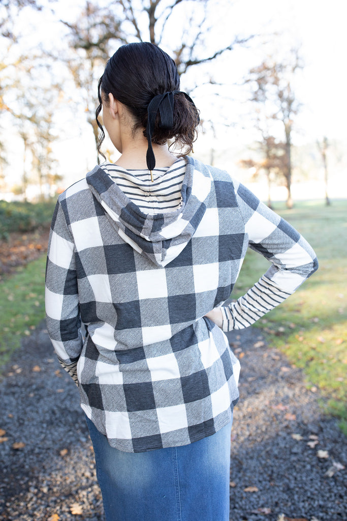 A cozy favorite you’ll reach for again and again! This soft buffalo plaid top features a relaxed fit, contrast striped sleeves and hood, and a comfy drawstring neckline. Perfect for layering or wearing on its own for effortless everyday style. Pair it with your favorite denim skirt and boots for the ultimate cozy-chic look!