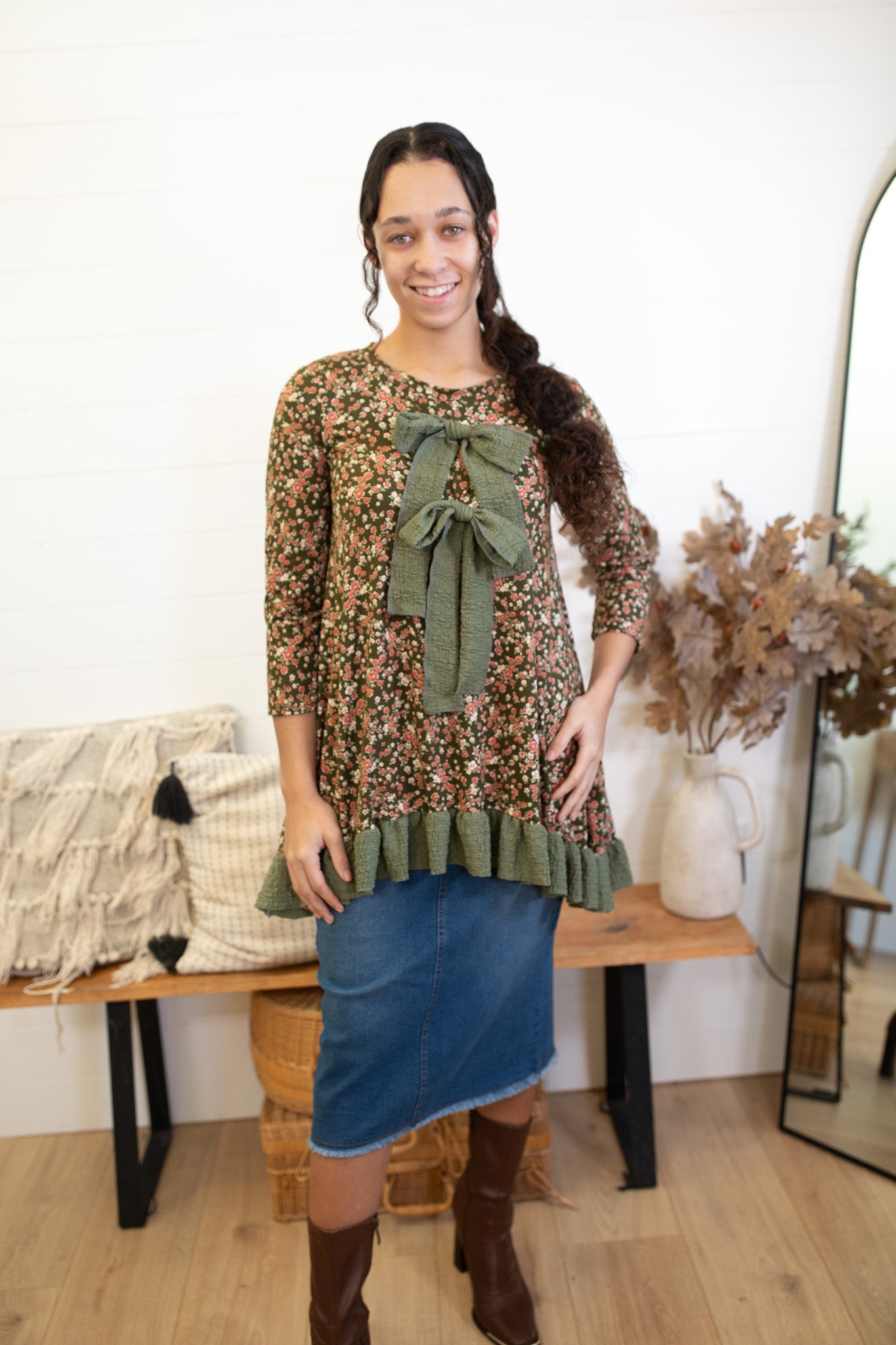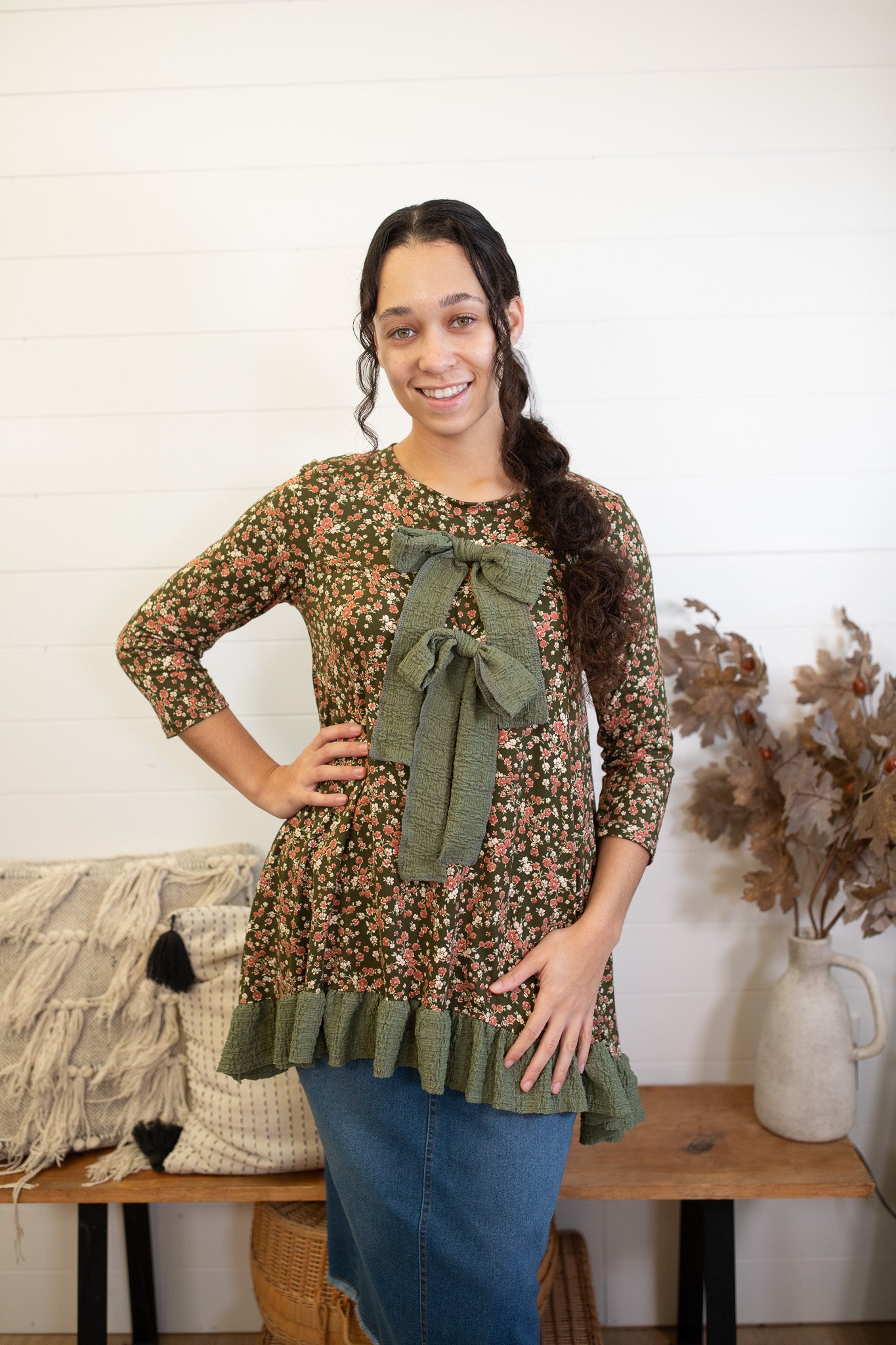 The Olive Floral Bow Top brings cozy charm to your wardrobe with a sweet mix of florals and textured accents. Designed with statement bows, a feminine ruffle hem, and a soft, comfortable fit that drapes beautifully. The 3/4 sleeves make it perfect for layering through the cooler months. Effortless, flattering, and so cute for everyday wear.