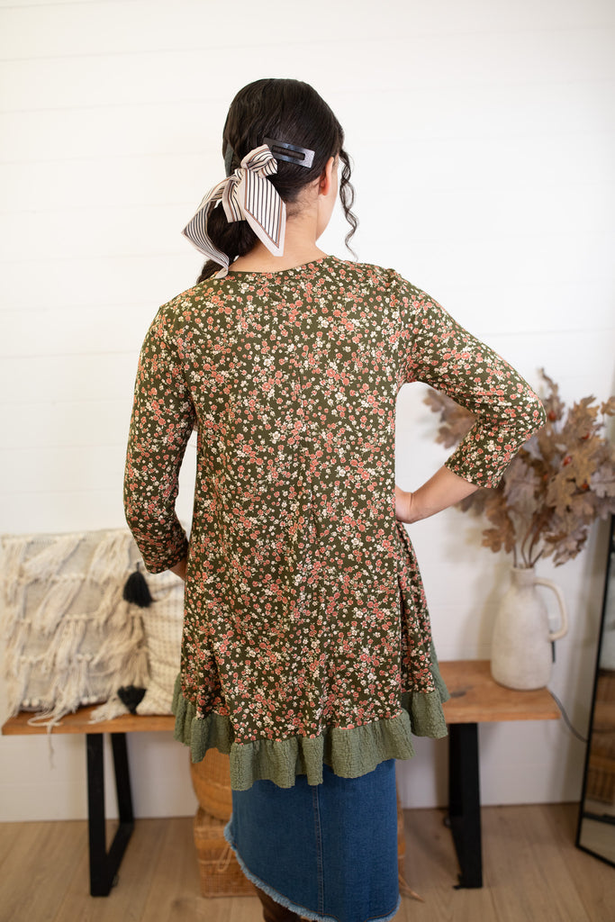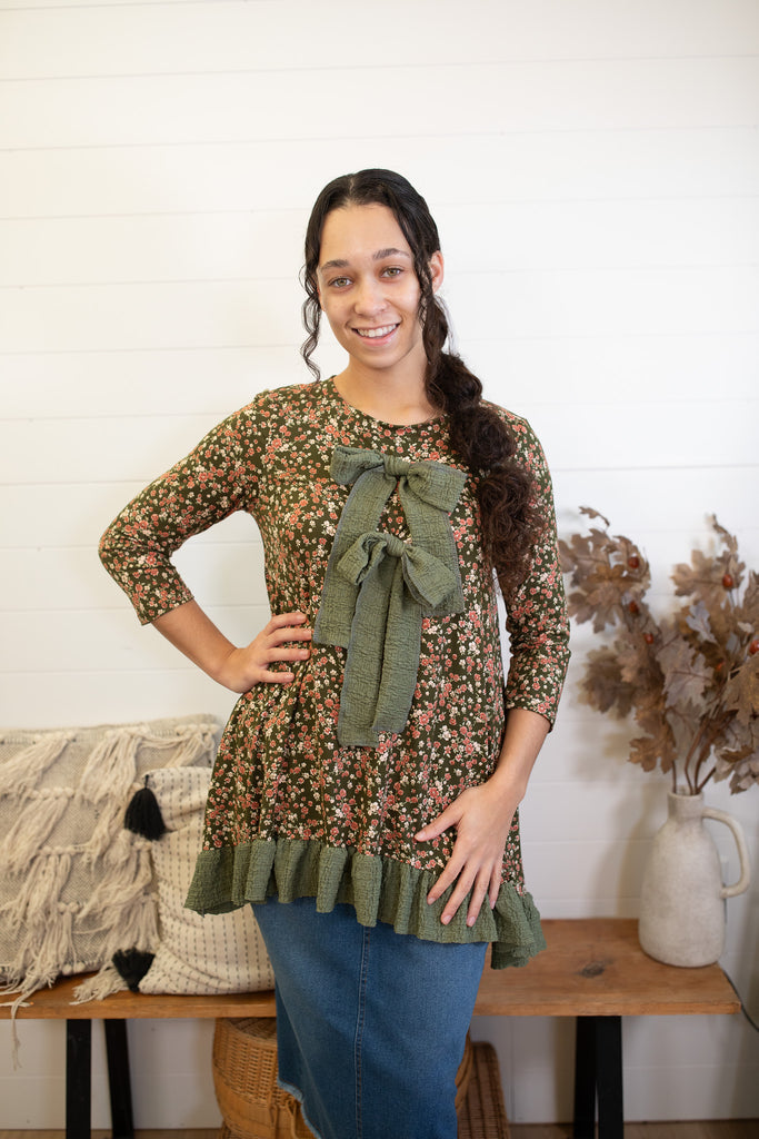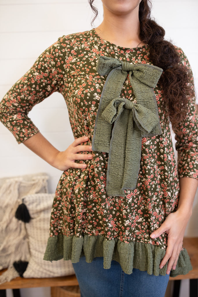 Olive Floral Bow Top