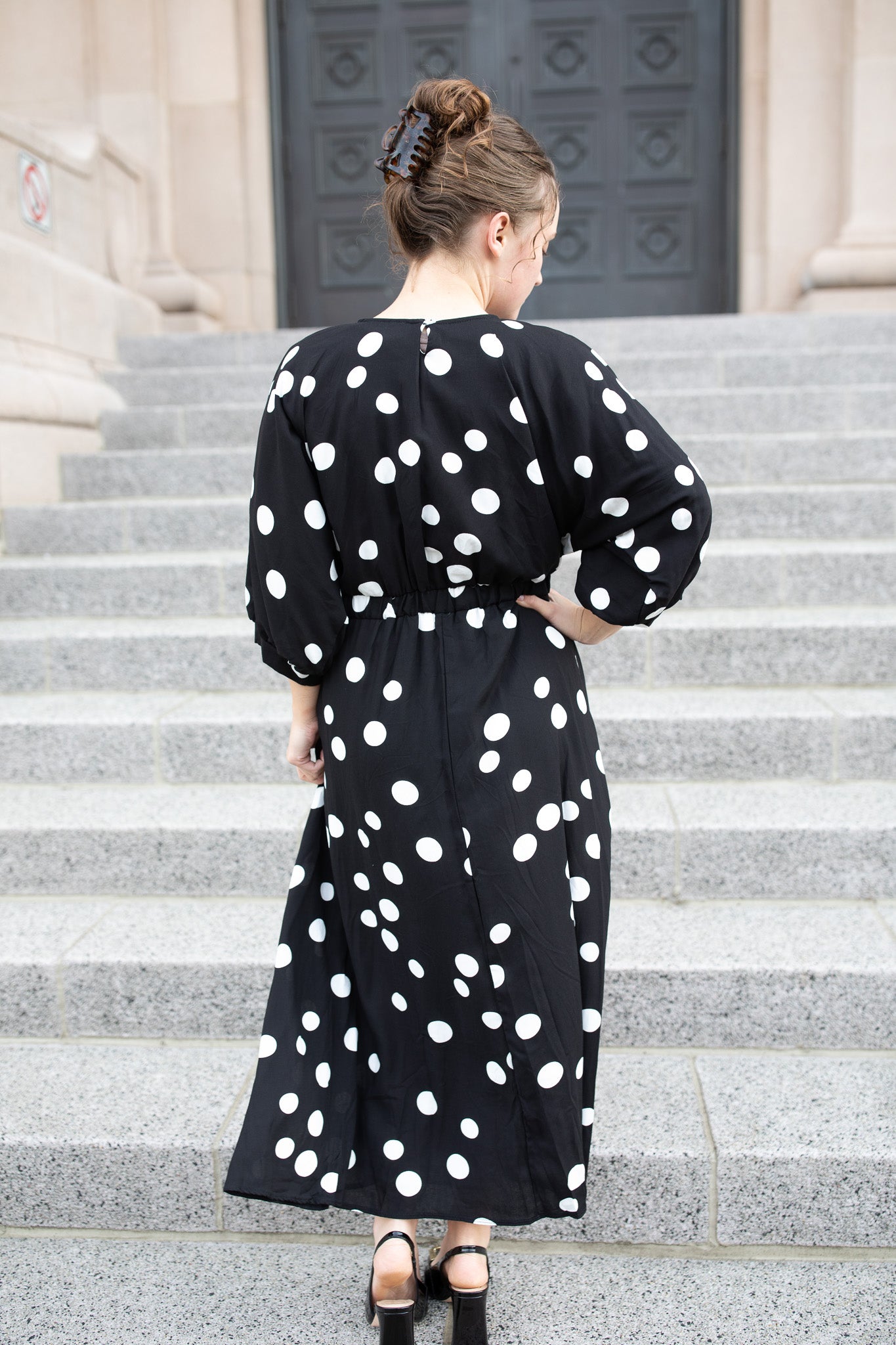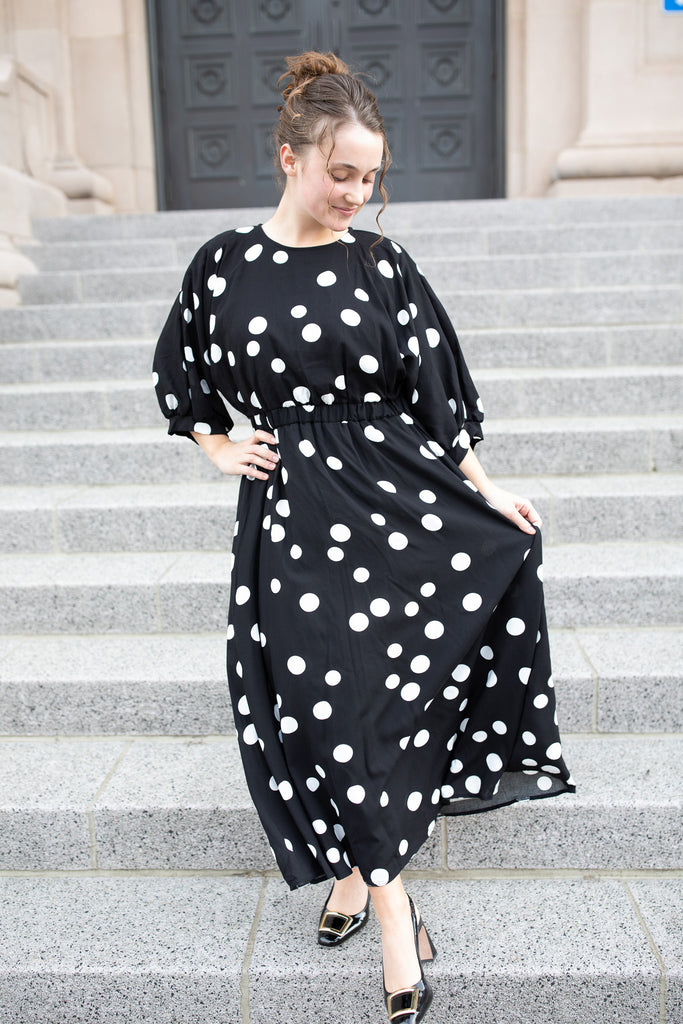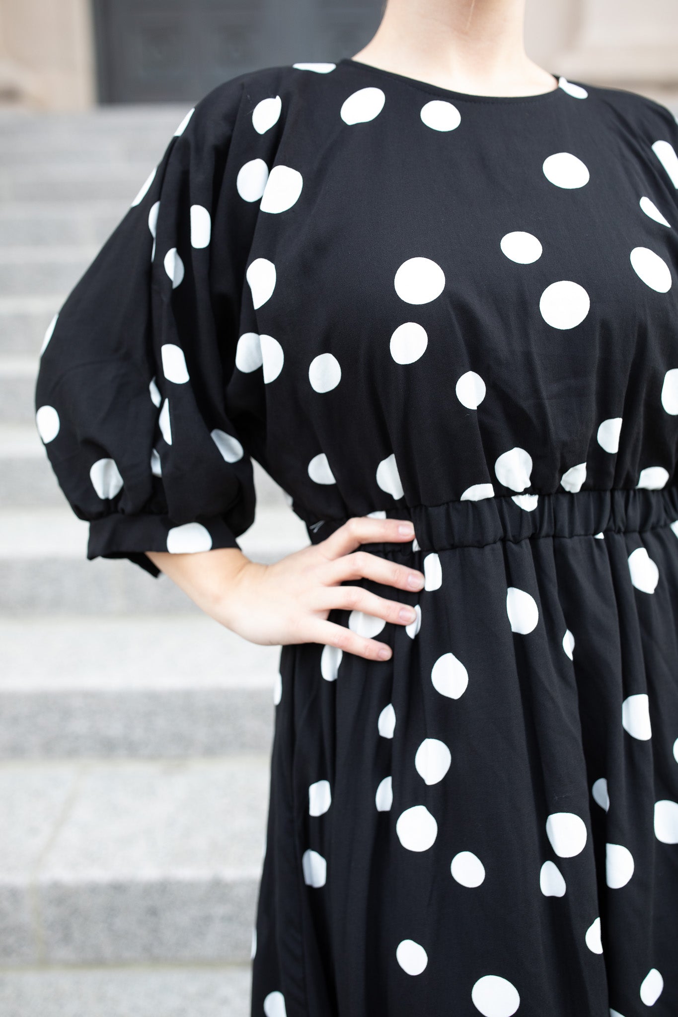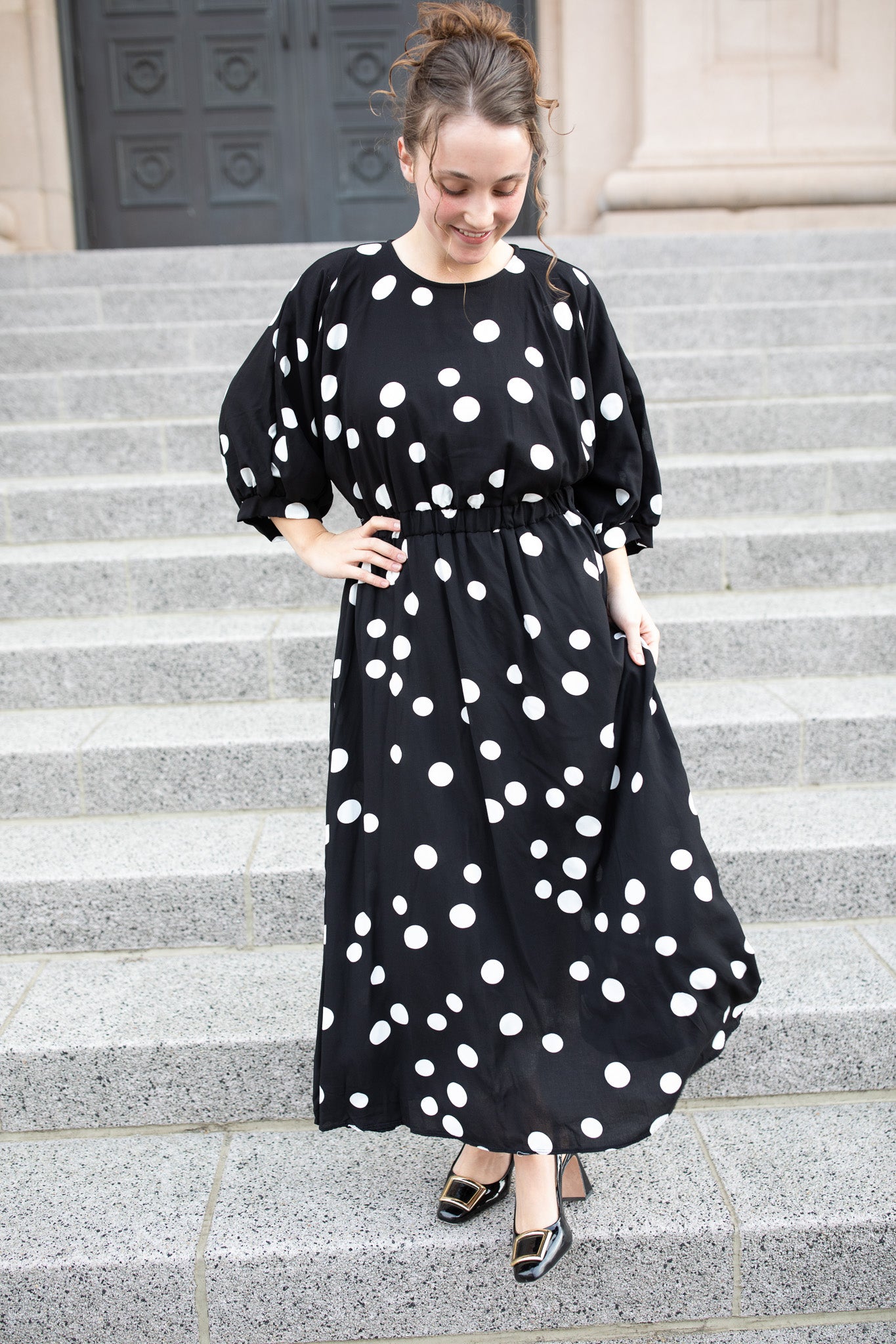 Classic, playful, and effortlessly chic — the Daisy Dot Dress is a timeless favorite. Designed with a flattering elastic waist, flowy silhouette, and side pockets, it blends comfort with elegance. The bold polka dot pattern makes it a standout choice for any season, while the soft fabric ensures easy movement and all-day wearability. Perfect for everything from Sunday outings to special gatherings.