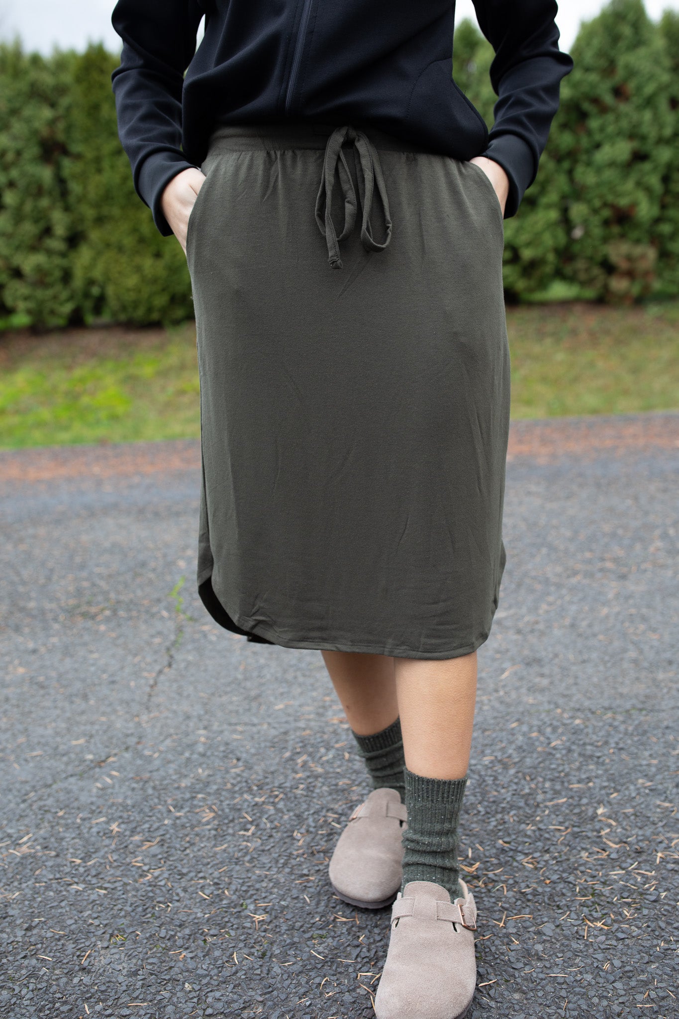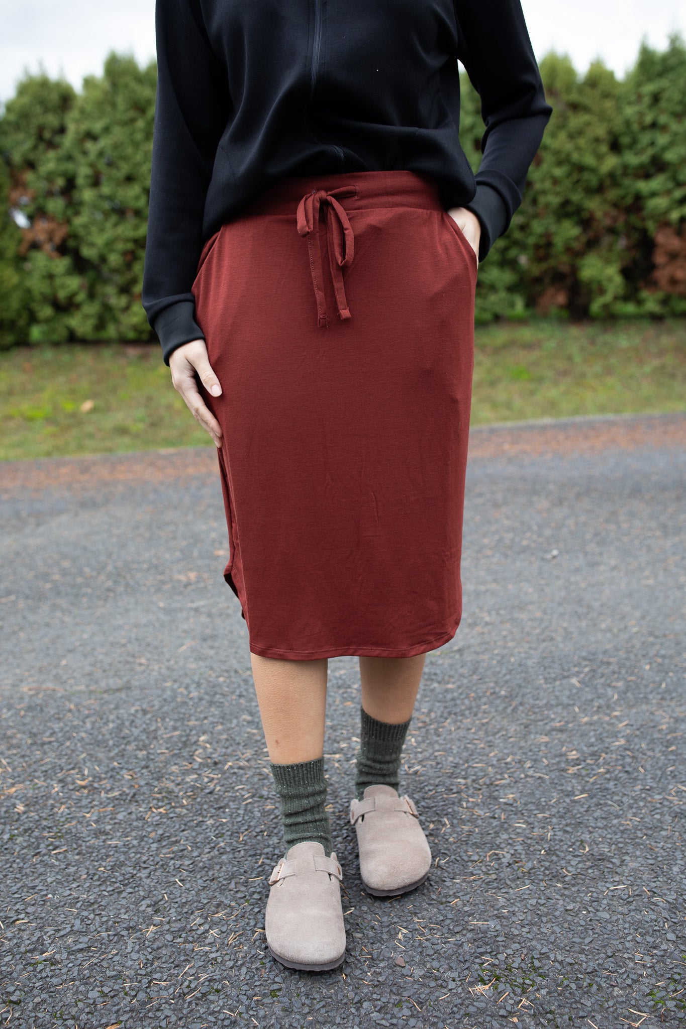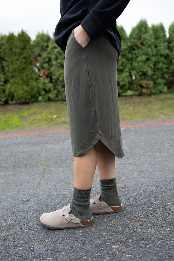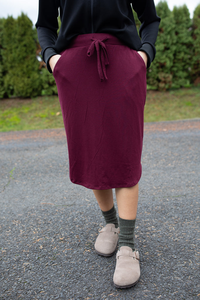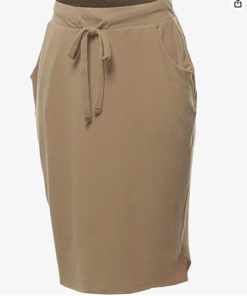 Meet your new cozy essential! This soft lounge skirt features a relaxed tulip hem, functional pockets, and an adjustable drawstring waist for the perfect fit. It runs shorter than our typical K&K skirts, making it great for relaxing at home, weekend errands, or even pairing with your favorite pajama top for a comfy sleep set. Easy, lightweight, and effortless — the ultimate everyday lounge piece!