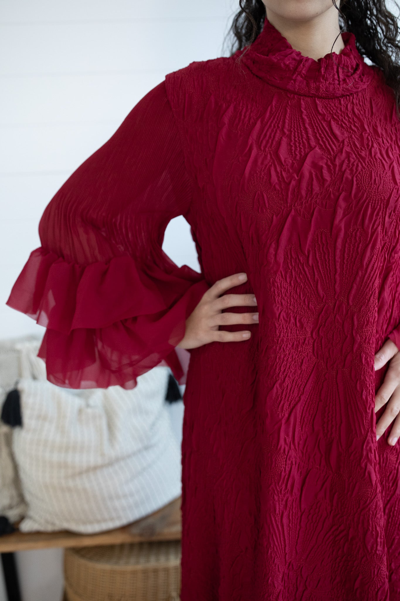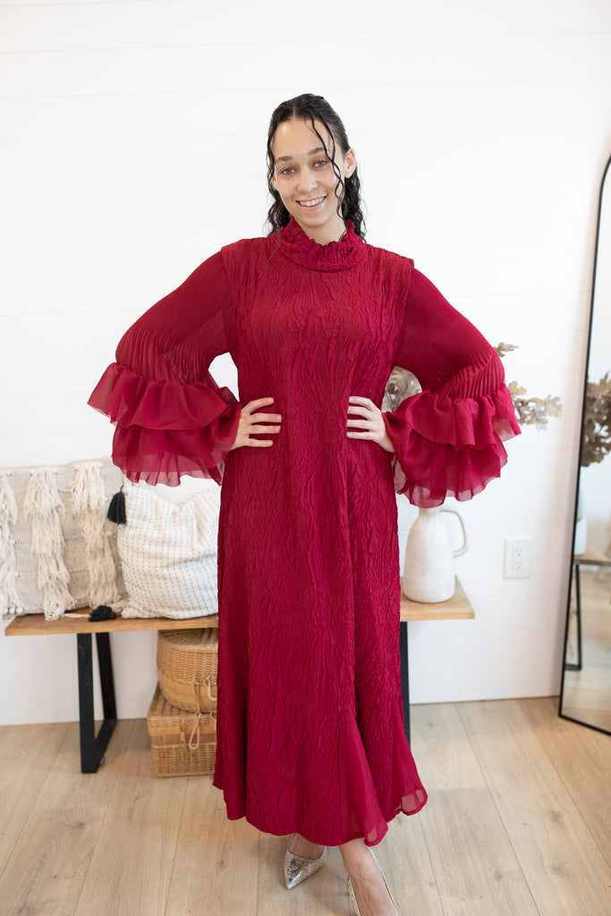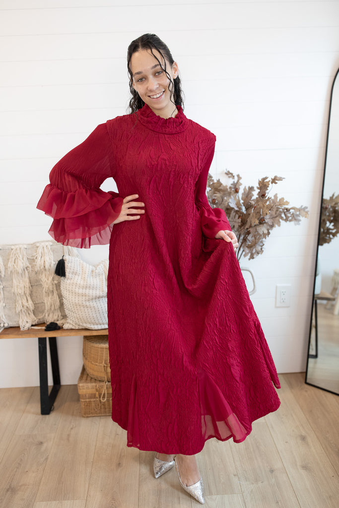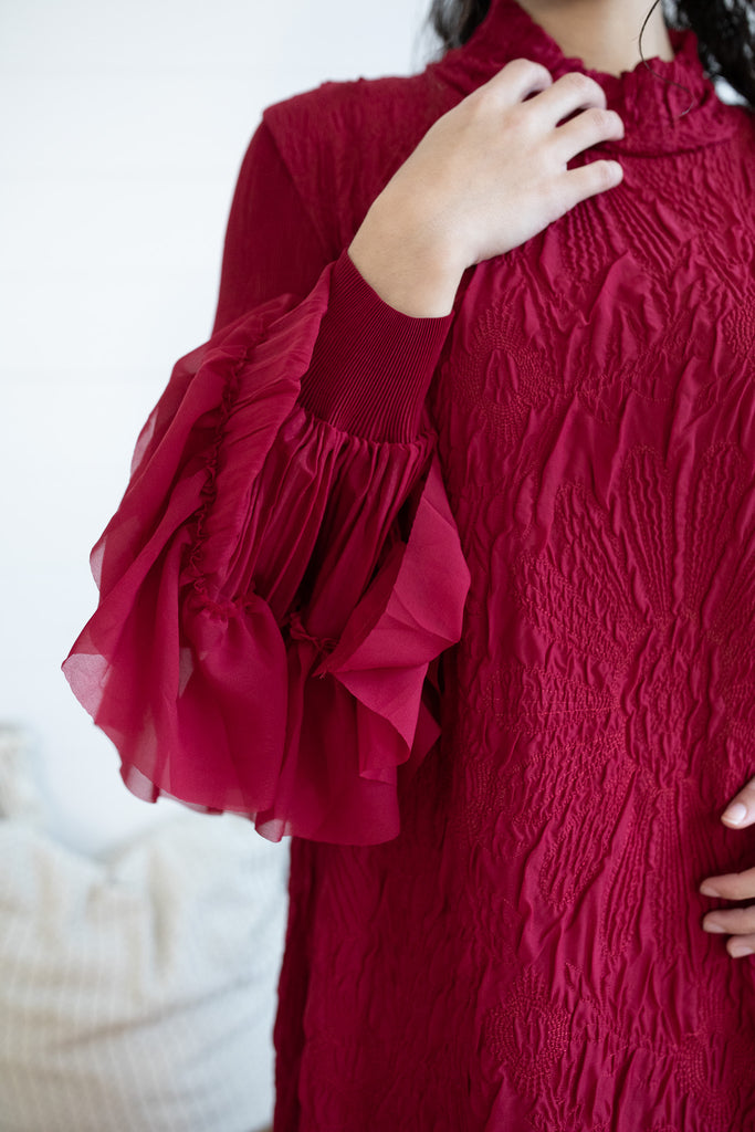 The Grace in Crimson Dress is an exclusive one-size design from K&K, crafted to embody timeless elegance. Made with rich embroidered fabric, this statement piece features a graceful mock neckline and dramatic ruffle sleeves that flow into long, full-length coverage. Its luxurious texture and flowing silhouette make it the perfect choice for winter occasions, celebrations, and evenings where sophistication is a must. Designed in our signature style reminiscent of the beloved She Walks With Dignity dress, this exclusive piece is destined to be a showstopper in your wardrobe.