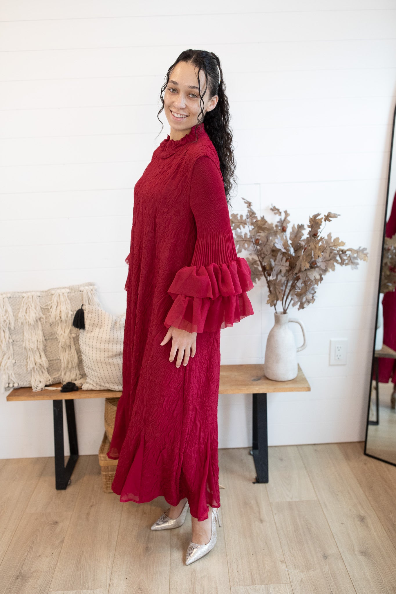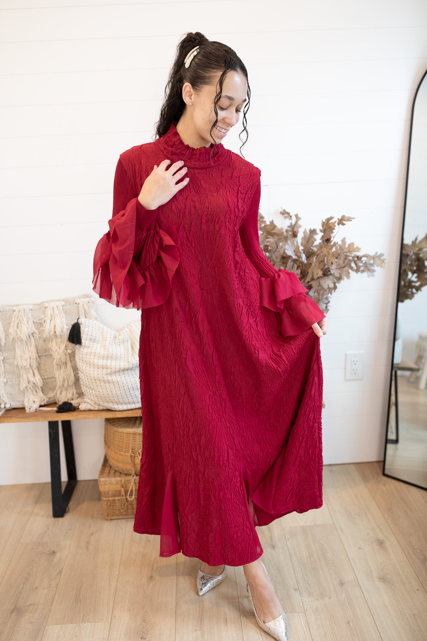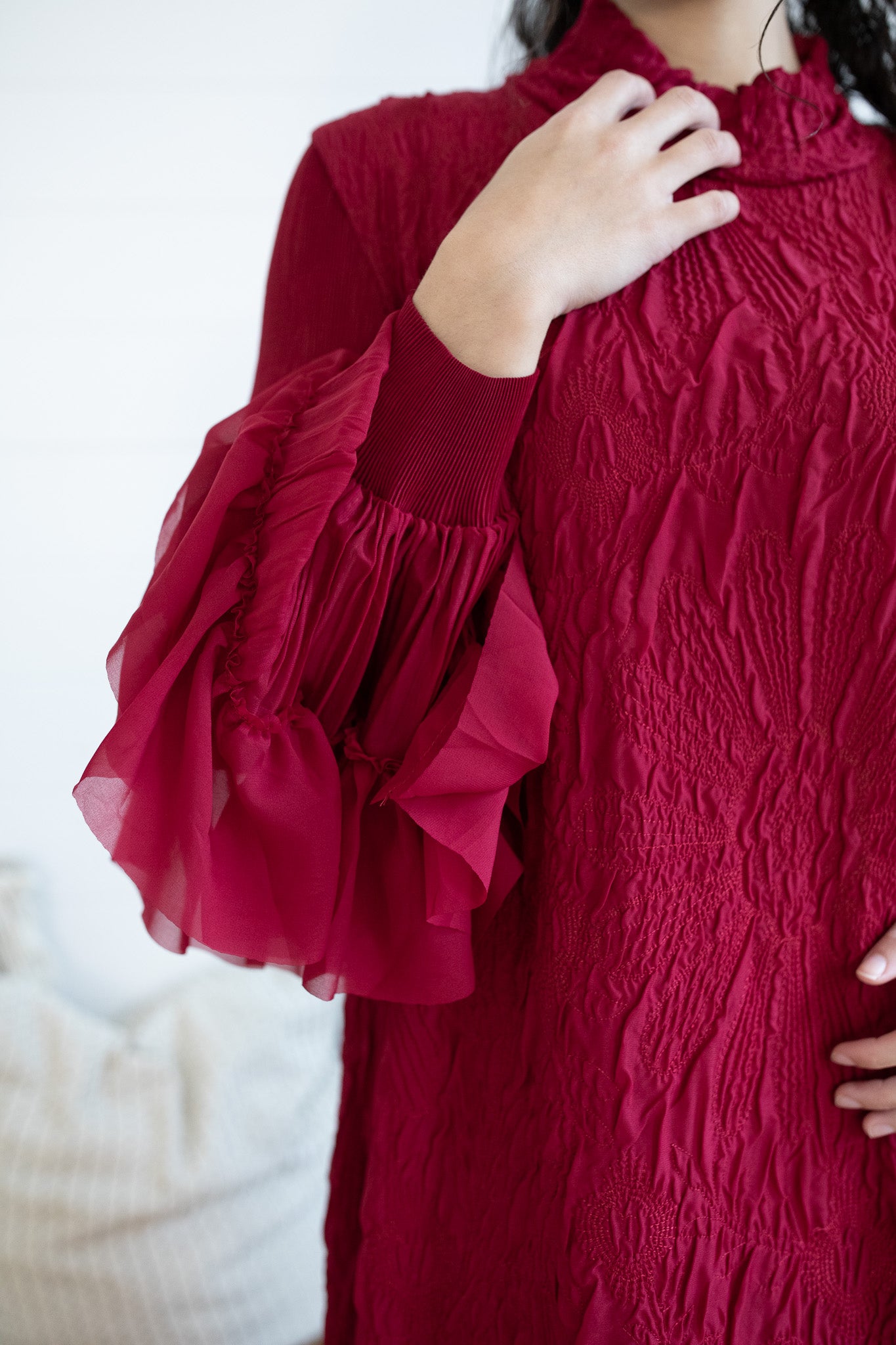 The Grace in Crimson Dress is an exclusive one-size design from K&K, crafted to embody timeless elegance. Made with rich embroidered fabric, this statement piece features a graceful mock neckline and dramatic ruffle sleeves that flow into long, full-length coverage. Its luxurious texture and flowing silhouette make it the perfect choice for winter occasions, celebrations, and evenings where sophistication is a must. Designed in our signature style reminiscent of the beloved She Walks With Dignity dress, this exclusive piece is destined to be a showstopper in your wardrobe.