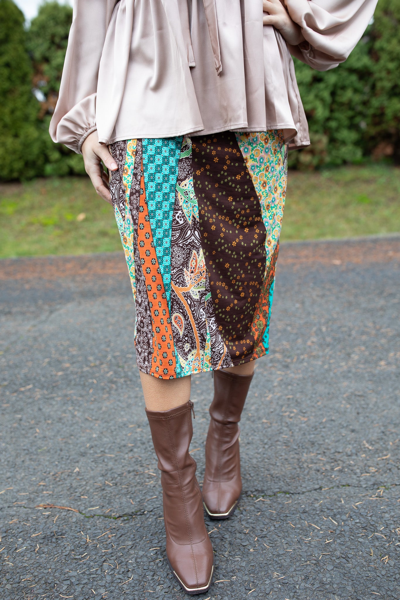 Add a pop of color and charm to your wardrobe with this beautiful patchwork-style midi skirt! Designed with an elastic waist for a comfortable, flexible fit, this skirt is easy to wear and effortlessly stylish. The mixed patterned panels create a fun, boho-inspired look that pairs perfectly with neutral tops, sweaters, or satin blouses.