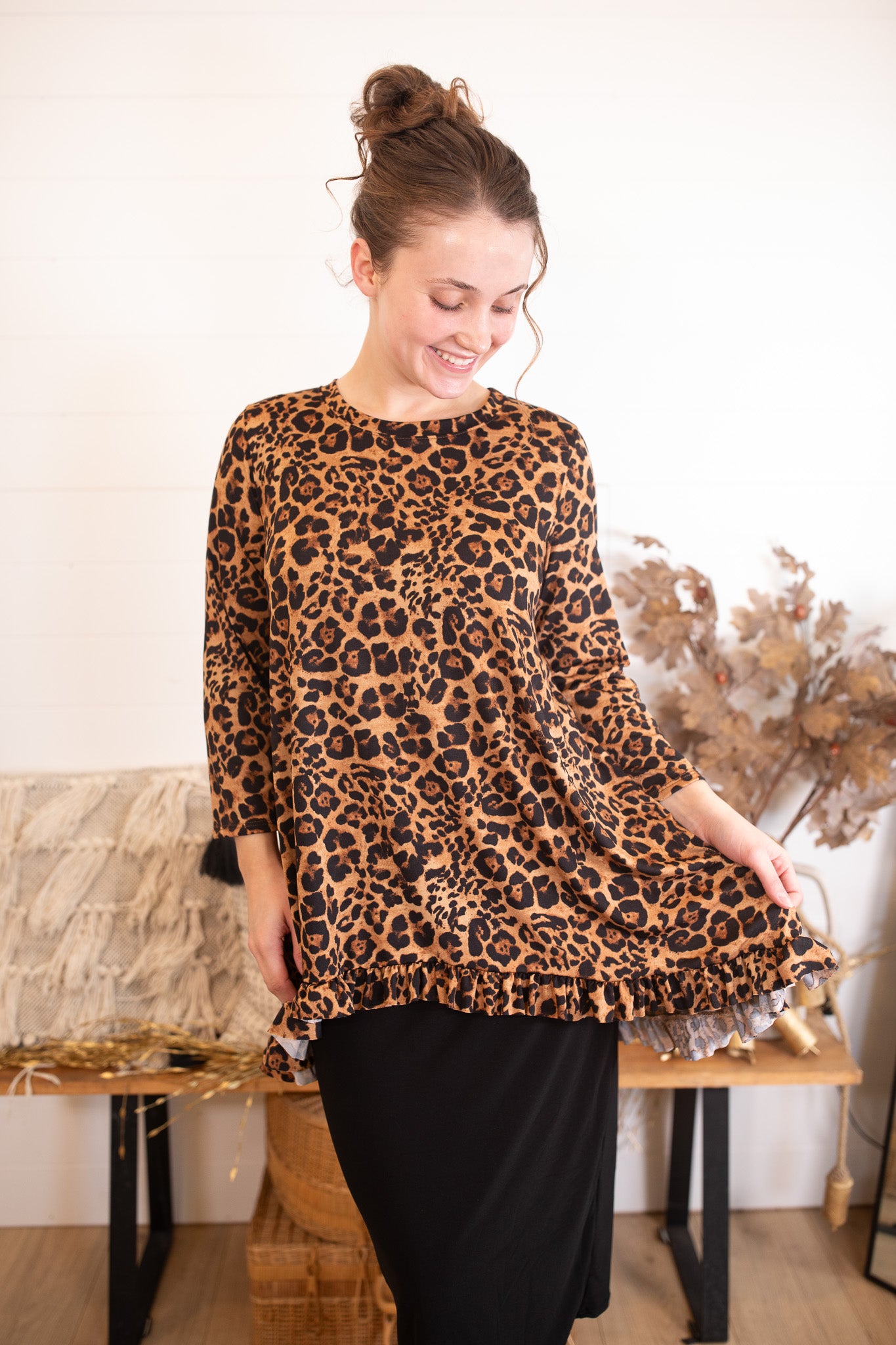 Add a touch of fun and comfort to your wardrobe with our Leopard Ruffle High-Low Top! Designed with a flattering high-low hem and a feminine ruffle detail, this top brings effortless charm to any outfit. Made from soft, stretchy fabric for all-day comfort — it’s perfect for pairing with your favorite skirts or layering on cooler days.