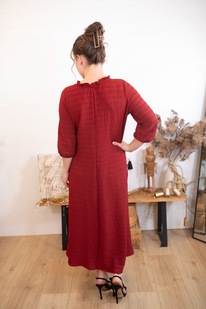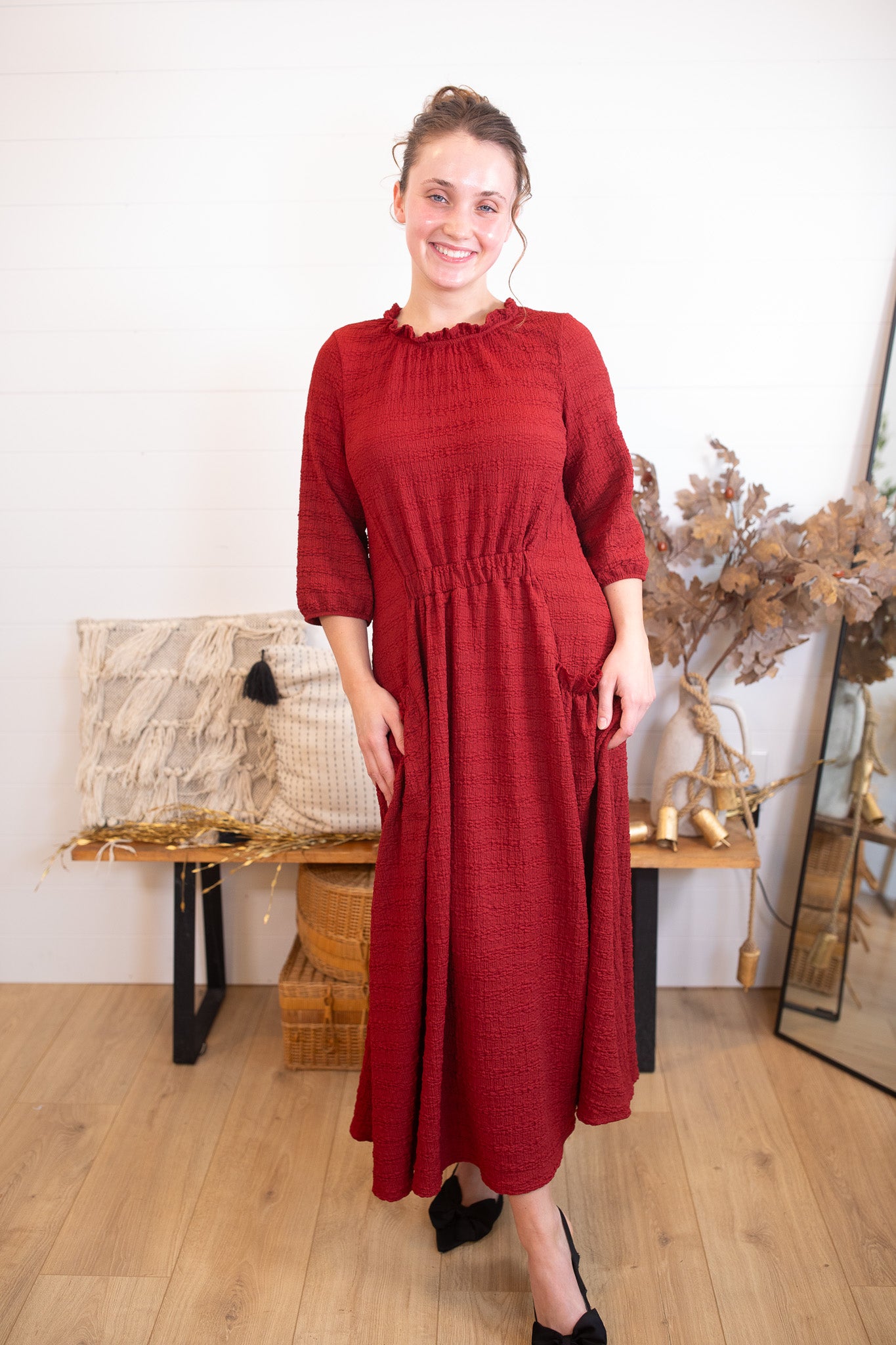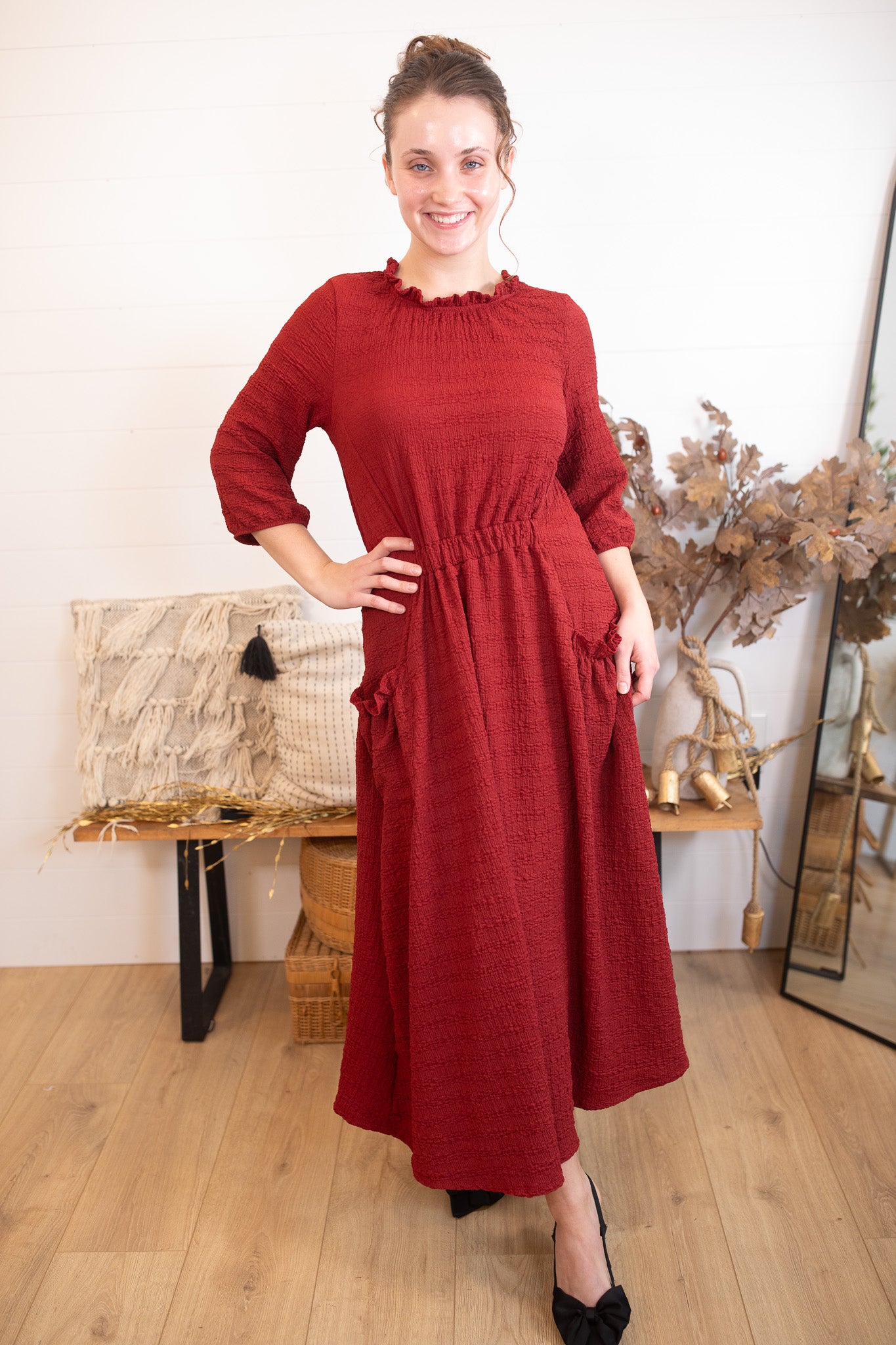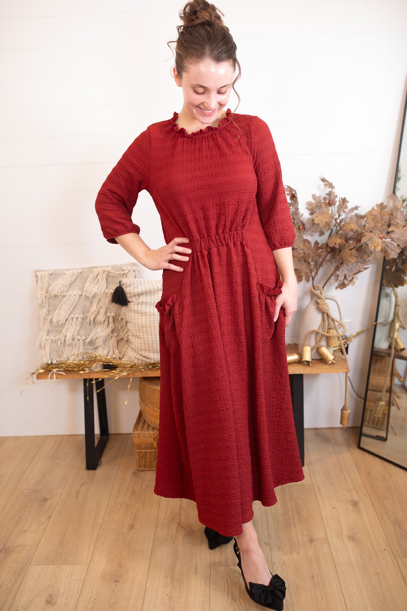Effortless charm meets everyday comfort in our Tessa Textured Dress. Made from a soft, textured fabric with just the right amount of stretch, this dress offers a flattering, comfortable fit you’ll love all season long. Featuring an elastic waist, subtle ruffle neckline, and practical pockets, it’s the perfect blend of feminine and functional. Dress it up or down for any occasion—this cozy piece will be your new go-to!