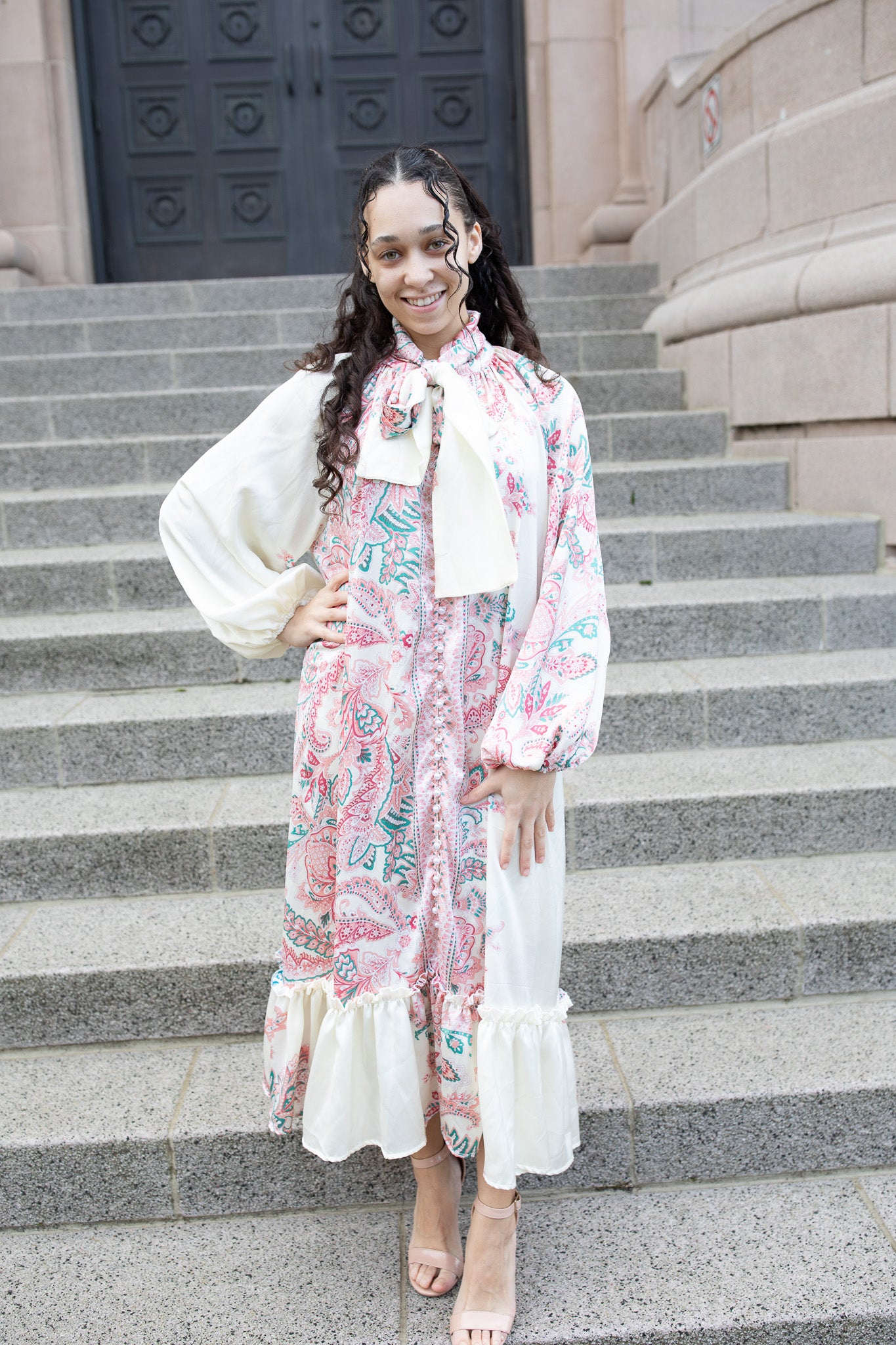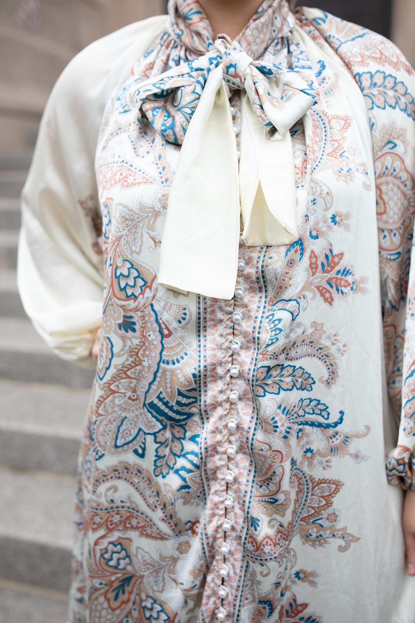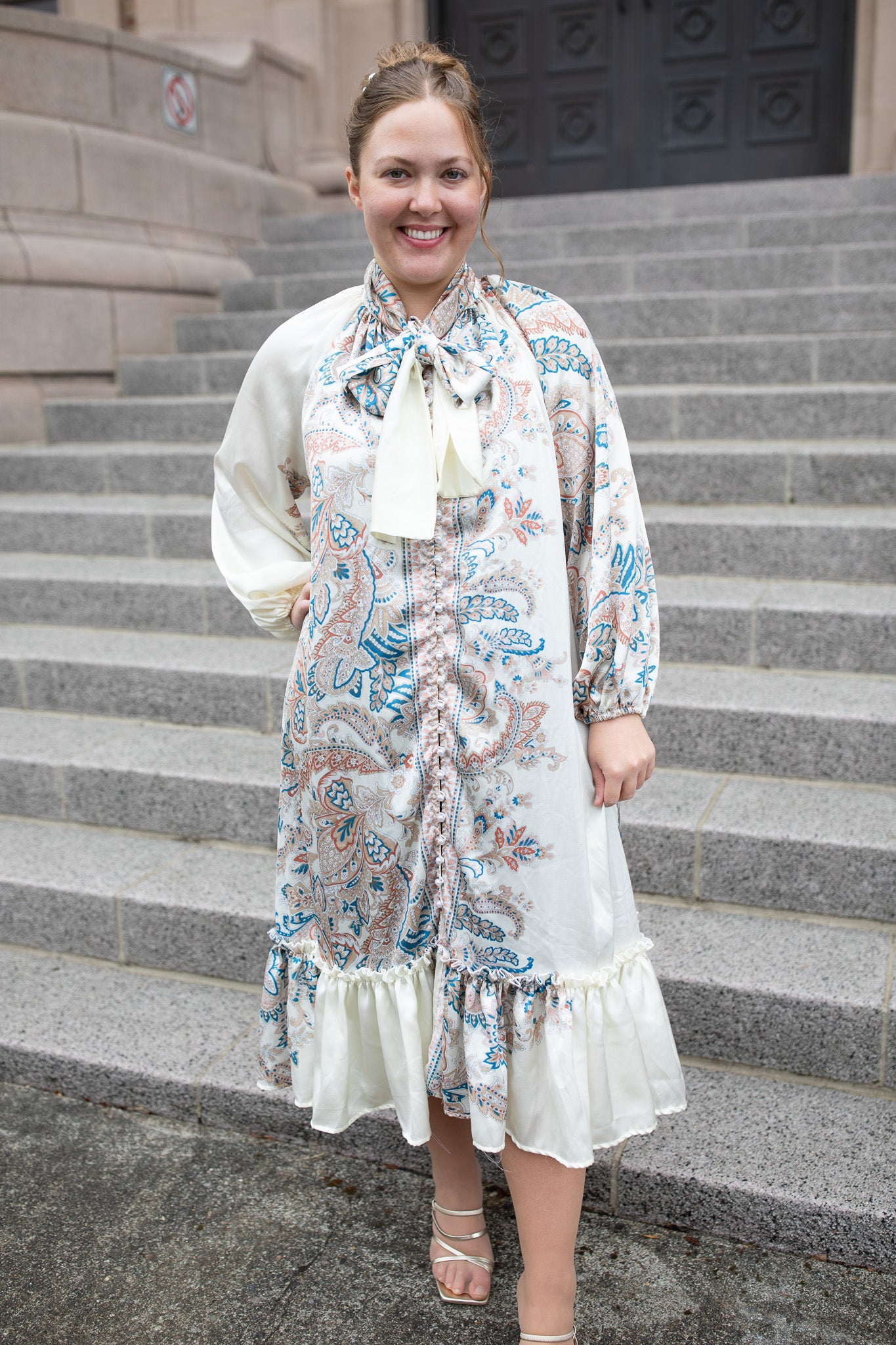 The Dreaming Of Spring dress is a soft, romantic statement piece designed with effortless elegance in mind. Featuring a beautiful paisley-inspired print, this one-size dress offers a flowy silhouette that drapes gracefully for a comfortable, flattering fit. Fully button down front with pearl style buttons. The adjustable neck tie adds a feminine touch while allowing you to style it your way, and the functional button-front detail enhances both charm and versatility.