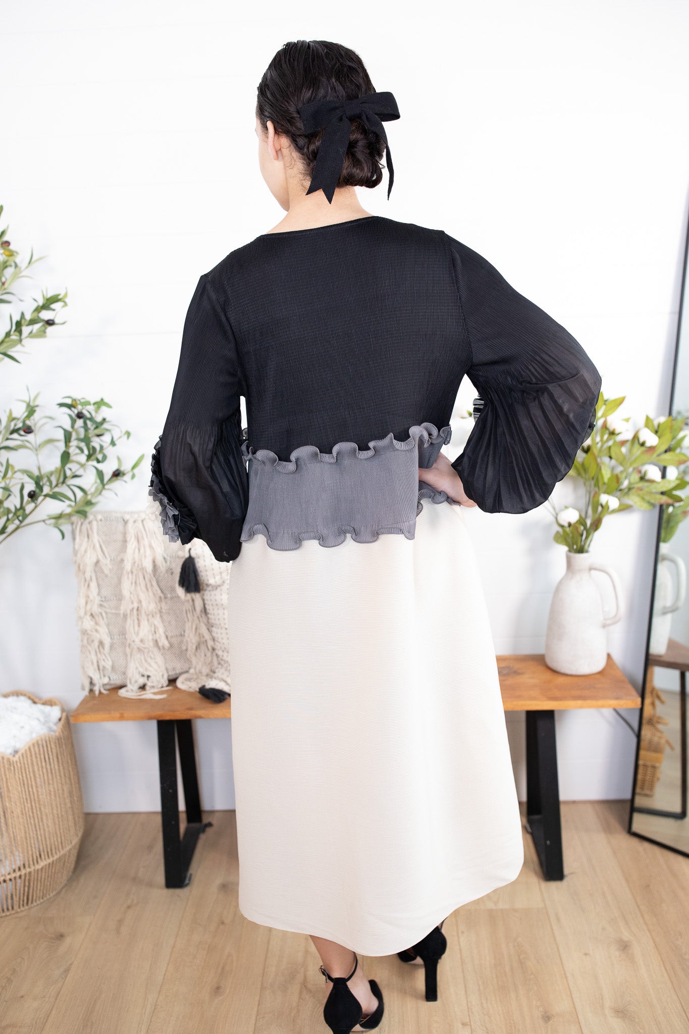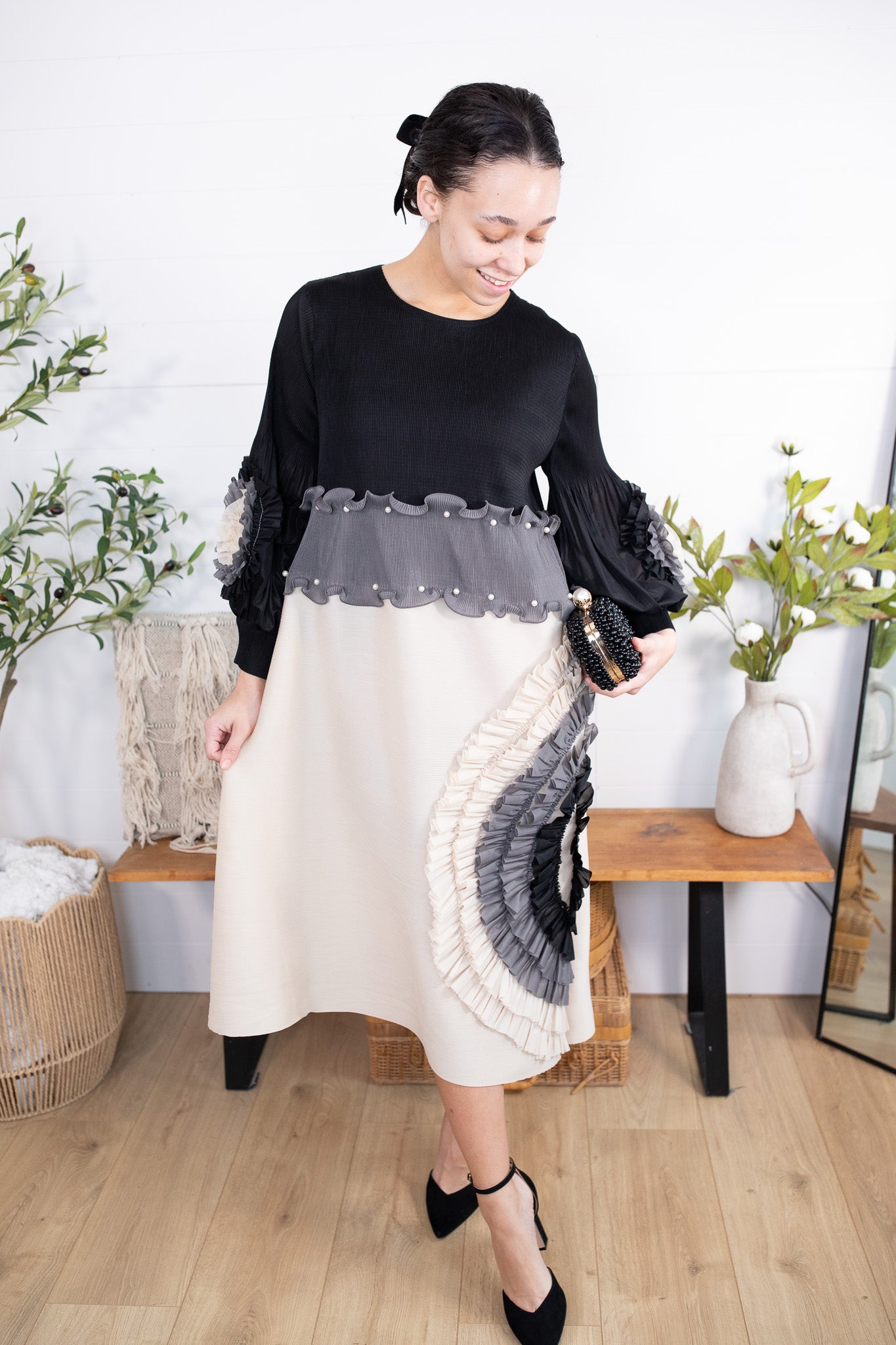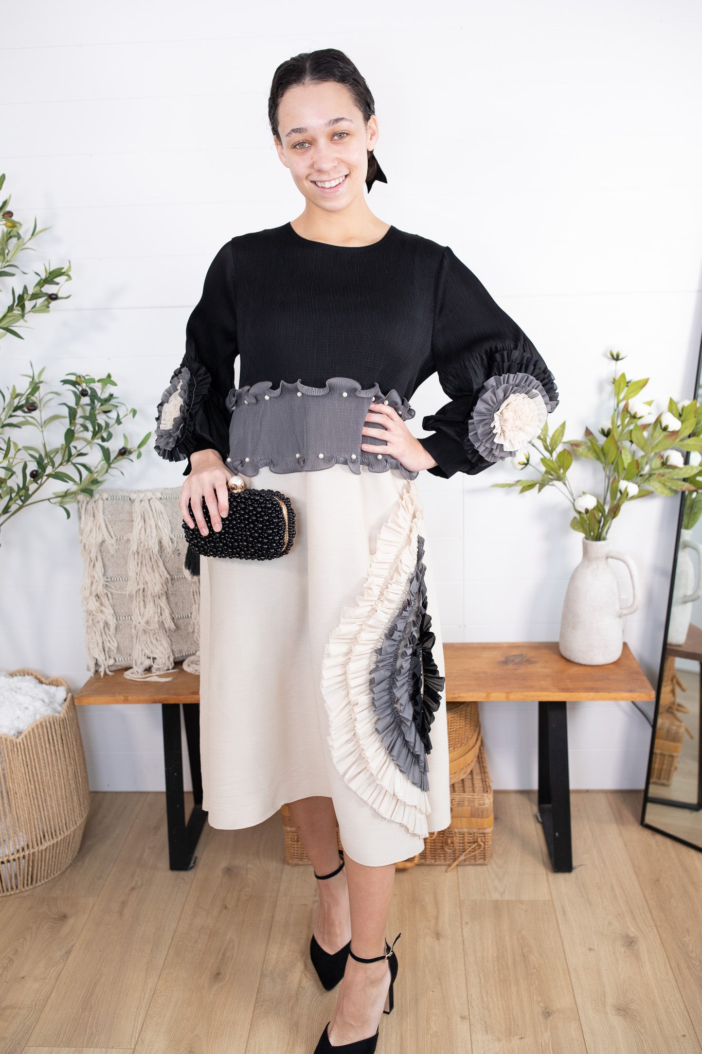 Meet your new statement-making showstopper! This one size pleated dress is the perfect blend of classy + bold, featuring a sleek black half, pearls lining the waist, with flowy pleated sleeves and a beautiful contrast bottom that instantly elevates your look. The real star? That unique layered ruffle fan design in monochrome tones—giving total designer vibes with minimal effort.
