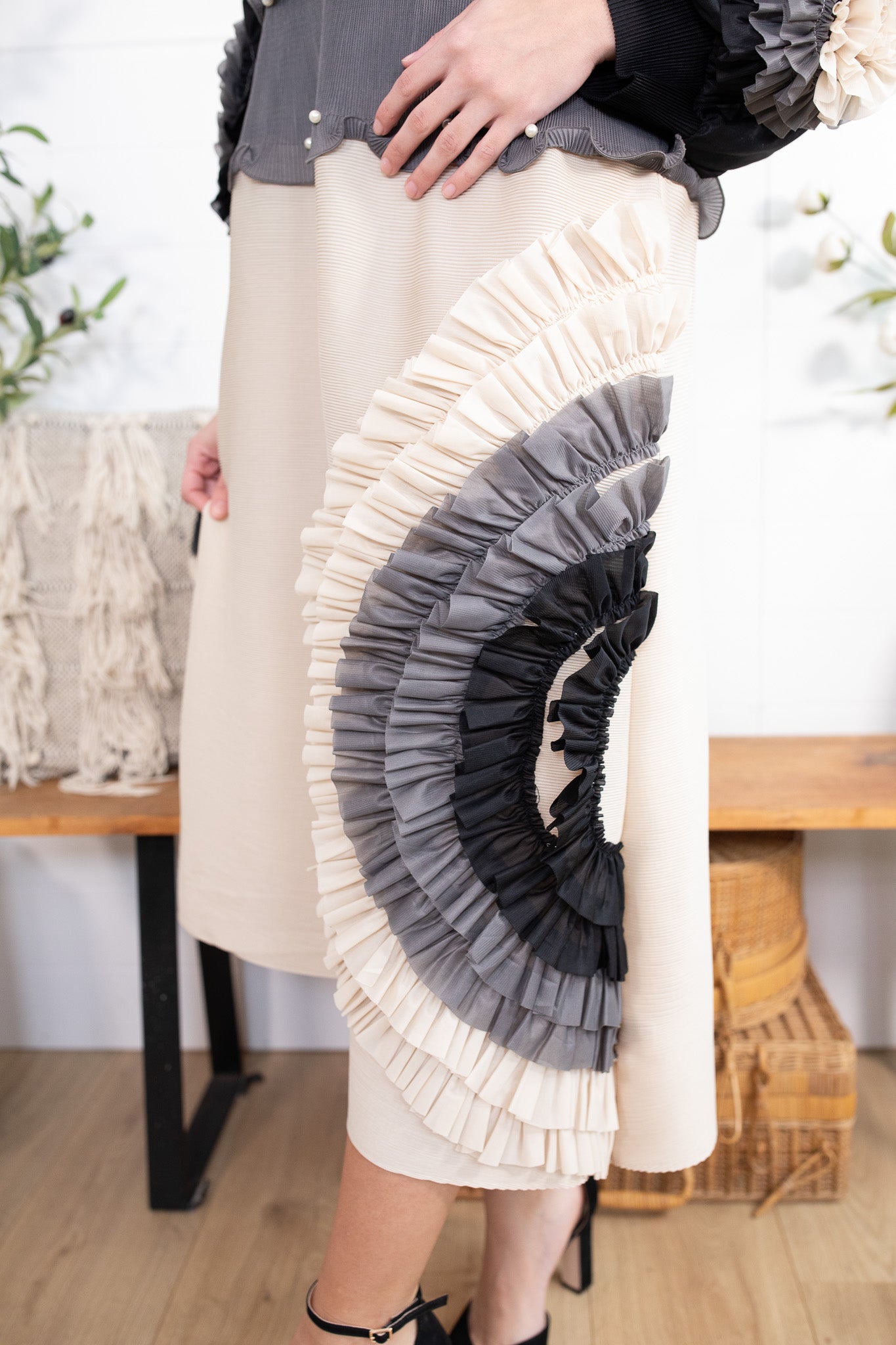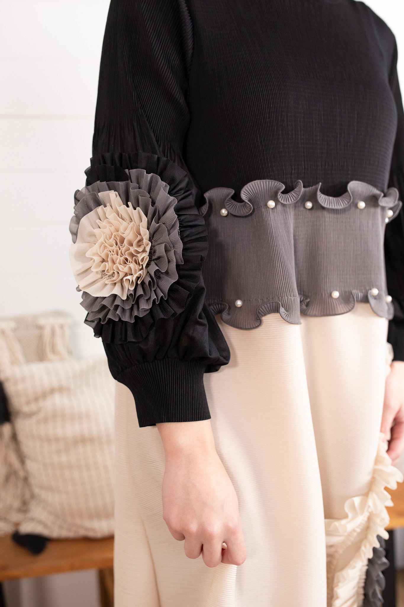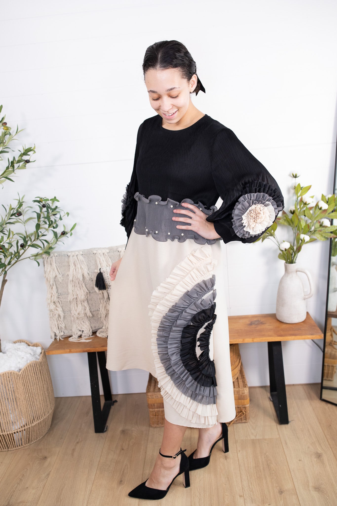Meet your new statement-making showstopper! This one size pleated dress is the perfect blend of classy + bold, featuring a sleek black half, pearls lining the waist, with flowy pleated sleeves and a beautiful contrast bottom that instantly elevates your look. The real star? That unique layered ruffle fan design in monochrome tones—giving total designer vibes with minimal effort.