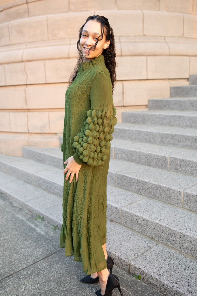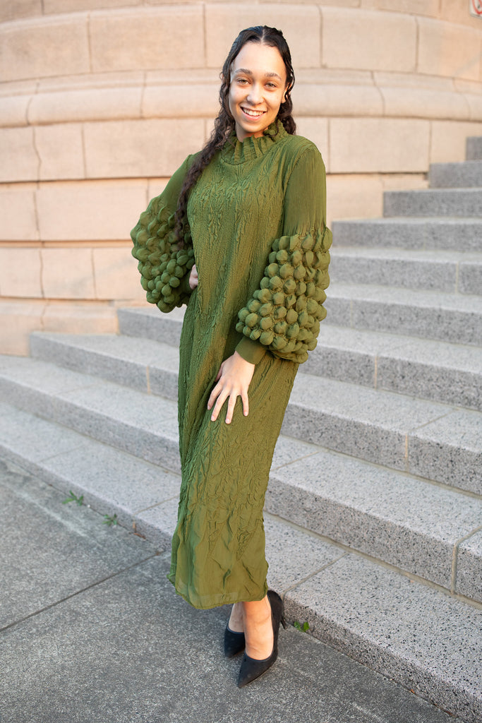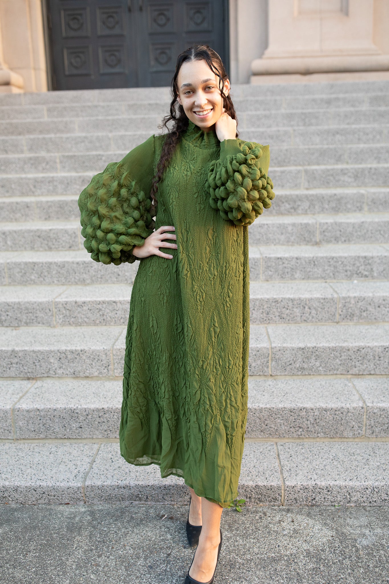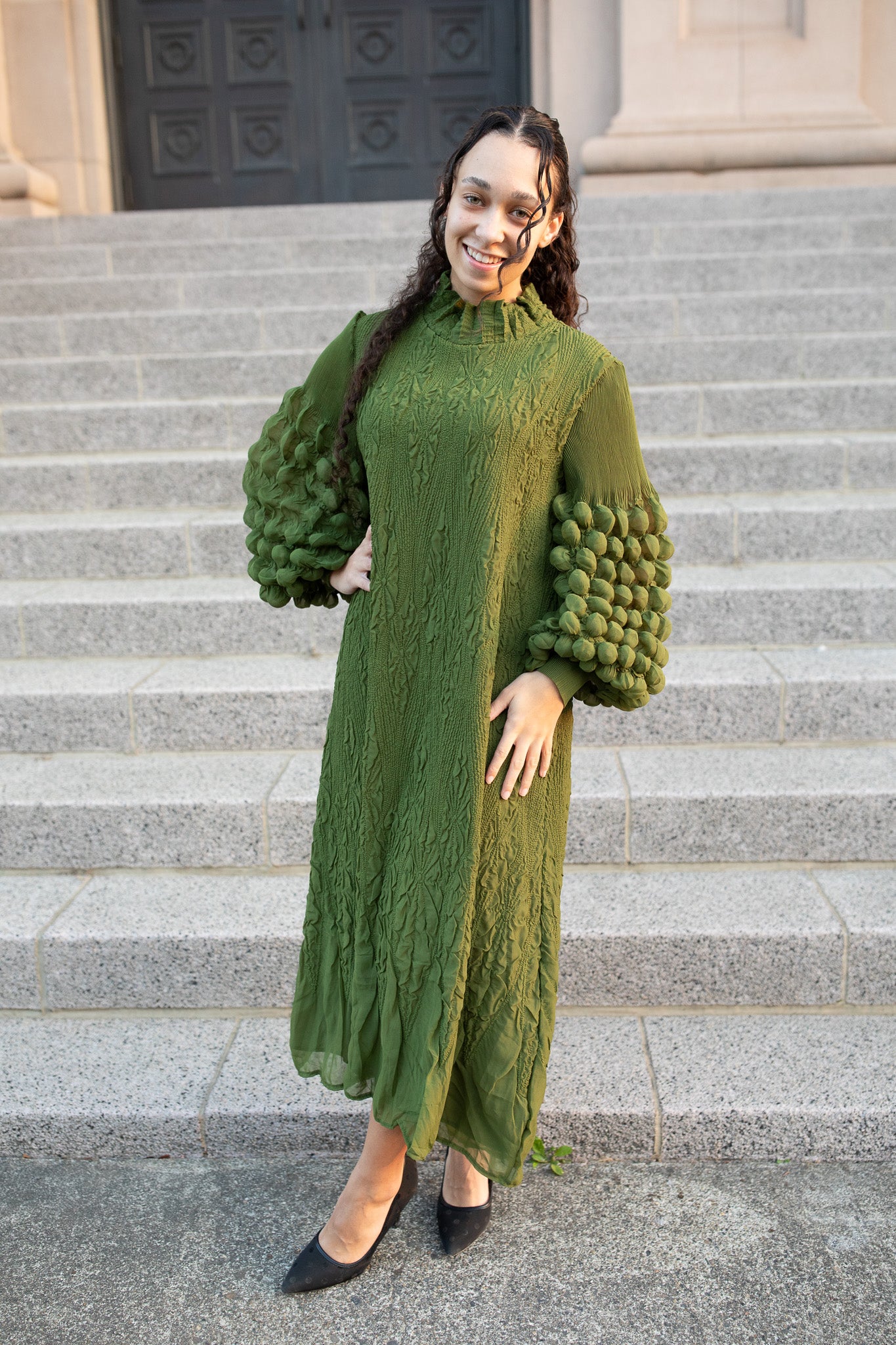 Unleash your inner elegance with the She Walks With Dignity Dress! Now in a longer length, this unique dress features a lined body, crinkled embroidered fabric, and puffy pleated sleeves for a touch of sophistication. Its lightweight material offers some stretch for a comfortable fit. Limited stock available, so make it your new favorite dress now! Please Note: Sleeves are not lined and have some sheerness to them.Β