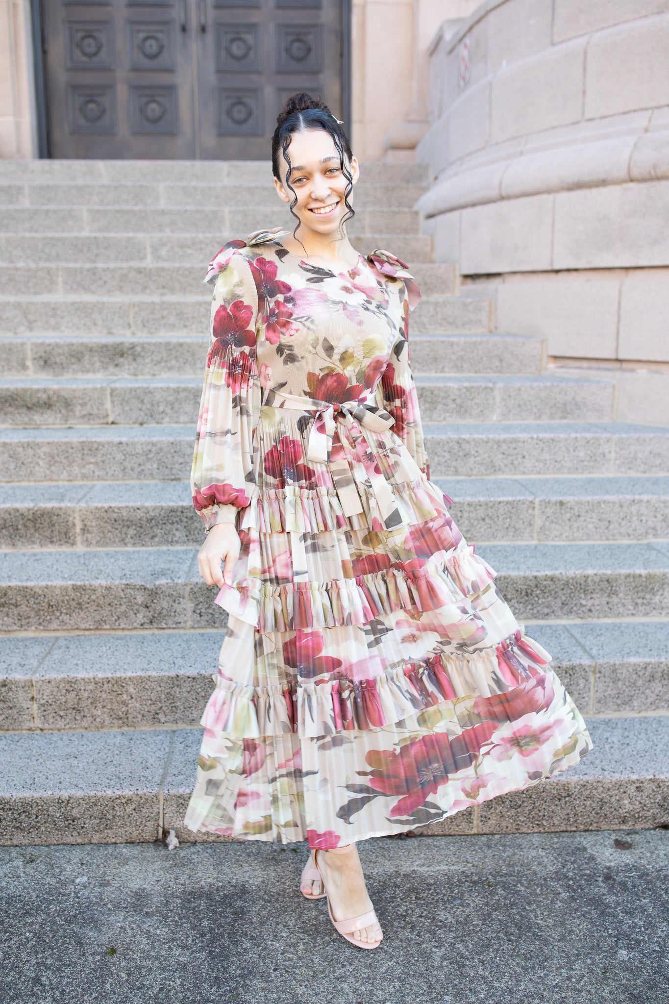 Designed by K&K - This one-size dress features delicate bow details on each shoulder, a flattering tie at the waist that is removable, and an eye-catching pleated design throughout. The tiered ruffle skirt adds movement and volume, making it perfect for special occasions or everyday elegance.