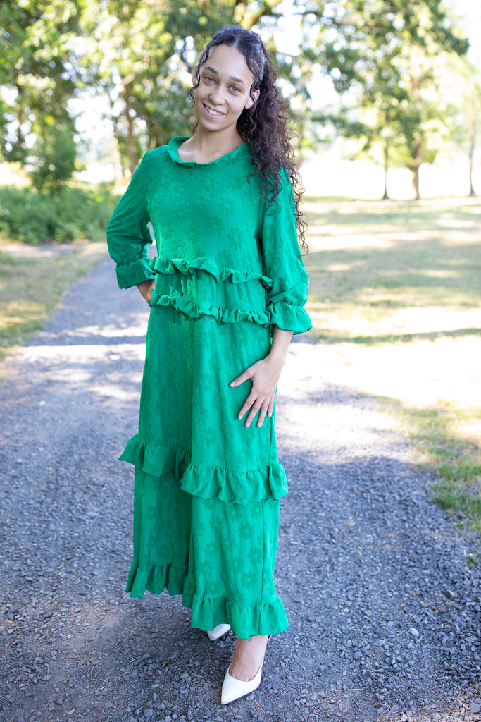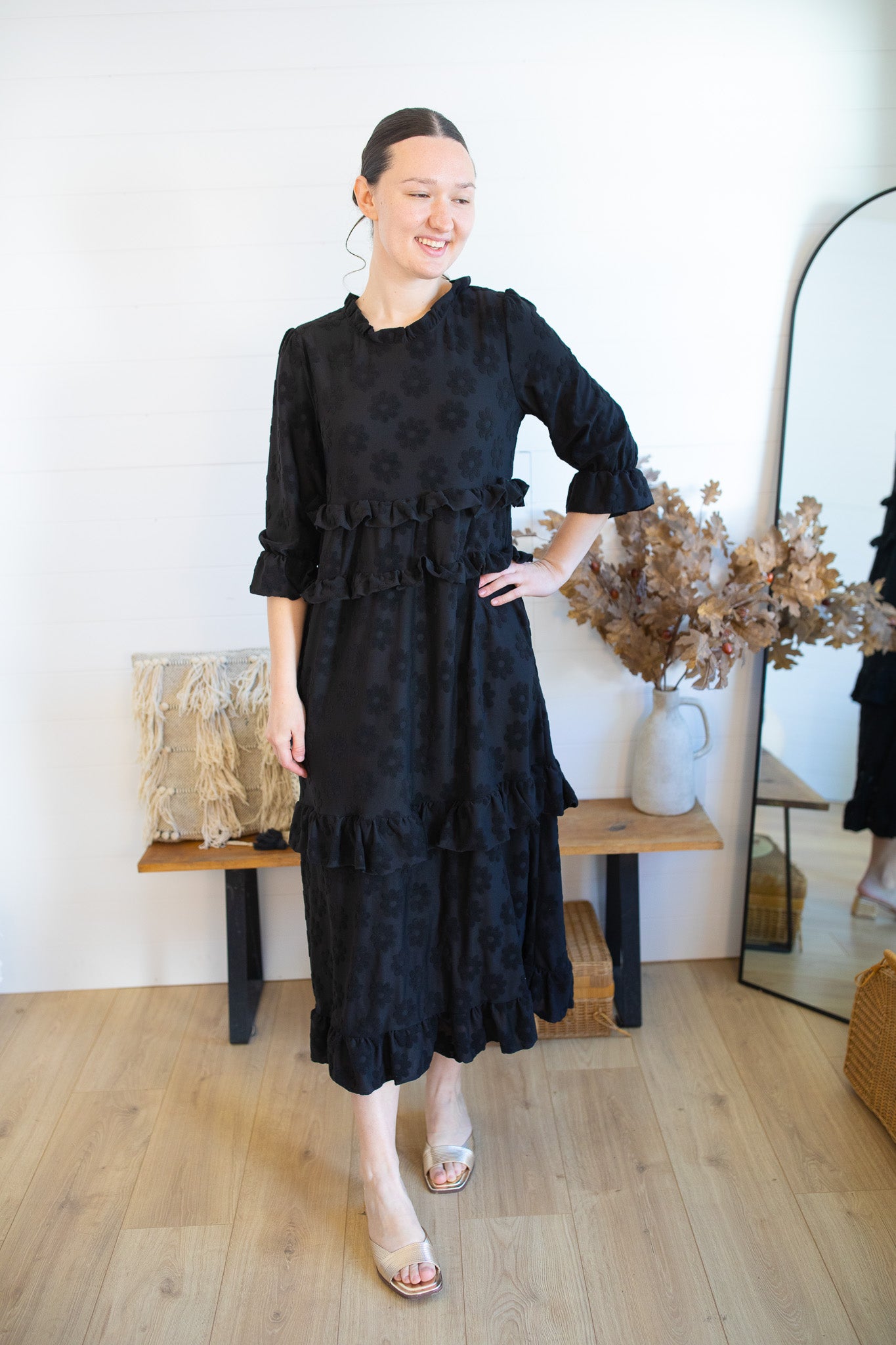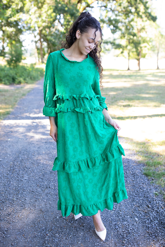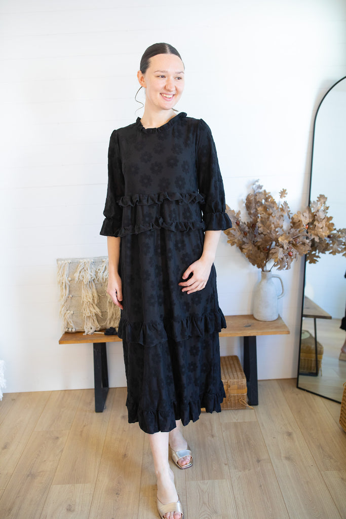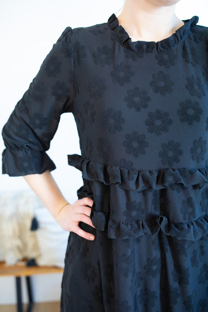 Make a bold statement this fall with the Camellia Ruffle Dress! This standout style features whimsical fuzzy floral details that are beautifully raised from the fabric, giving it a unique texture and cozy dimension. Designed in a medium-weight fabric, it's perfect for transitioning into the cooler months. With playful ruffle tiers, ¾ sleeves, and functional pockets, it blends charm and comfort effortlessly. Available in three stunning colors, this dress is a must-have for the season!