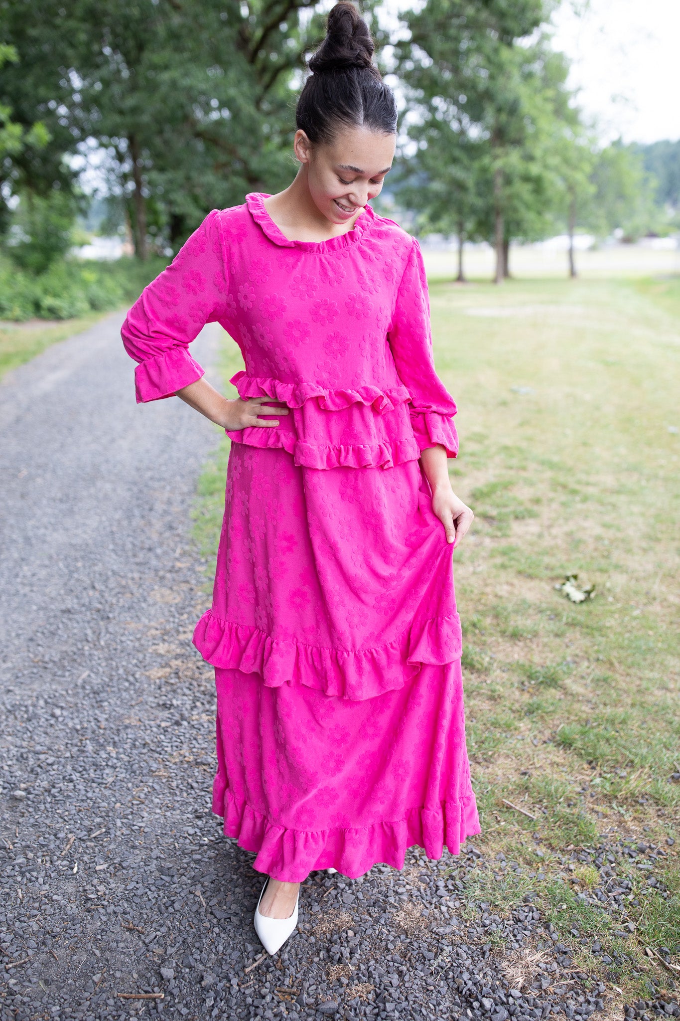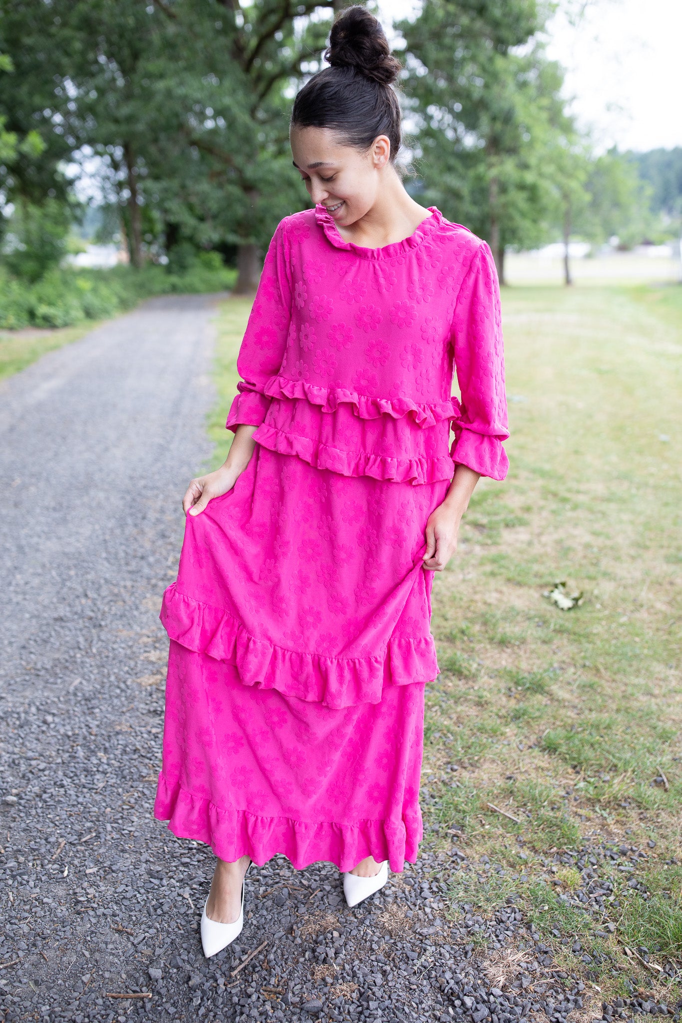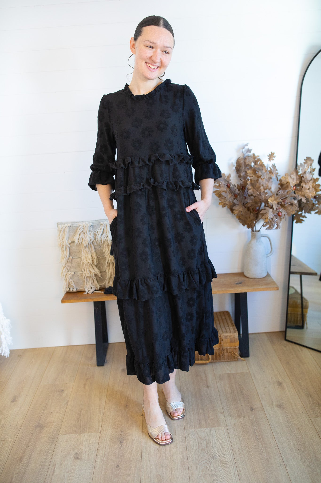 Make a bold statement this fall with the Camellia Ruffle Dress! This standout style features whimsical fuzzy floral details that are beautifully raised from the fabric, giving it a unique texture and cozy dimension. Designed in a medium-weight fabric, it's perfect for transitioning into the cooler months. With playful ruffle tiers, ¾ sleeves, and functional pockets, it blends charm and comfort effortlessly. Available in three stunning colors, this dress is a must-have for the season!