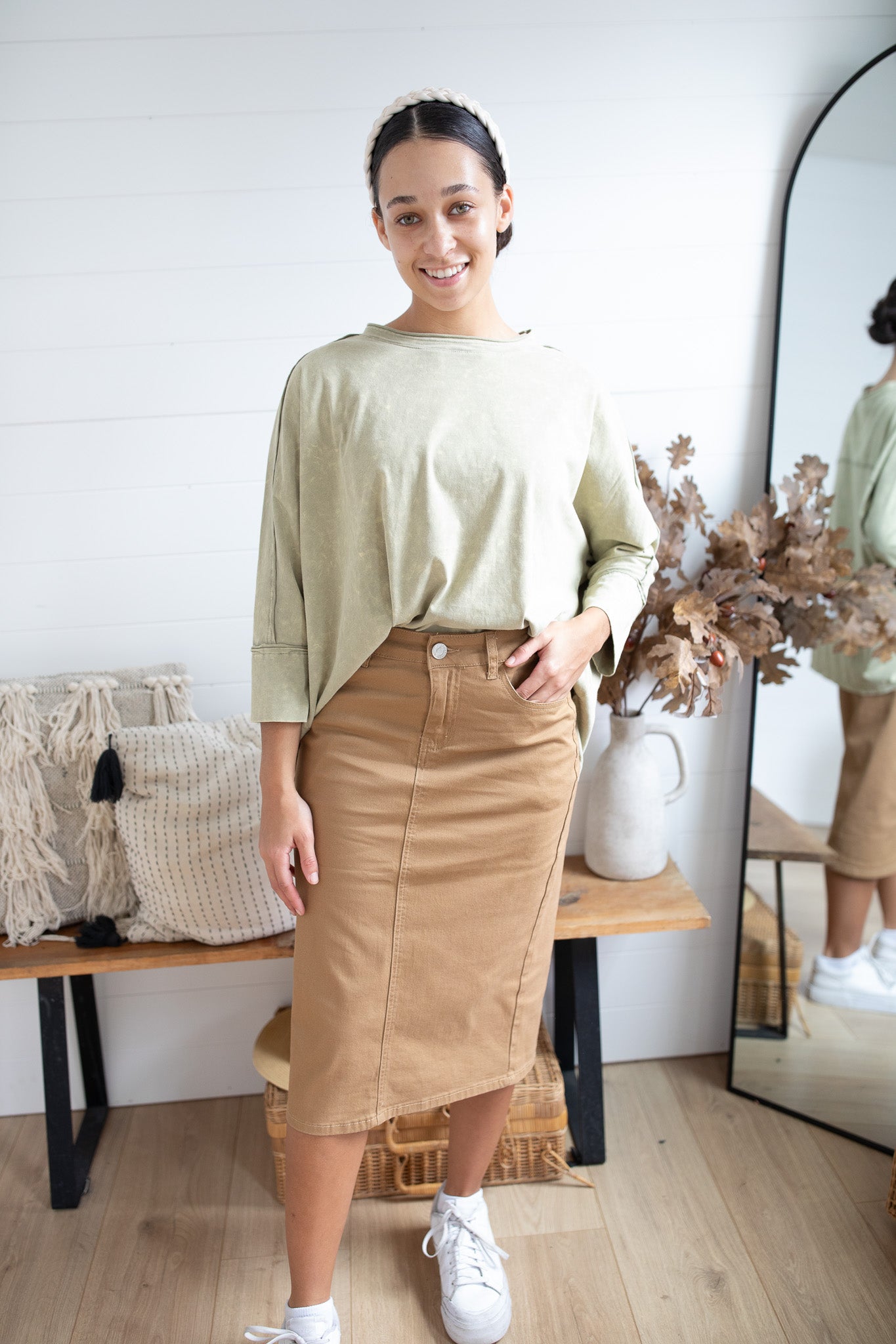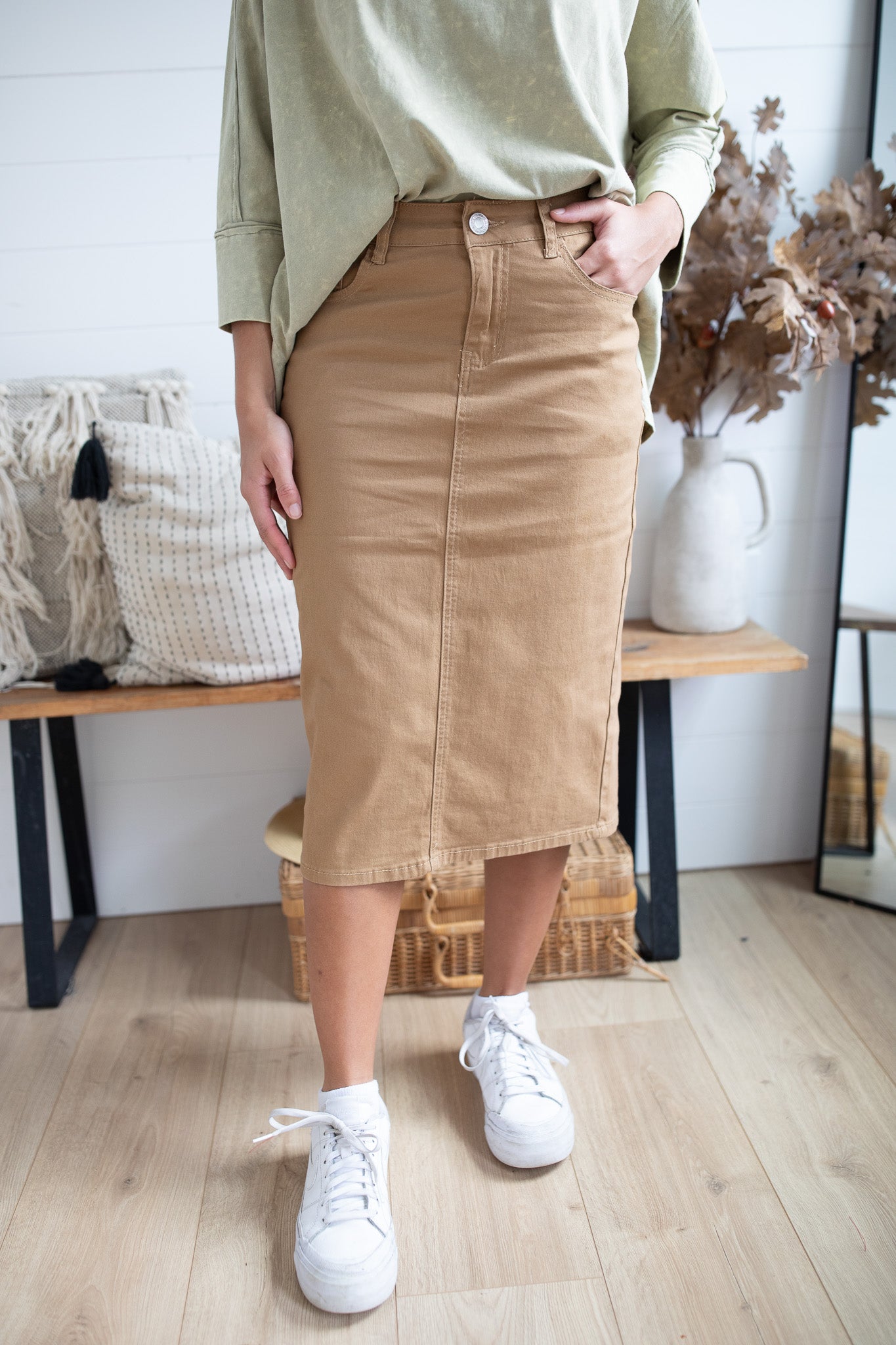A true wardrobe essential, this Khaki Denim Skirt is the perfect blend of style and comfort. Made from a soft, stretchy denim, it moves with you while keeping its structured look. The versatile khaki shade makes it easy to pair with anything in your closet, while the classic design ensures it never goes out of style. Perfect for fall layering, this skirt is a must-have staple piece youβll reach for again and again.