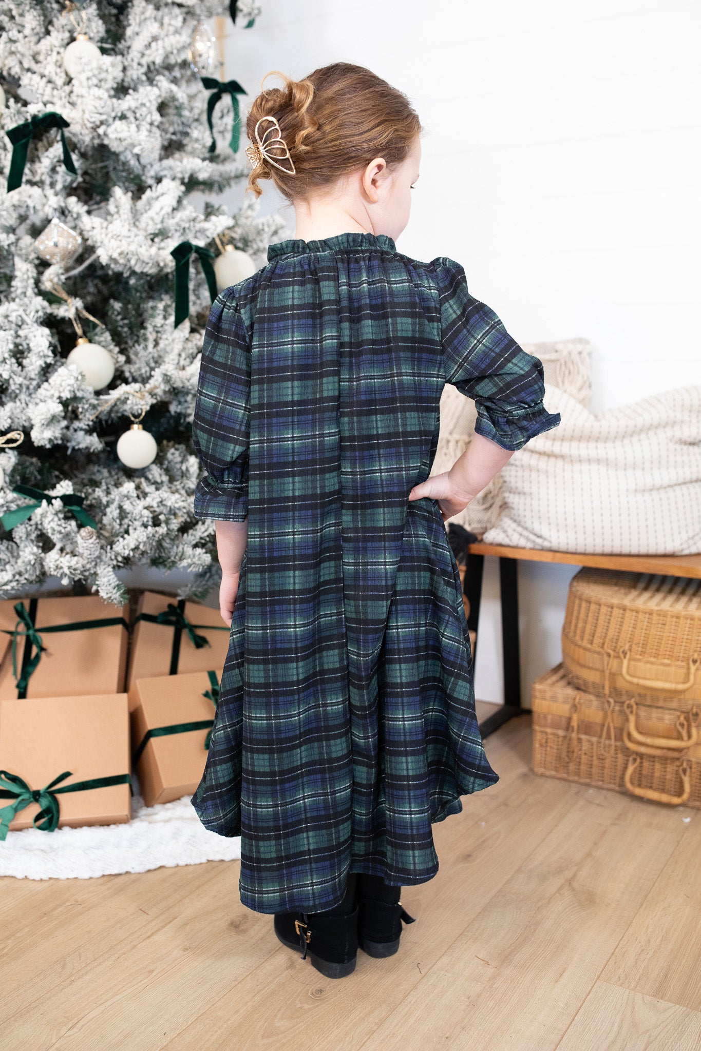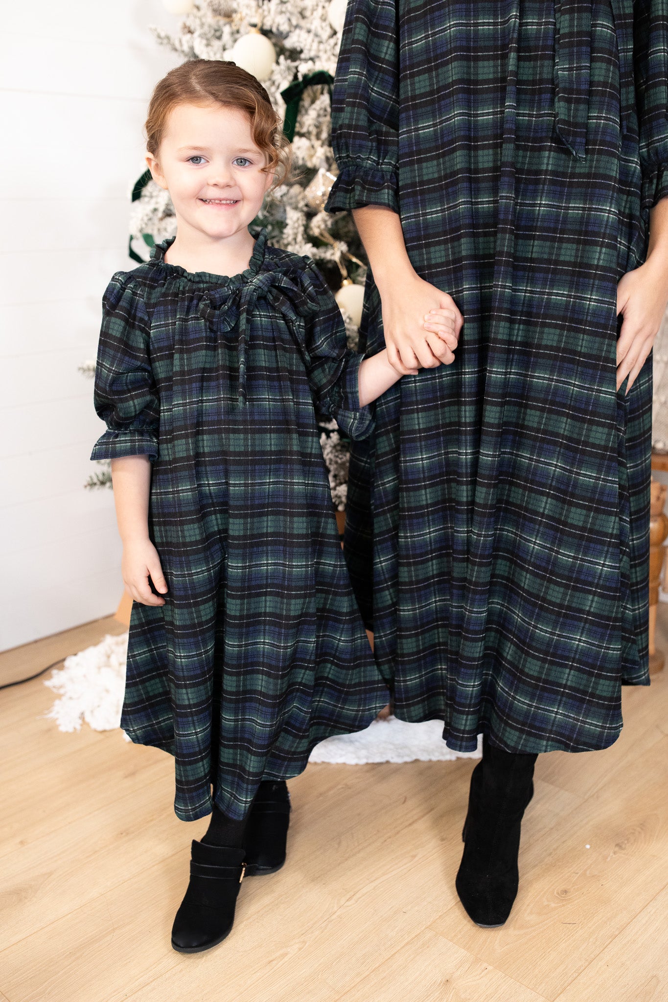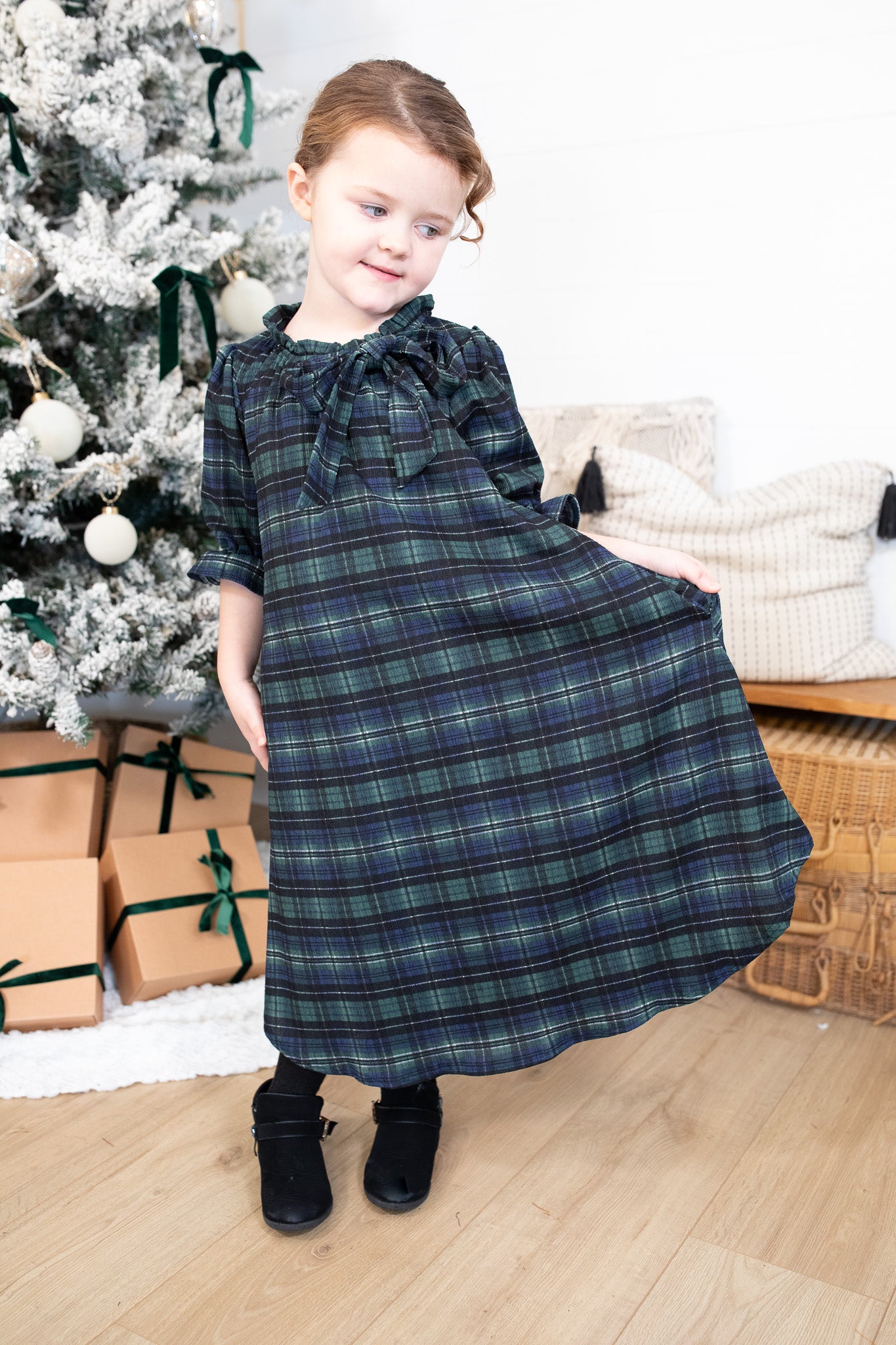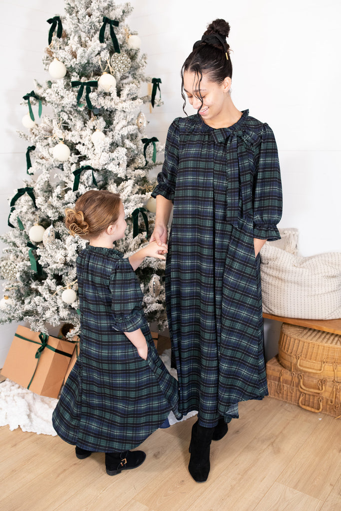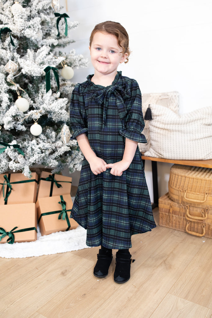 Our beloved Amber Dress is now available in the sweetest girls’ version! Made in our exclusive Lauren Plaid fabric, this dress is fully lined for comfort and features a darling ruffle neckline with a matching bow tie. The 3/4 sleeves have a gentle ruffle detail, and the flowy tiered silhouette makes it perfect for twirling through the holiday season. Designed with the same charm and quality as mom’s version, this limited-stock style is an adorable, modest, and cozy option for all your festive moments. Mommy & Me ready!