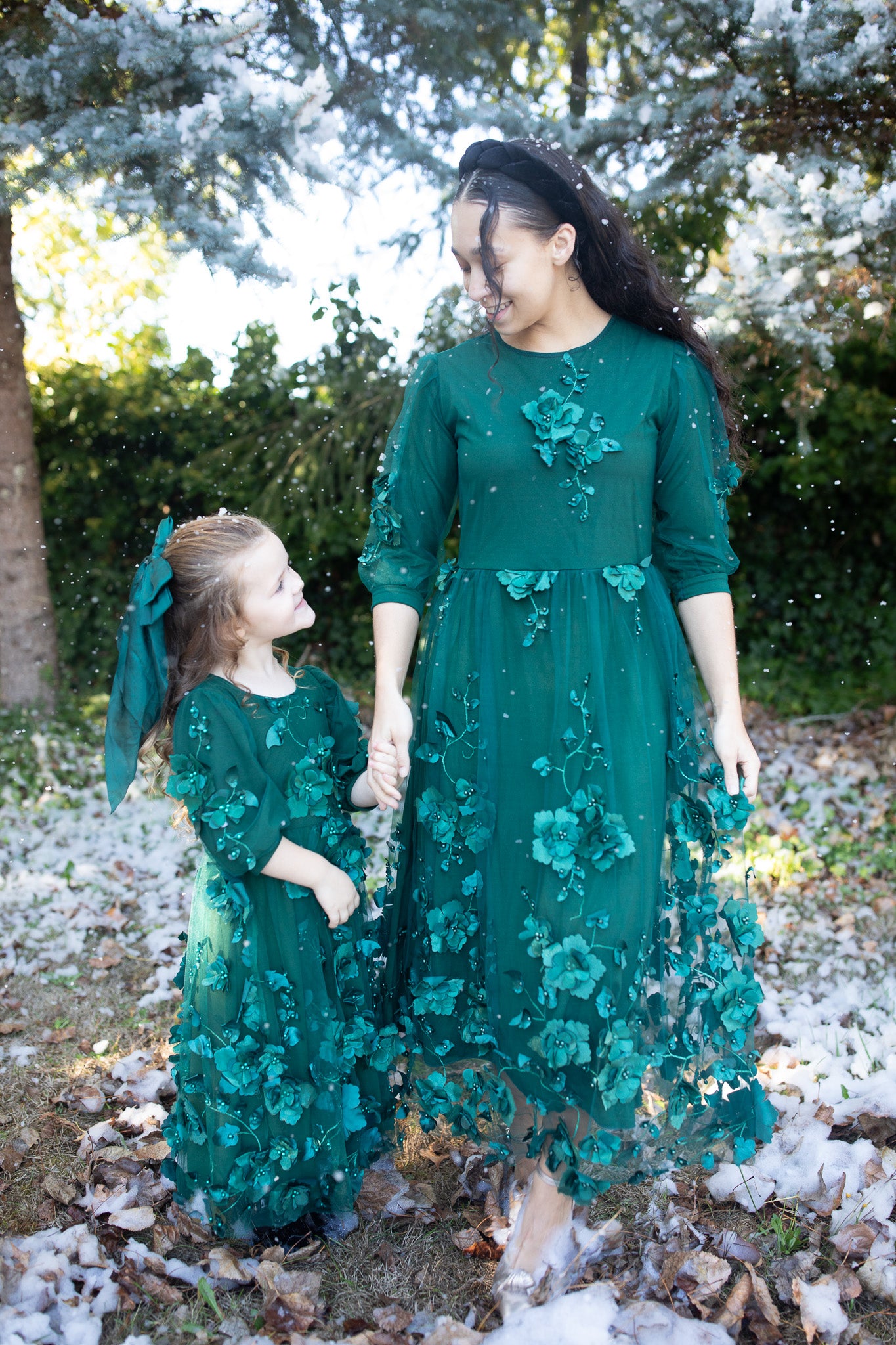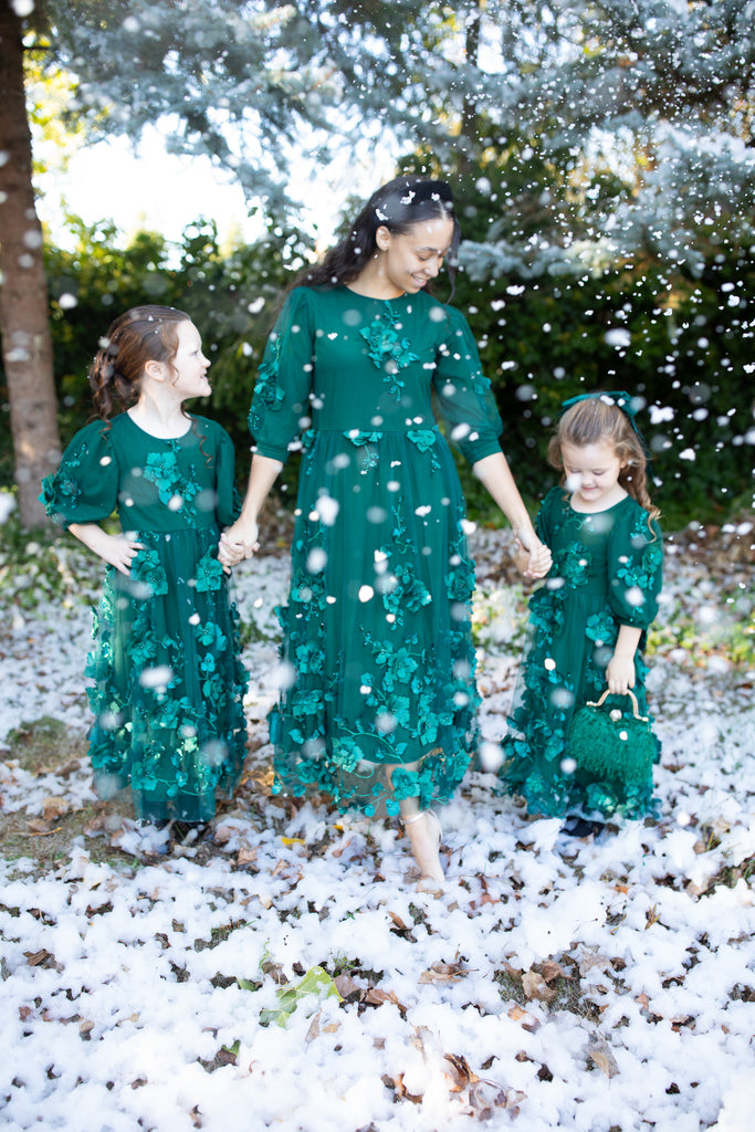 Make her holiday season magical with The Girls Evergreen Petal Dress. Designed to match the women’s version, this enchanting dress features layers of soft tulle adorned with 3D floral appliqués that flutter with every twirl. Fully lined for comfort and ease, it’s perfect for Christmas photos, family gatherings, or festive events.