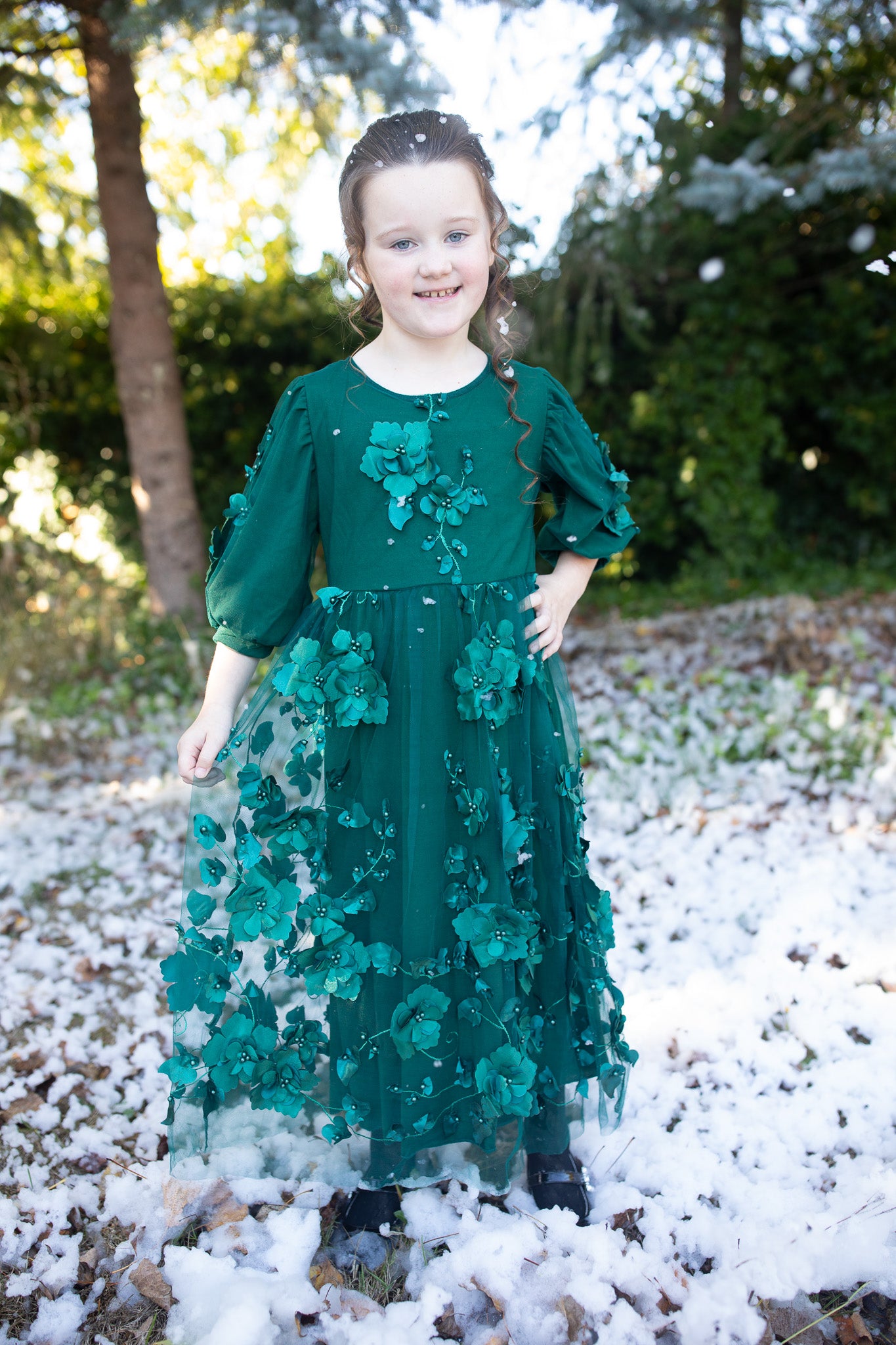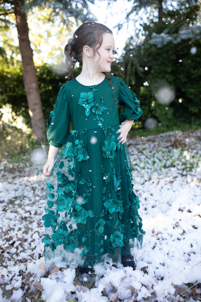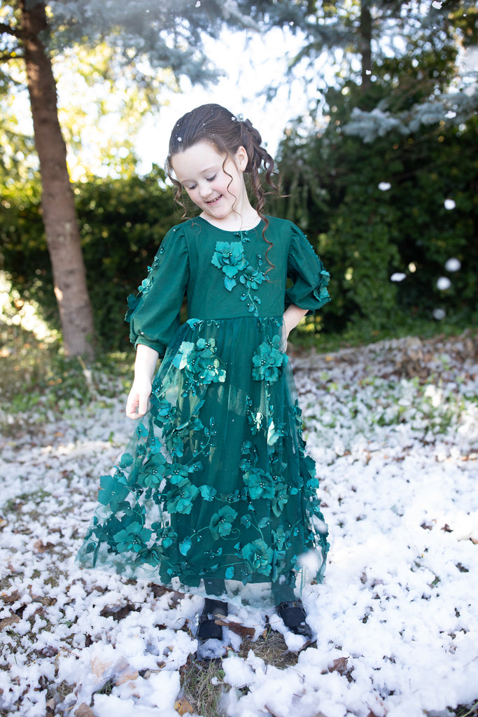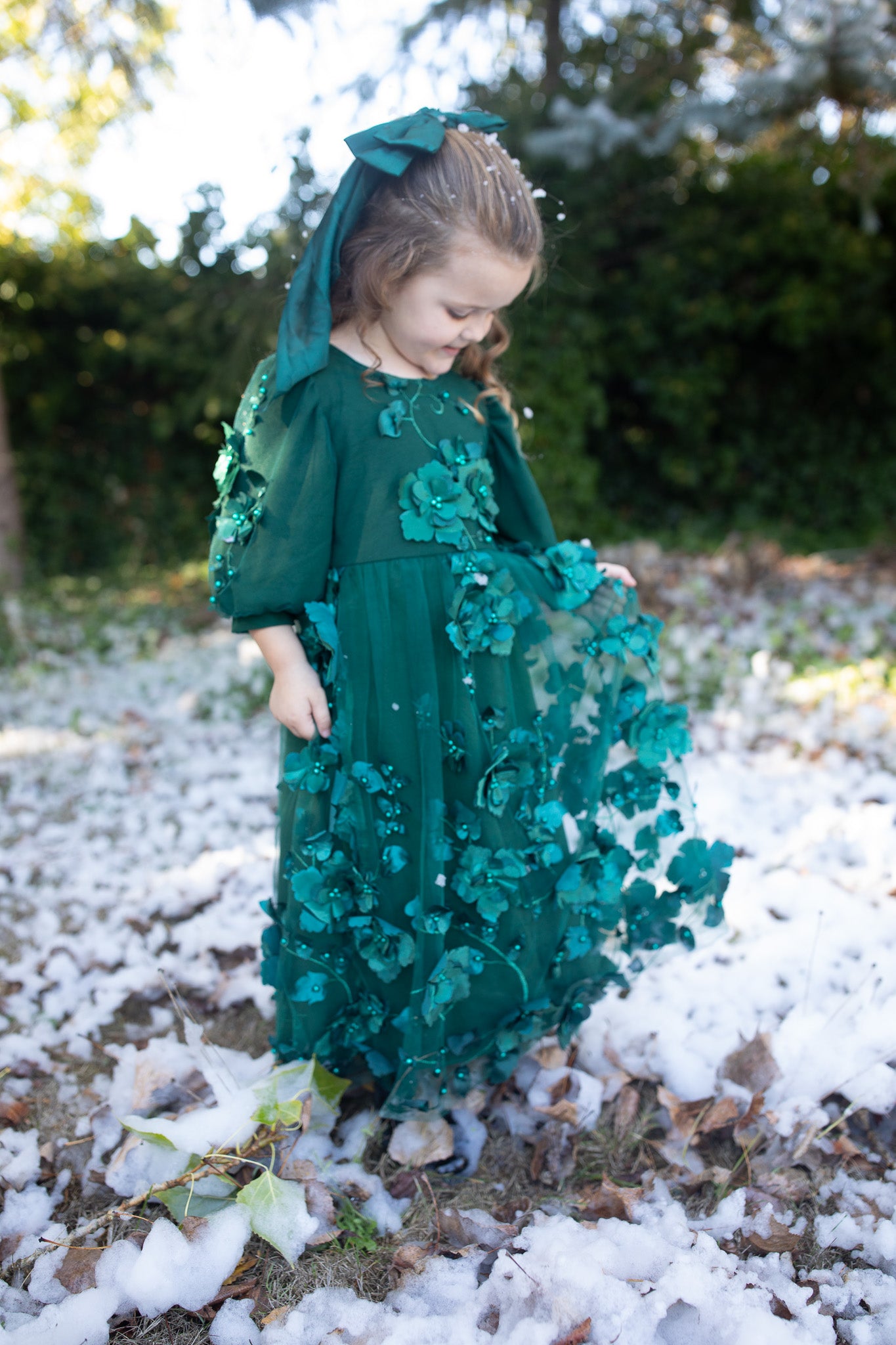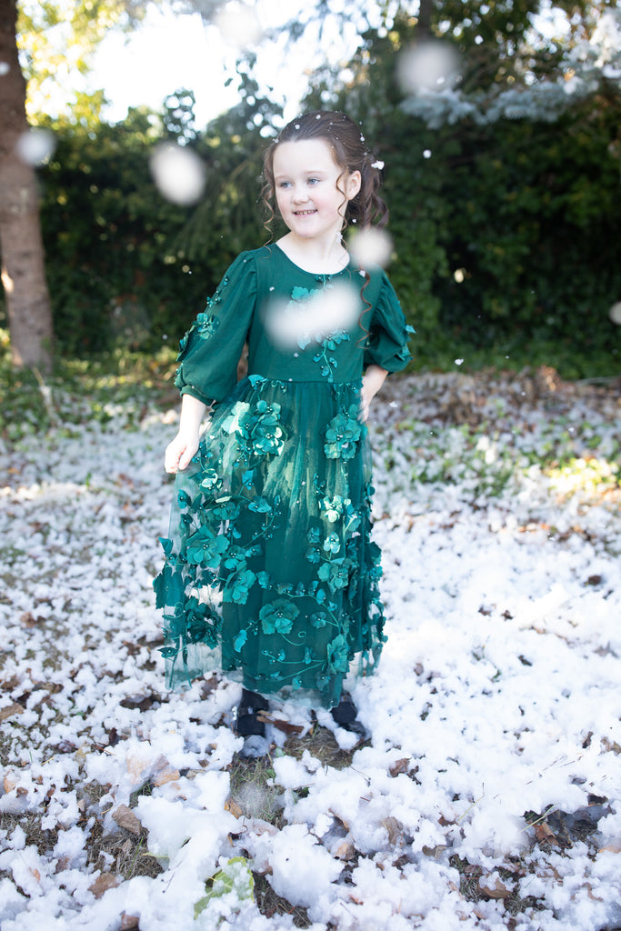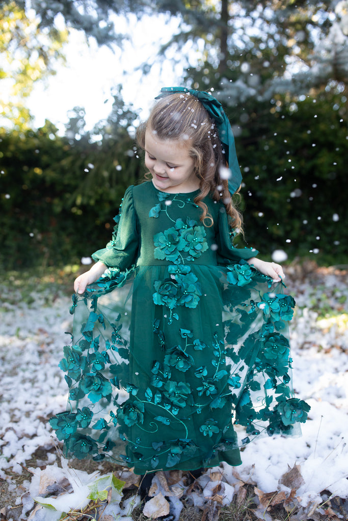 With its rich evergreen color and whimsical details, this dress captures the beauty and wonder of the season — a piece she’ll feel truly special in.