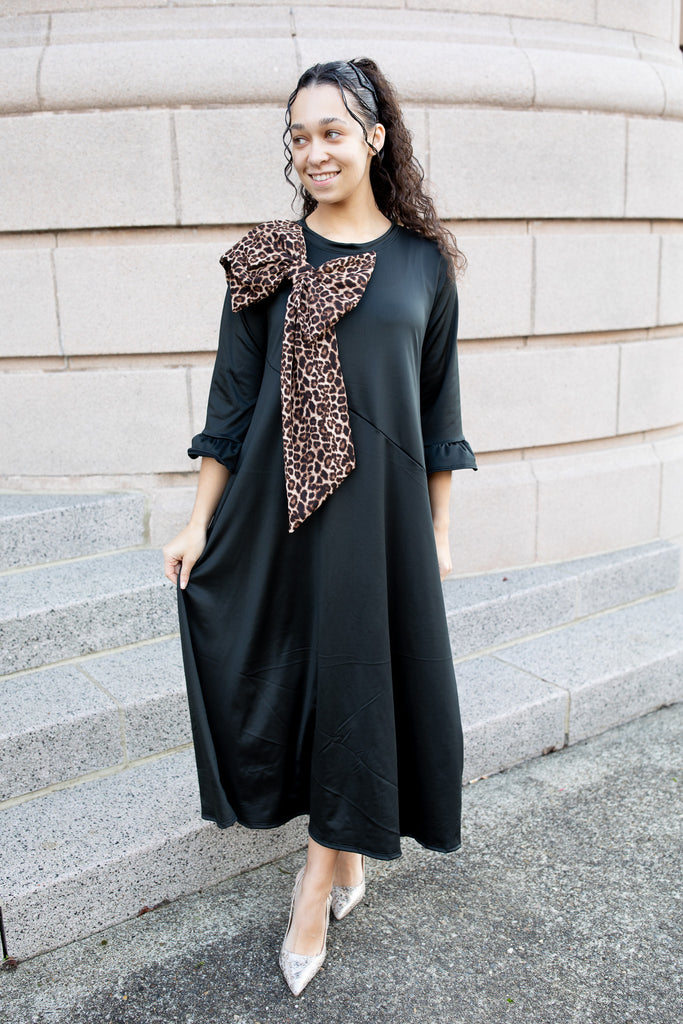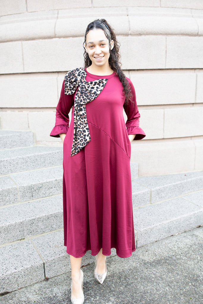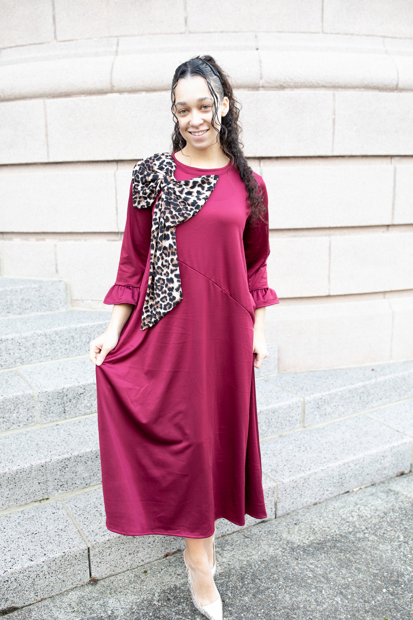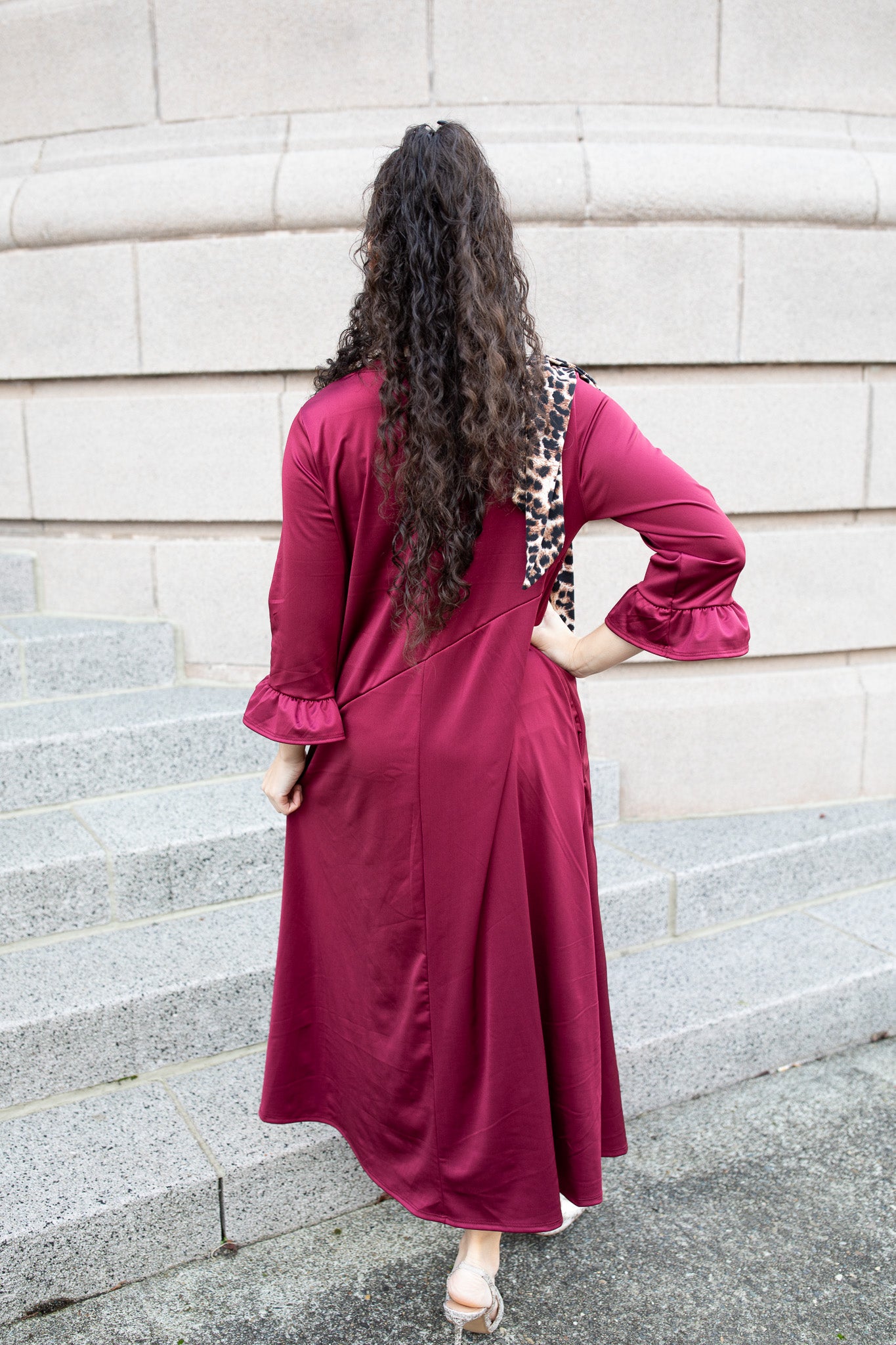 This beautiful holiday dress is made from a stretchy satin-feel material that drapes effortlessly for a smooth, elegant look. Designed with comfort and shine in mind, it features soft 3/4 sleeves with a subtle ruffle detail and a flattering A-line silhouette that moves gracefully. Perfect for festive gatherings, church events, photos, or special occasions, this timeless style is available in several stunning colorsβ€”making it an easy seasonal favorite.