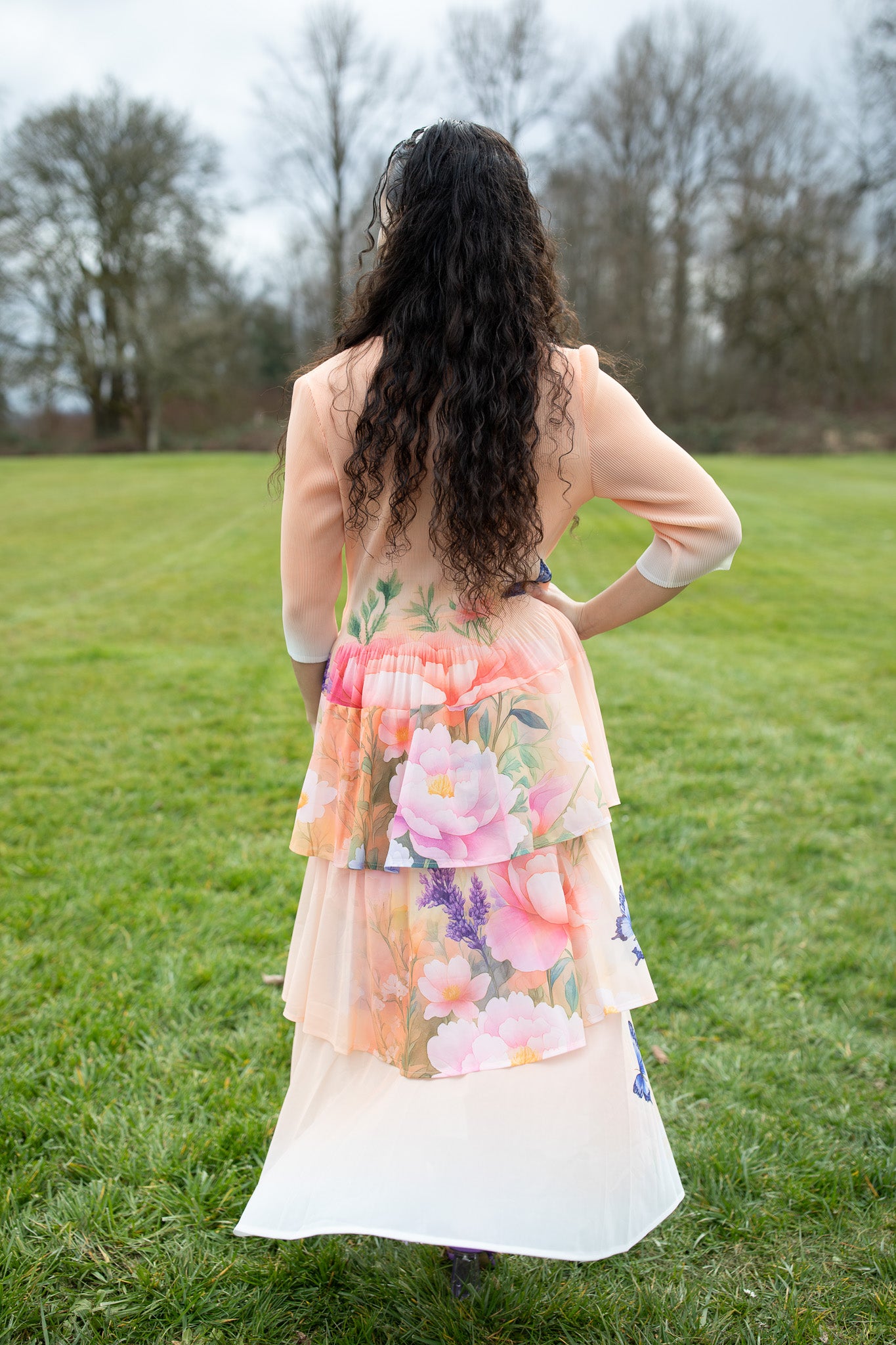 This beautifully flowy tiered midi dress features a pleated bodice that adds texture and shape while allowing for a comfortable, flexible fit. Designed in a one size silhouette that fits a range of sizes, this dress drapes effortlessly through the body with soft tiers that move gracefully as you walk.