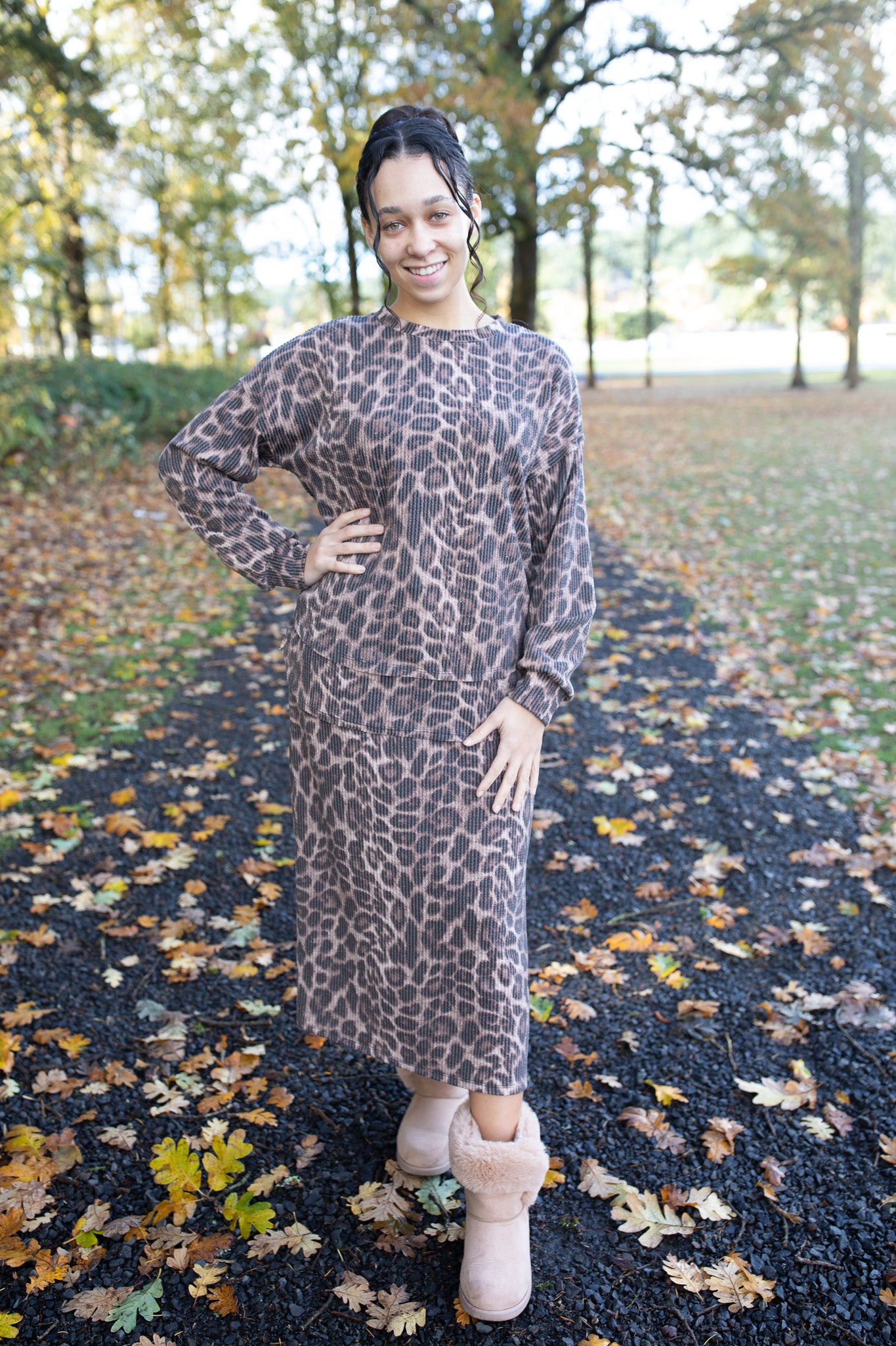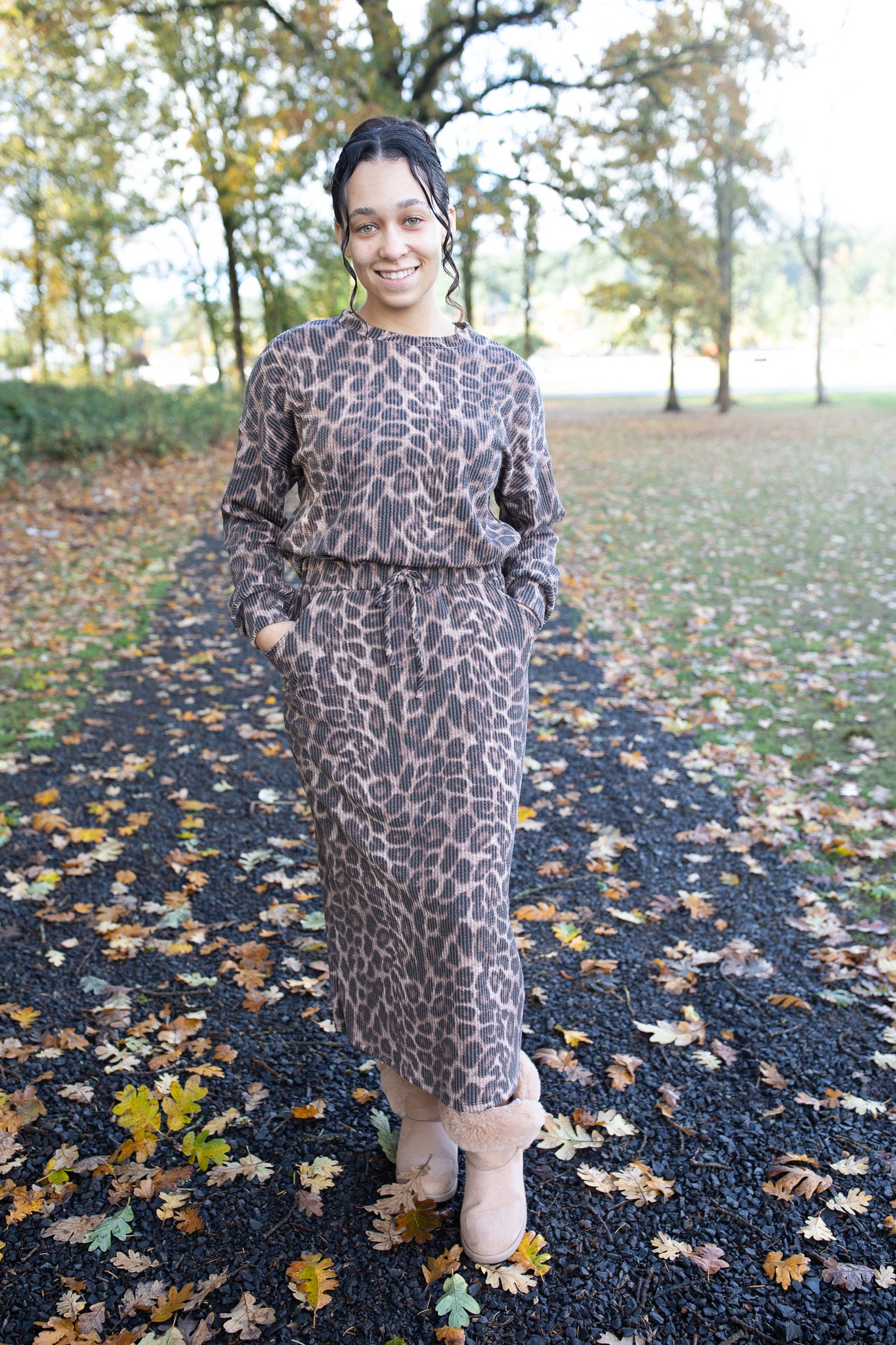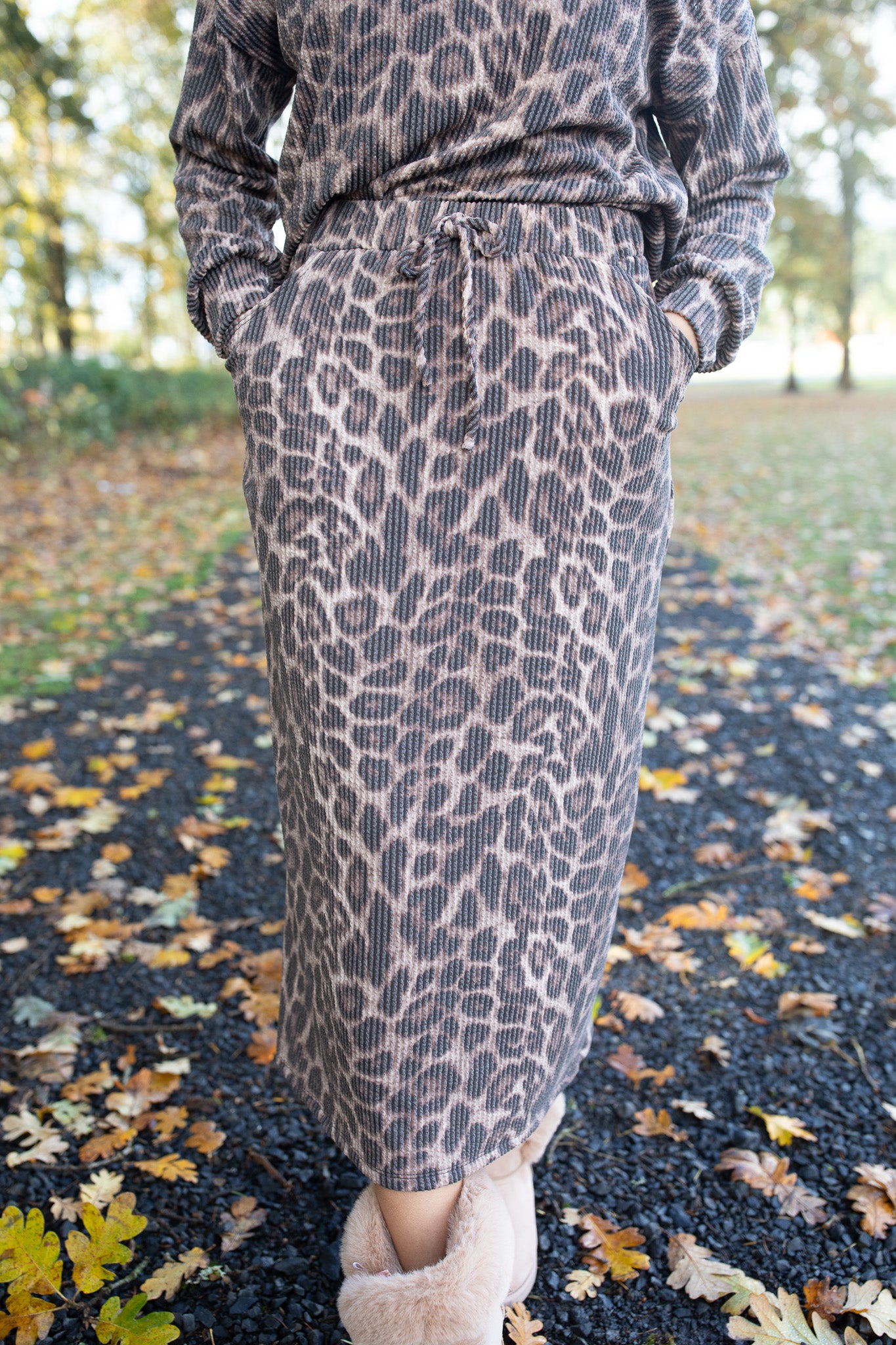 Stay cozy and chic with our Comfy Moment Skirt! Crafted from the same soft, ribbed leopard fabric as the matching top, this modest skirt features an elastic waistband with a ties—plus pockets for everyday comfort. Effortlessly stylish and easy to pair, it’s the perfect piece for lounging, errands, or a cozy day out.
