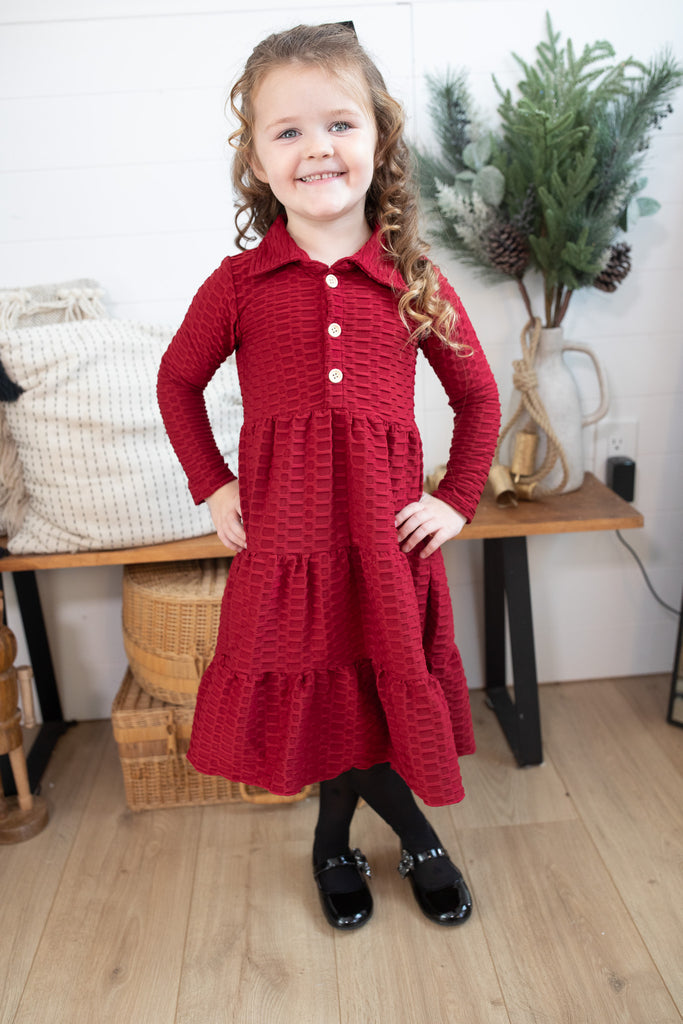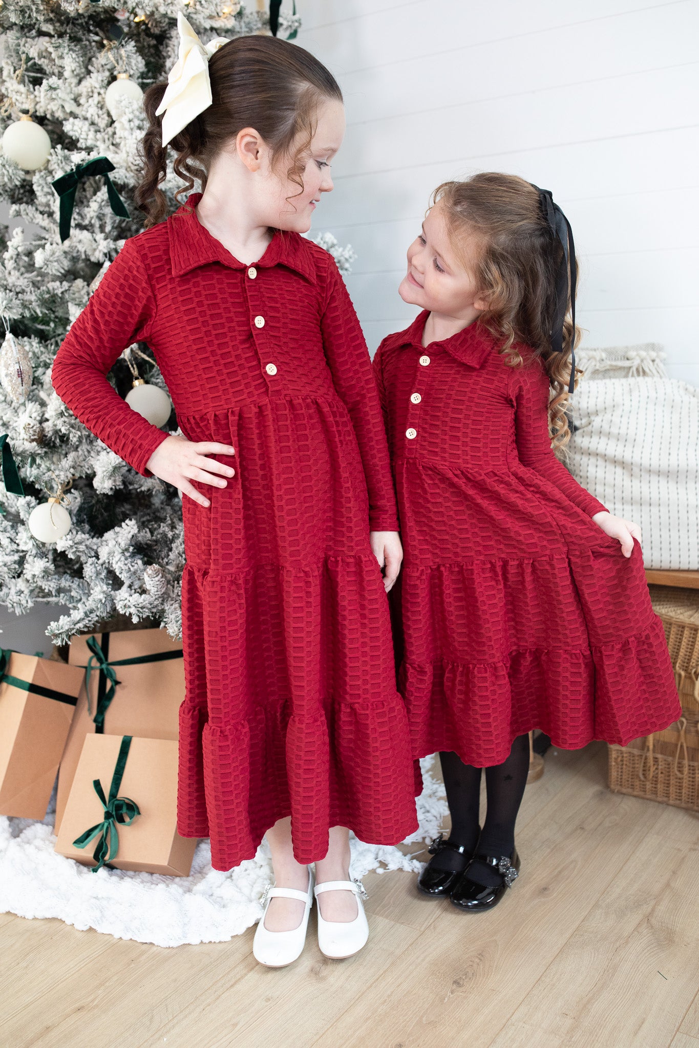 Just like mom’s! Our beloved Morgan Dress is now available for your little one in our cozy honeycomb fabric and a beautiful new holiday hue. Designed with a tiered skirt, functional buttons, and a soft collar, it’s both timeless and comfortable — perfect for special occasions or everyday wear. A sweet Mommy & Me favorite this season!