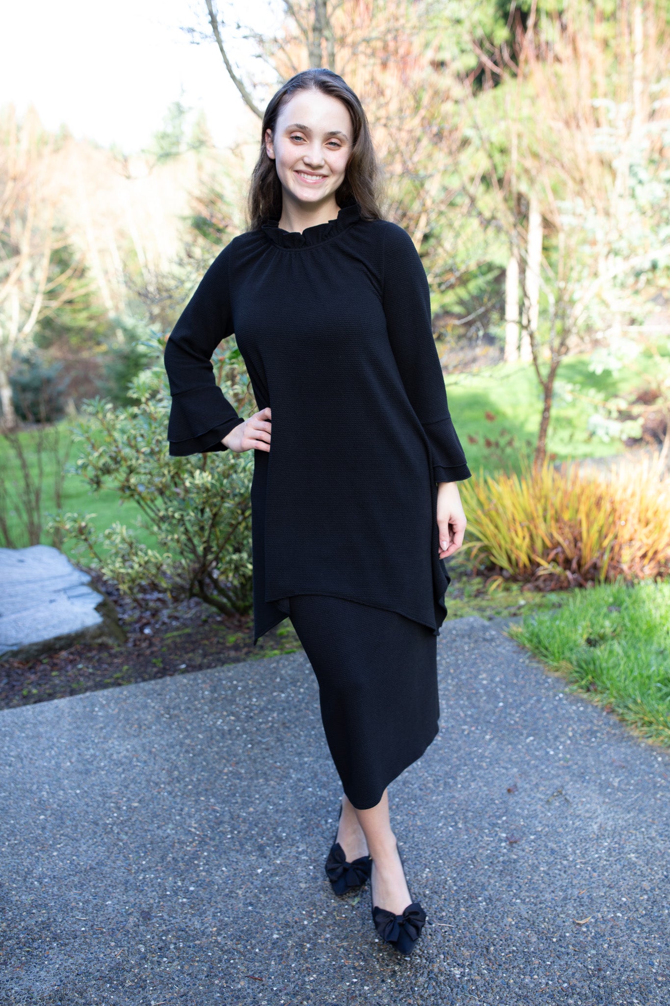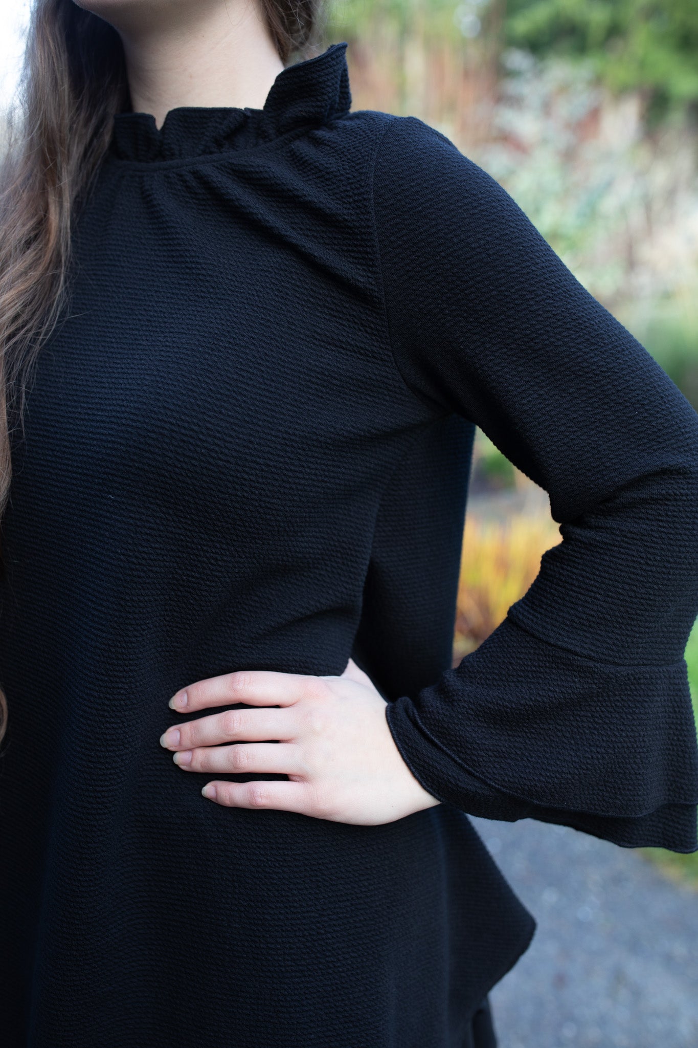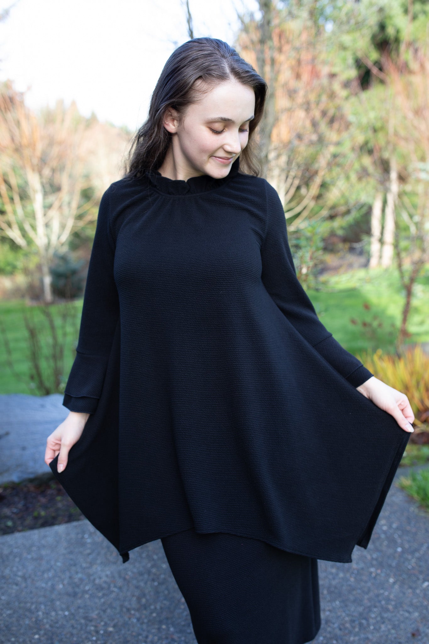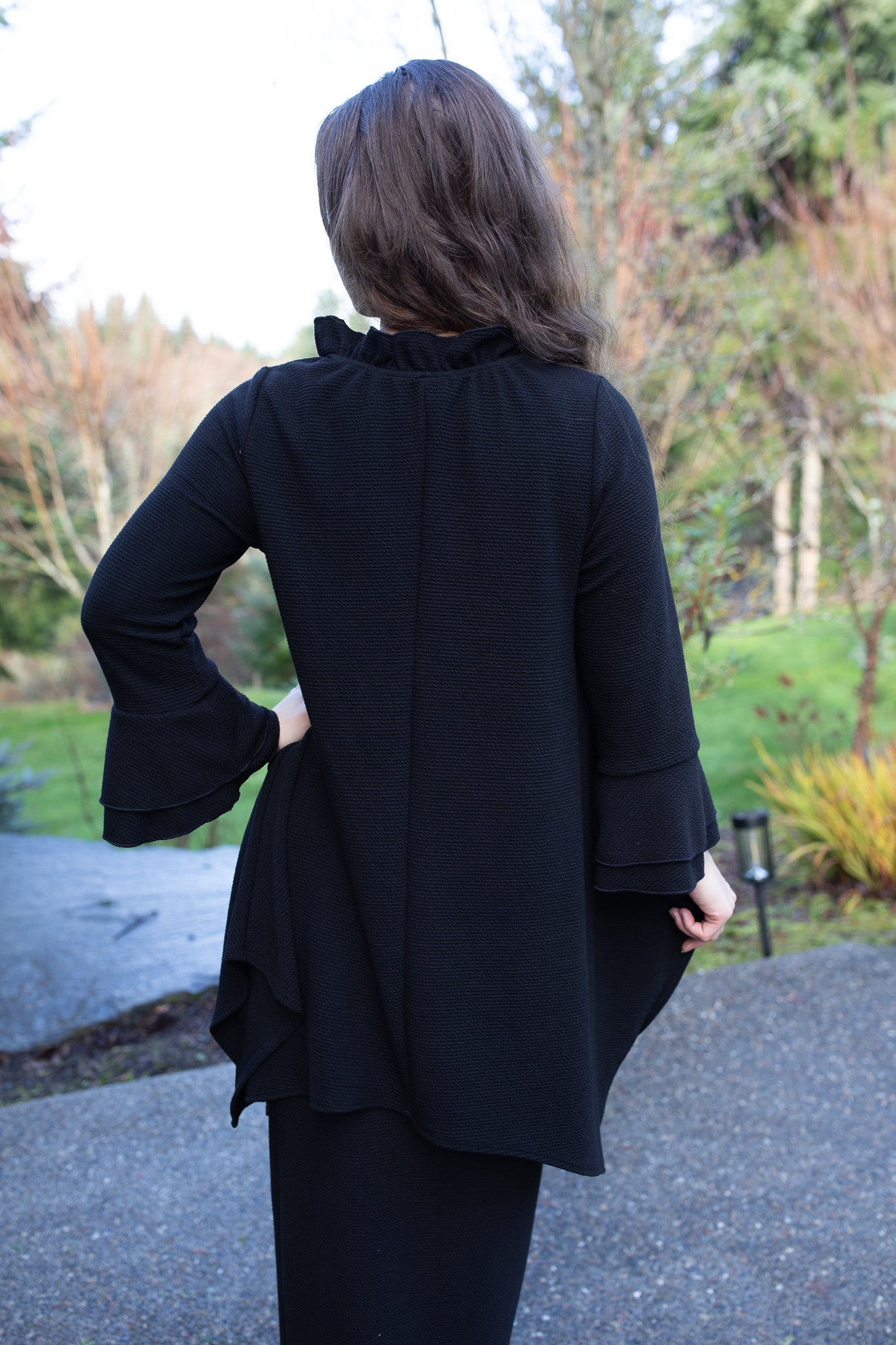 Meet the Winter Haven Top, a beautifully draped statement piece crafted in our brand-new ultra-soft seasonal fabric. Designed with a generous, flowy cut for effortless comfort, this top features a charming ruffle neckline, ruffled bell sleeves, and a sharkbite hem that creates elegant movement with every step.