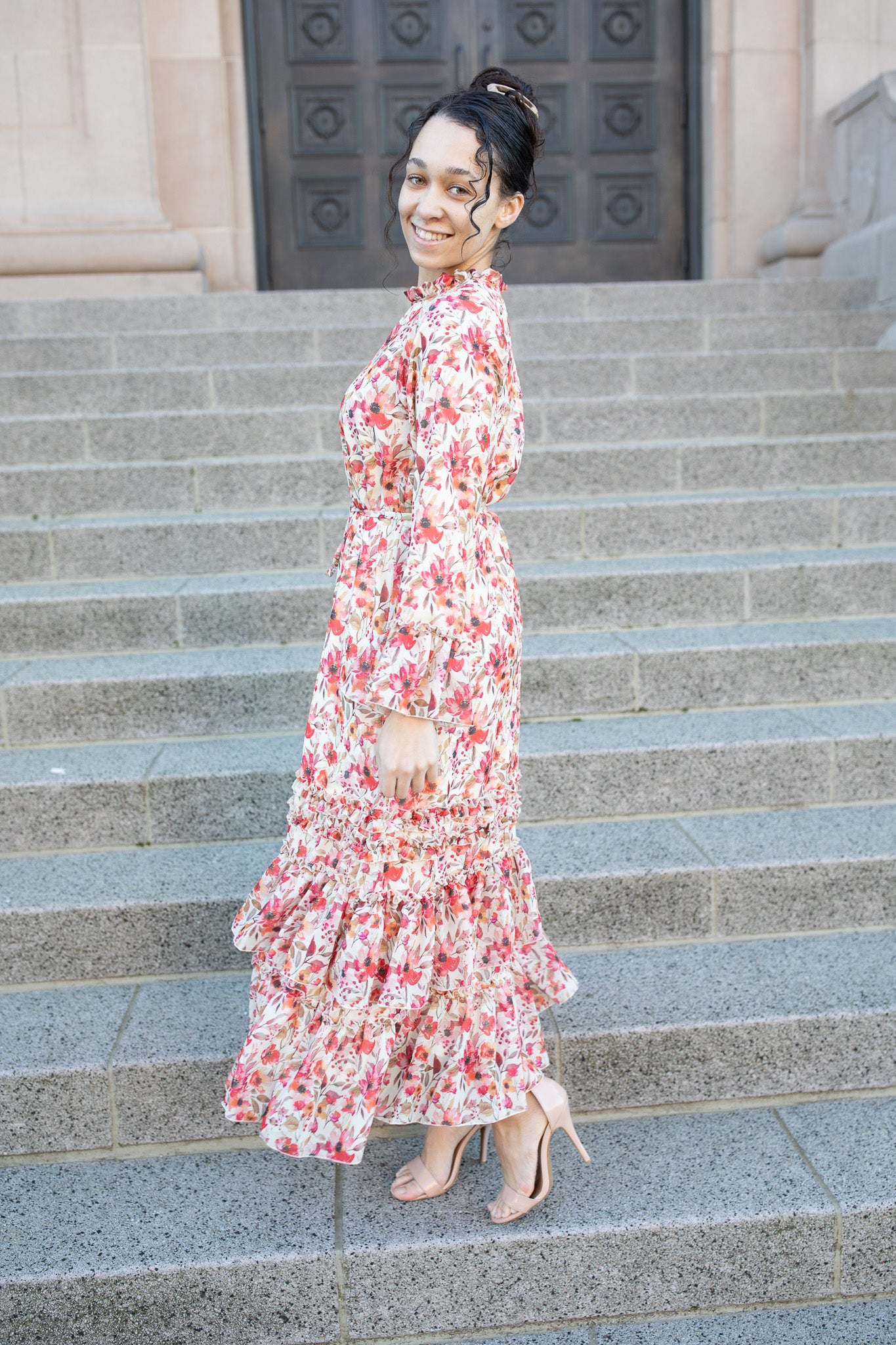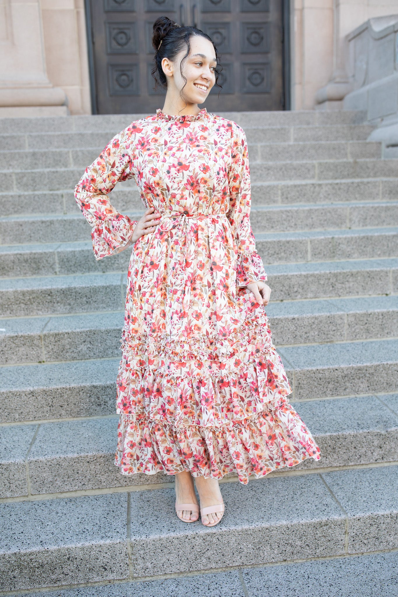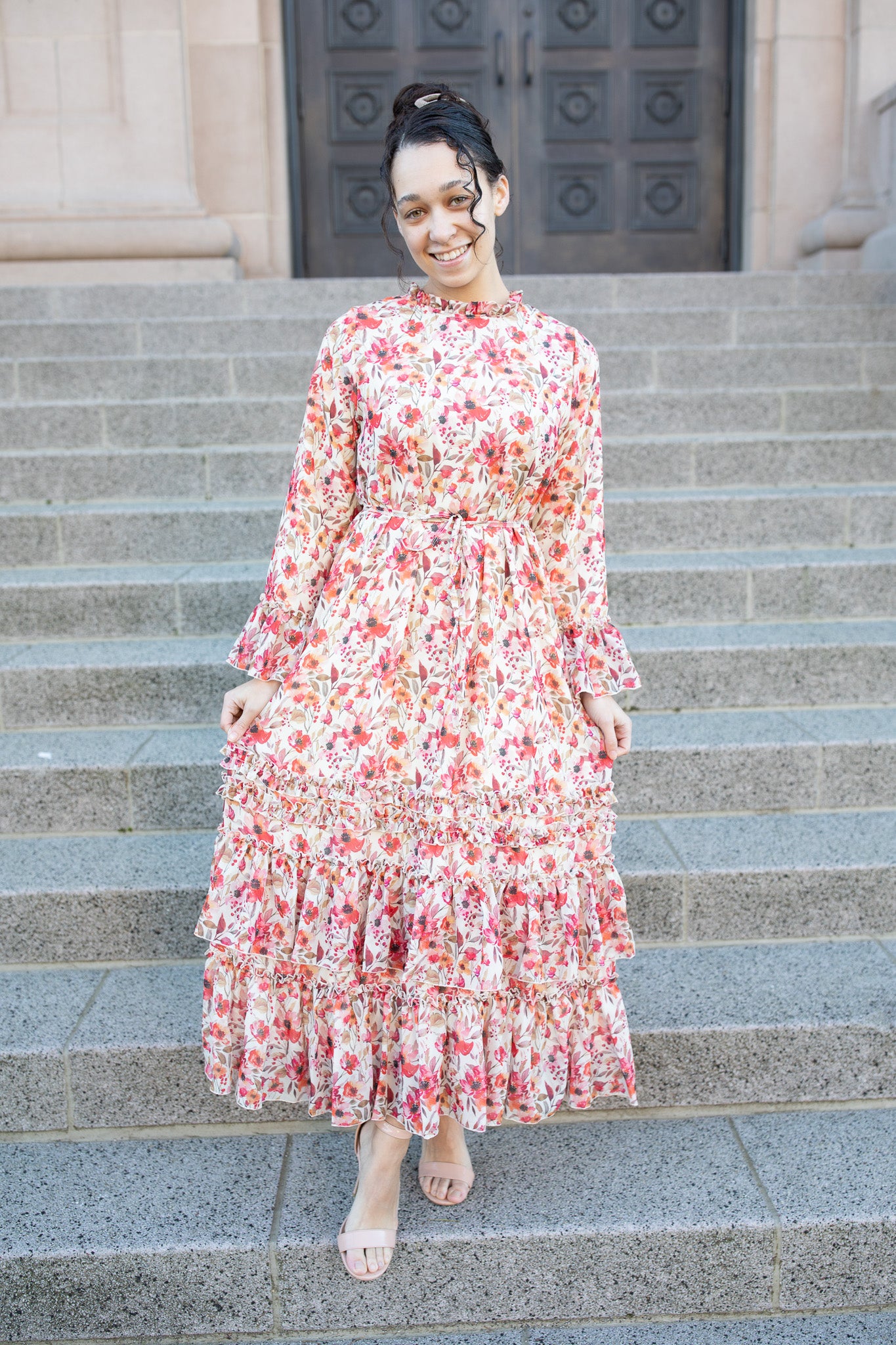 The flattering design can be styled two ways — wear it loose for an effortlessly flowy look or add the optional tie to define the waist. Ruffled cuffs, a romantic ruffle neckline, and cascading tiered hems add the perfect touch of graceful movement, making this dress ideal for Easter, Mother’s Day, weddings, or any special occasion.