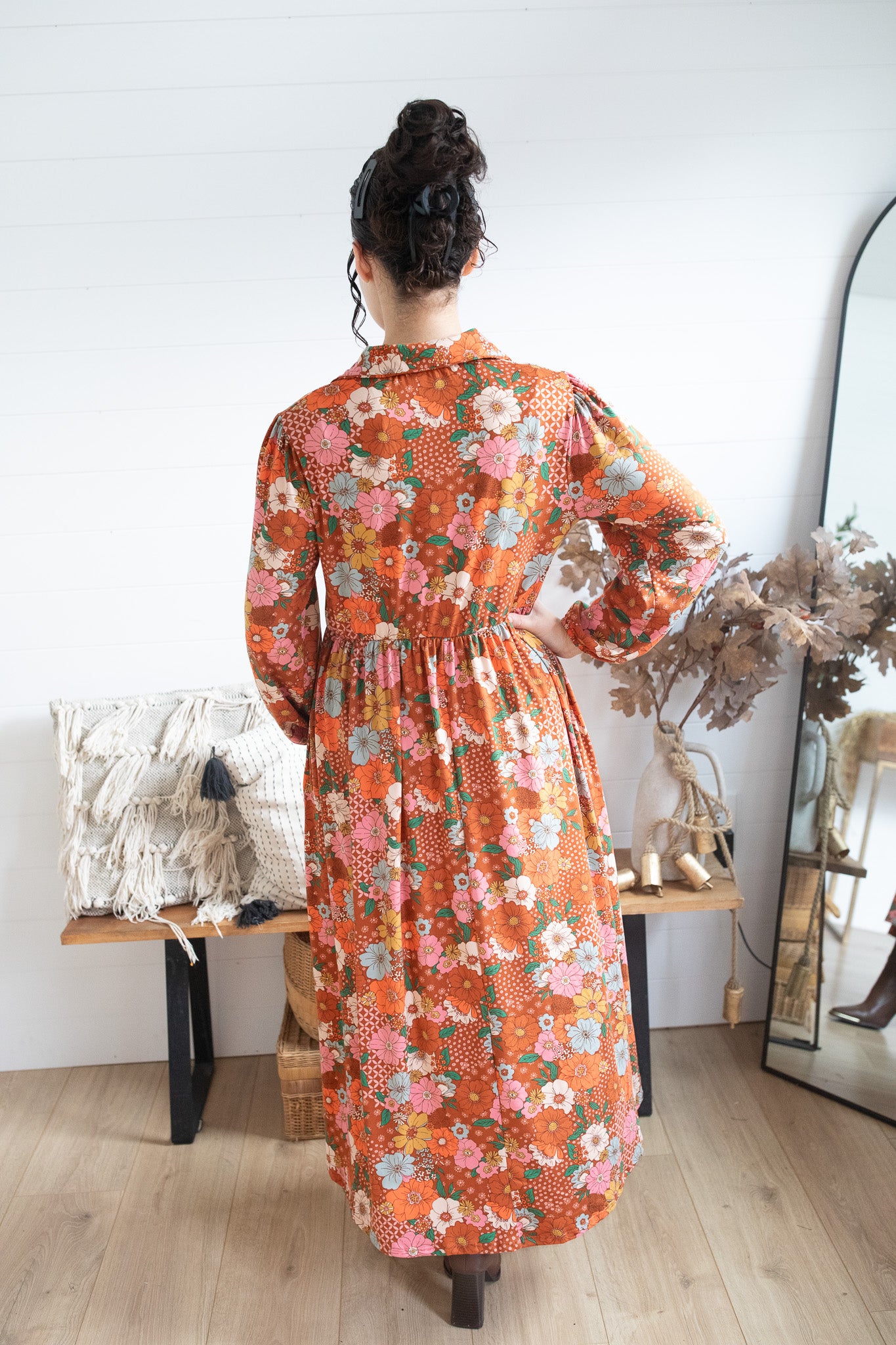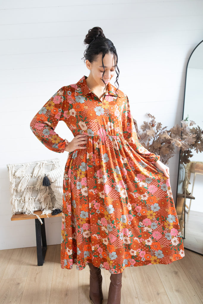 Meet your new fall favorite — the Harvest Meadow Dress! Made in the same soft, comfortable fabric and flattering style as our popular Autumn Patchwork Dress, this piece captures everything you love about cozy, effortless dressing. Featuring a collared neckline, functional pockets, and a flowy, relaxed silhouette that’s perfect for layering. The bold floral print brings just the right touch of fall charm.