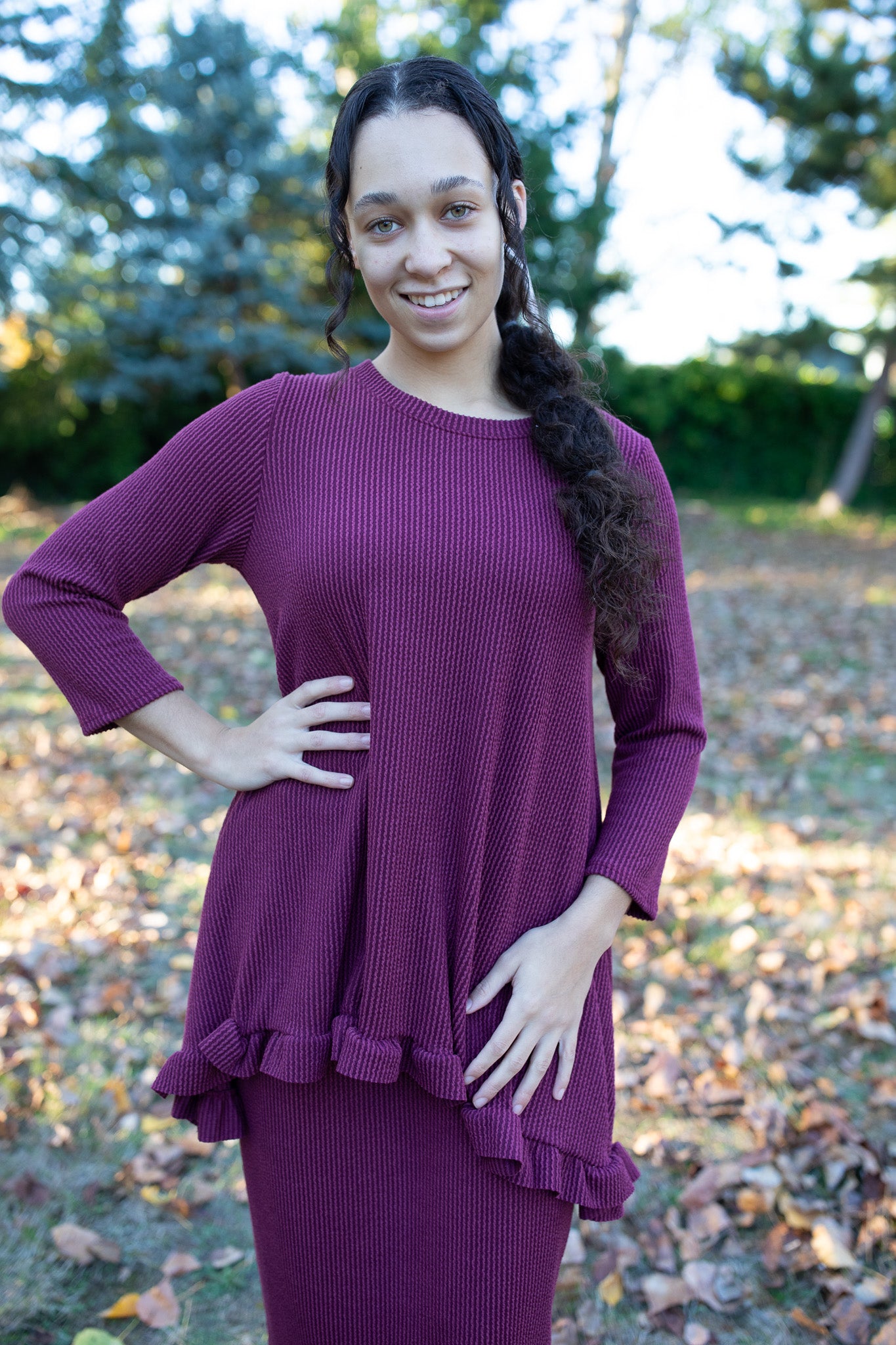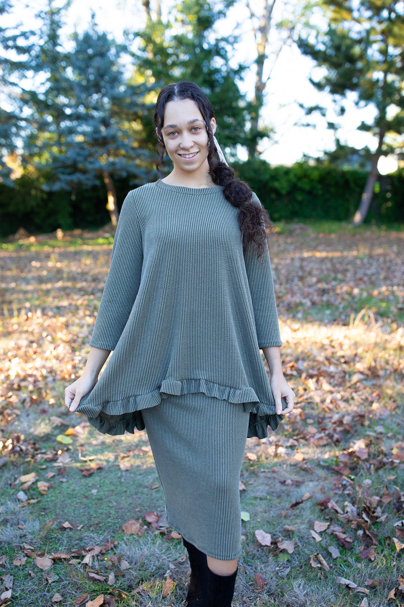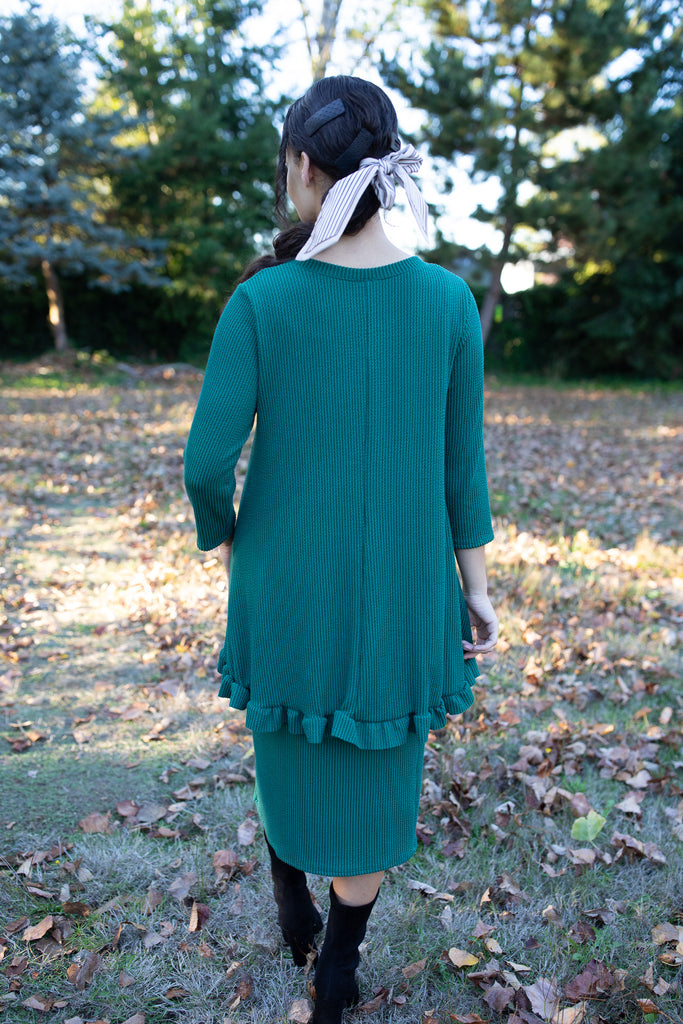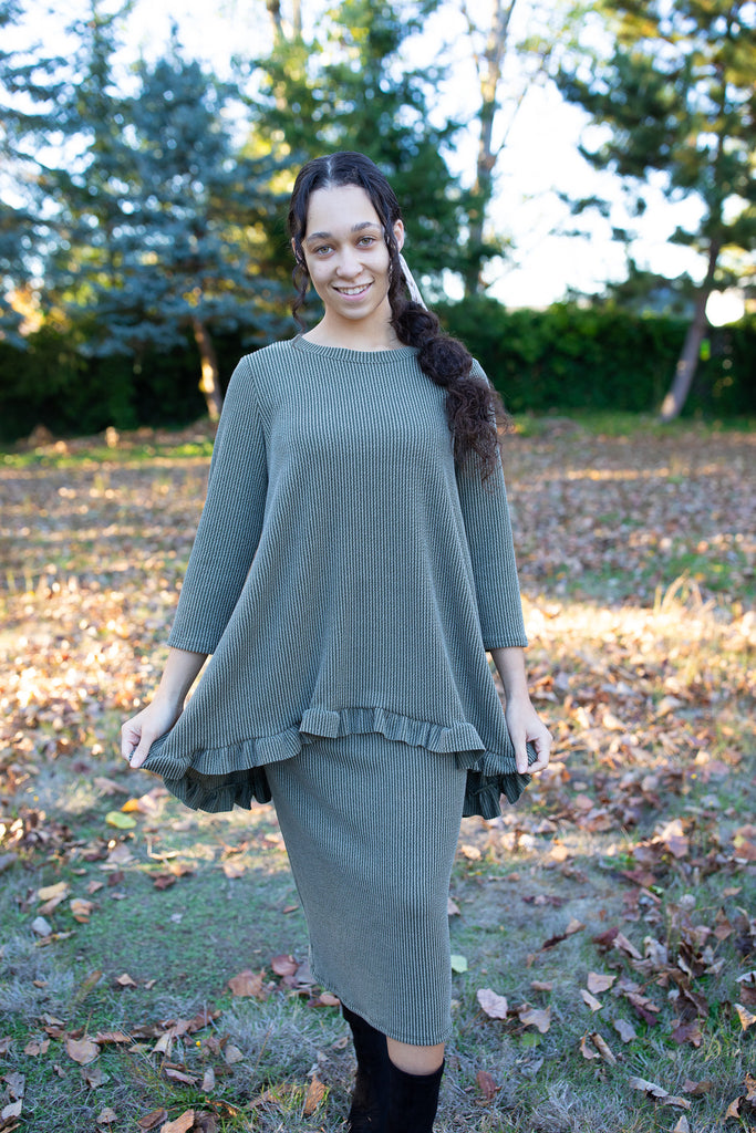 The Winter Ridge Top brings cozy elegance to the season. Crafted from our signature ribbed fabric, it features a flattering fit with a feminine ruffle hem that adds the perfect touch of charm. Soft, stretchy, and versatile, this top pairs beautifully with the matching Winter Ridge Skirt or your favorite denim for effortless, all-day style.
