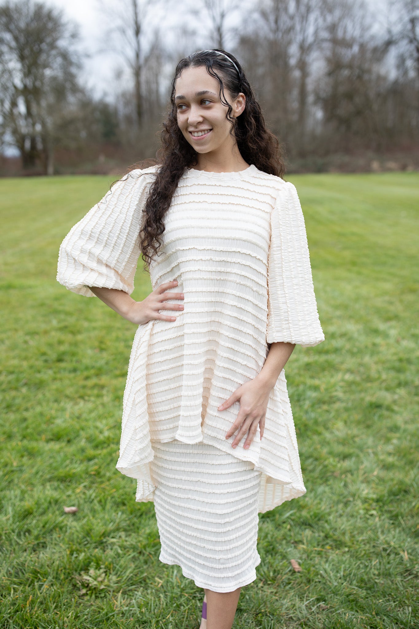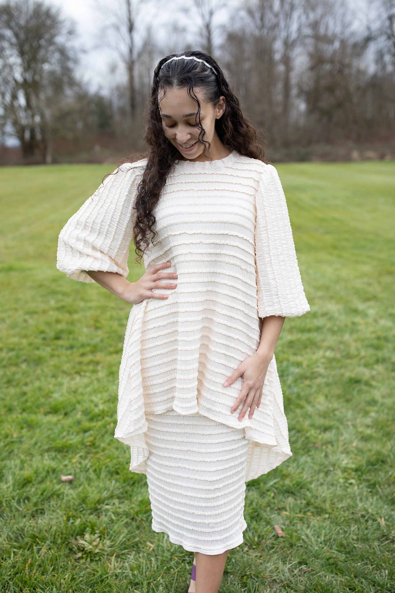 Feminine, soft, and effortlessly elevated โ€” our Brooklynn Ruffle Top returns in a beautiful new cream textured fabric designed for both comfort and style. Crafted with a stretchy ruffle texture and fully lined for coverage, this top offers a modest flowy fit that moves beautifully while keeping you comfortable all day long.