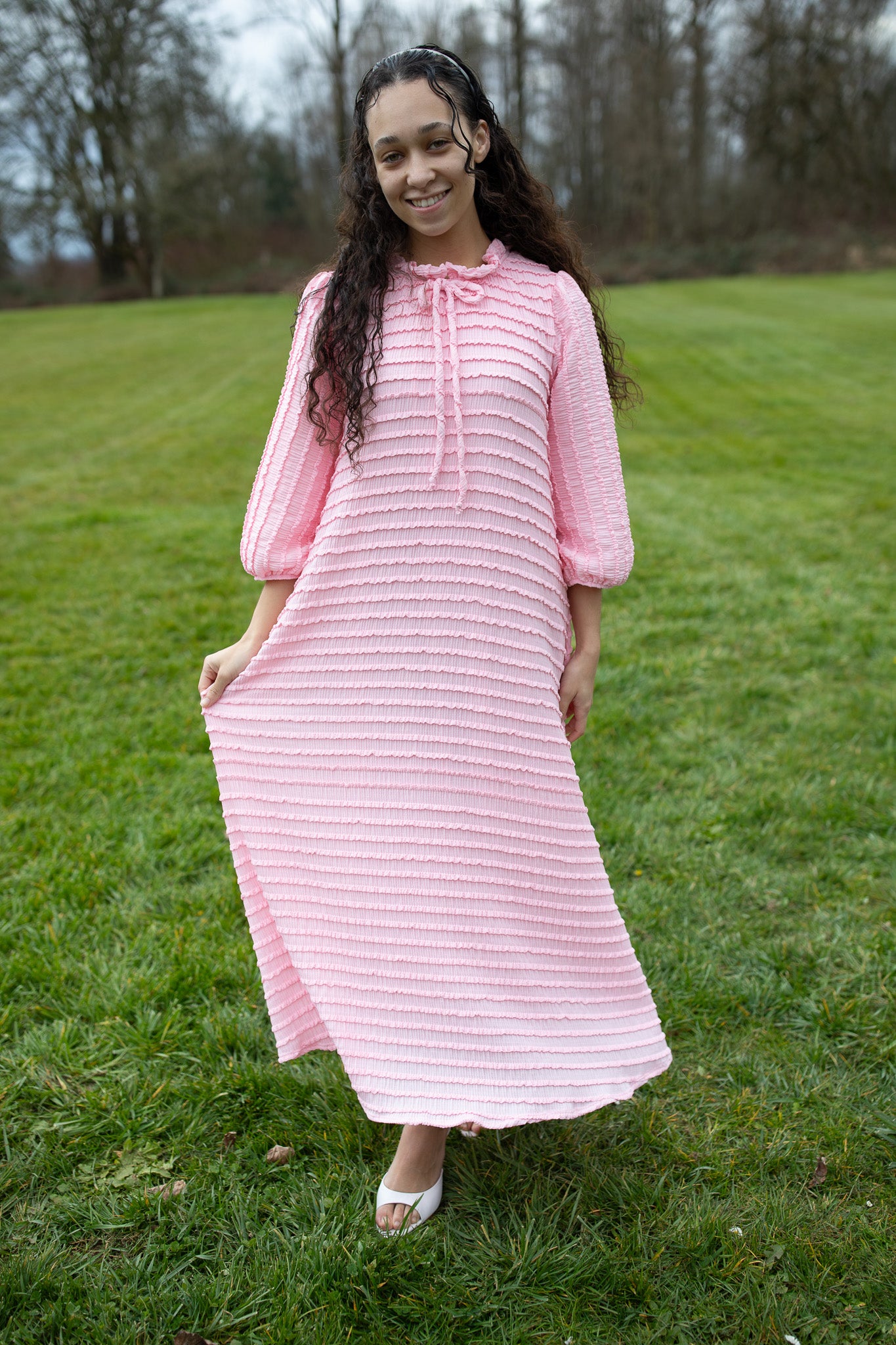Designed with delicate ruffle details throughout, this elegant silhouette features a soft tie neckline, feminine puff sleeves, and a flowy fit that moves gracefully with every step. The fully lined design provides comfortable coverage while maintaining a lightweight feel, making it perfect for special occasions and everyday elegance.