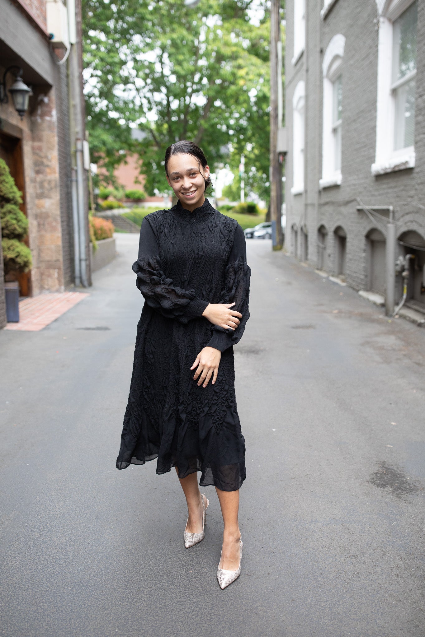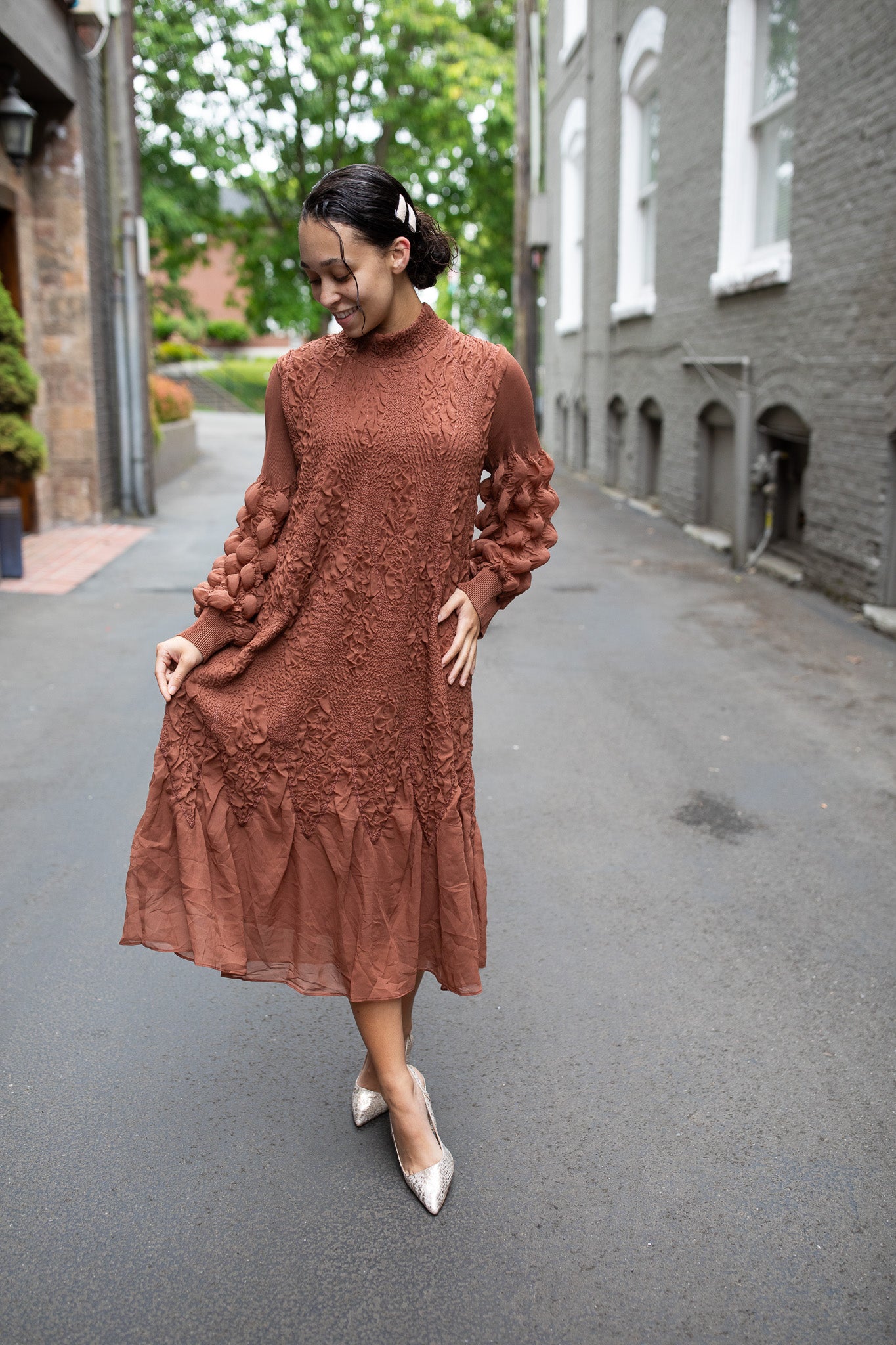 Unleash your inner elegance with the She Walks With Dignity Dress! This unique dress features a lined body, crinkled embroidered fabric, and puffy pleated sleeves for a touch of sophistication. Its lightweight material offers some stretch for a comfortable fit. Limited stock available, so make it your new favorite dress now! Please Note: Sleeves are not lined and have some sheerness to them.
