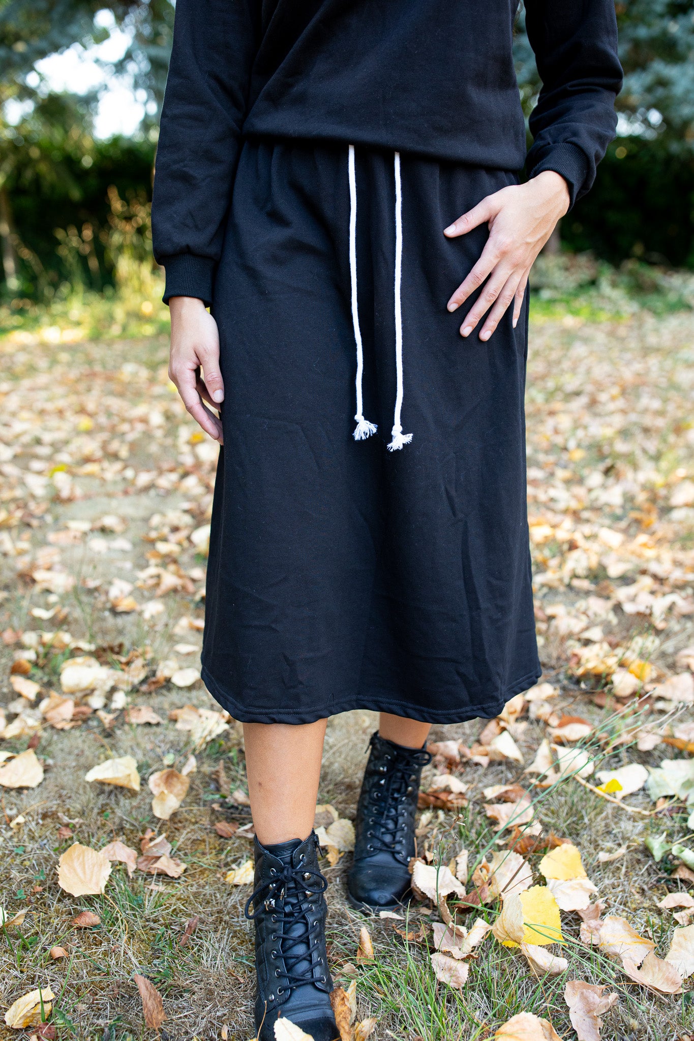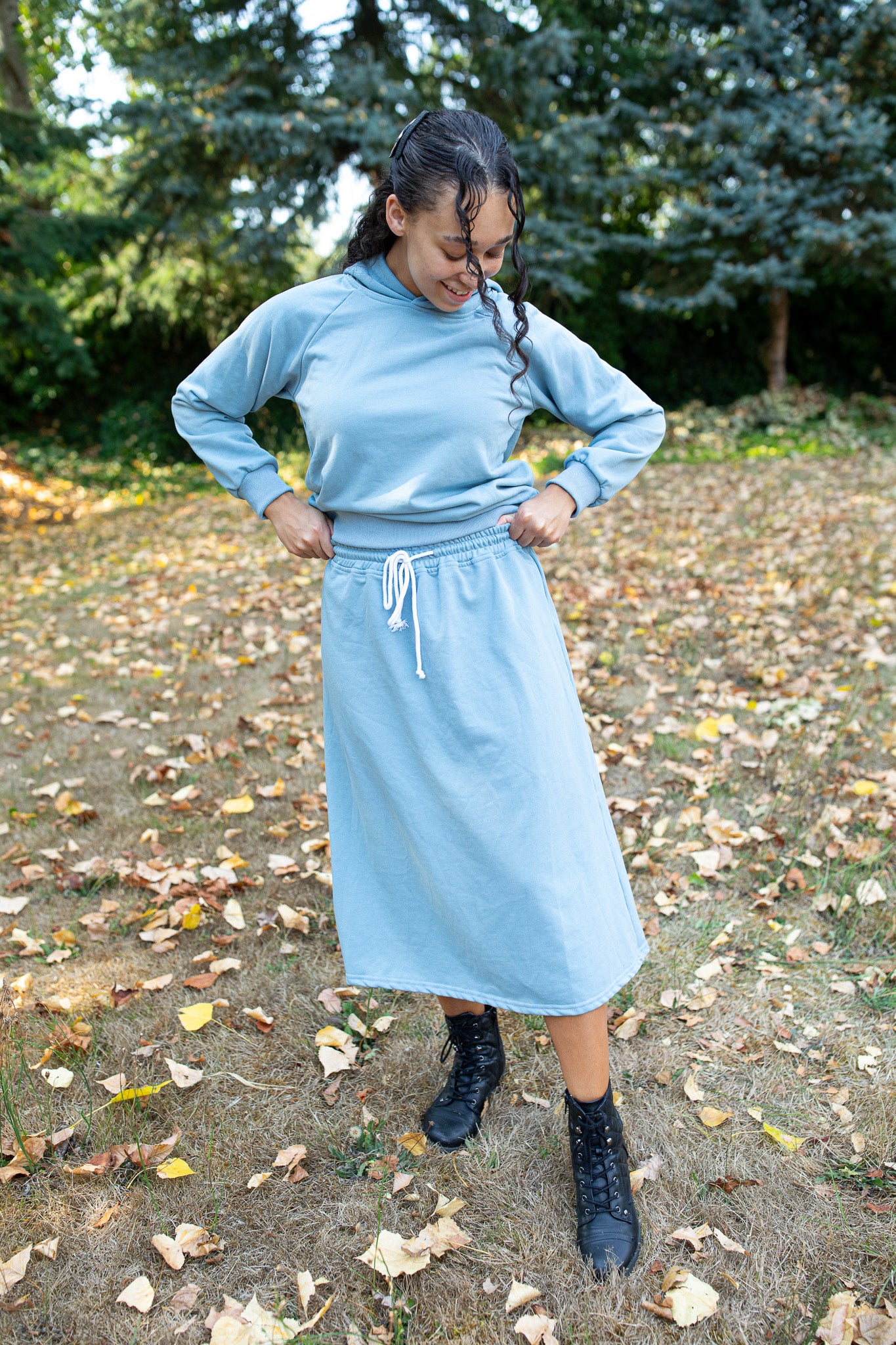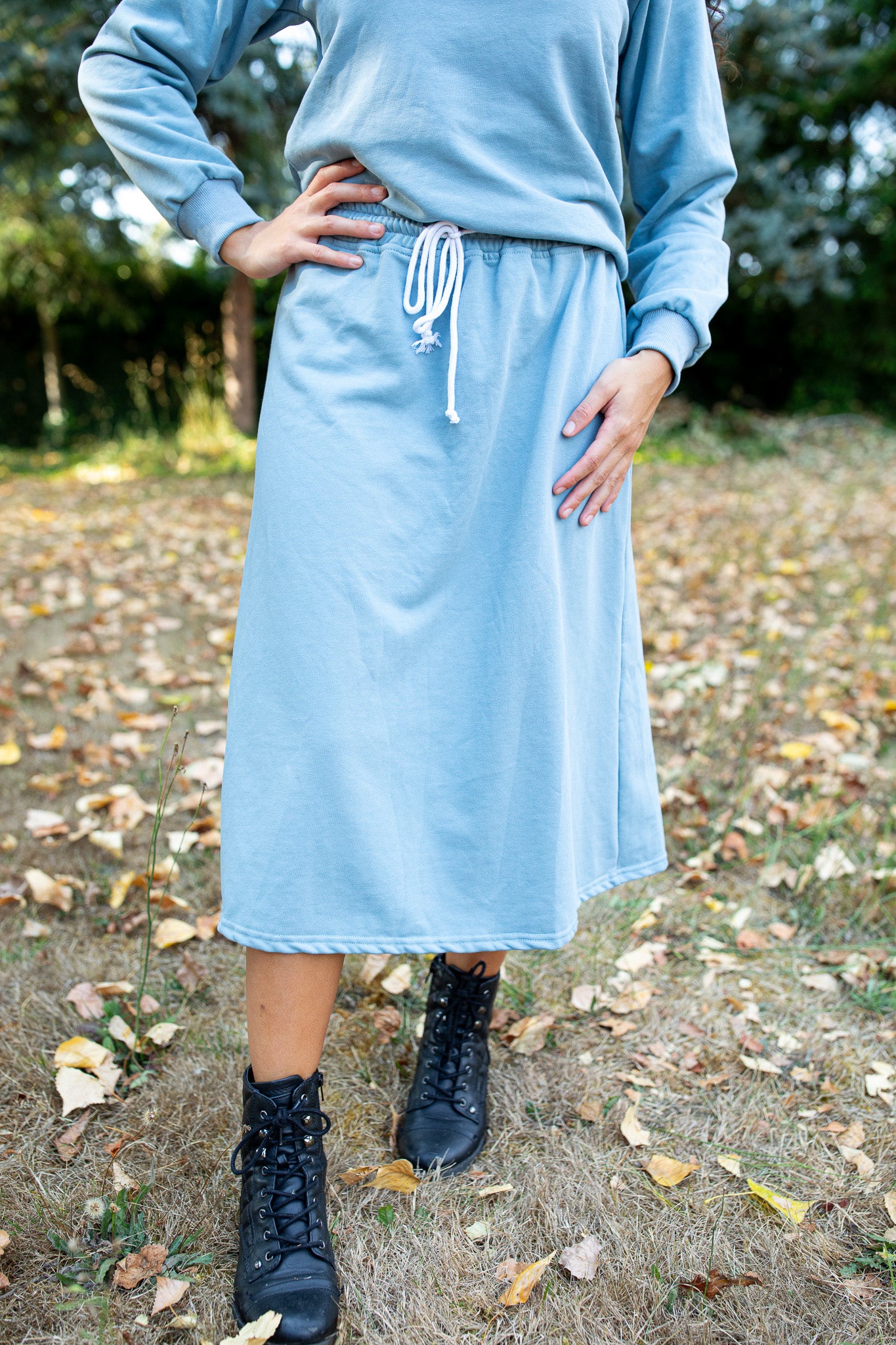 The Lounge Drawstring A-Line Skirt is the ultimate in casual comfort. Featuring a soft elastic waistband with a drawstring, it offers an easy pull-on fit without the need for constant adjusting. The relaxed A-line cut makes it flattering and effortless to wear, while the cozy fabric keeps it perfect for lounging or on-the-go days. Pair it with our matching hoodie top for a chic, coordinated set.