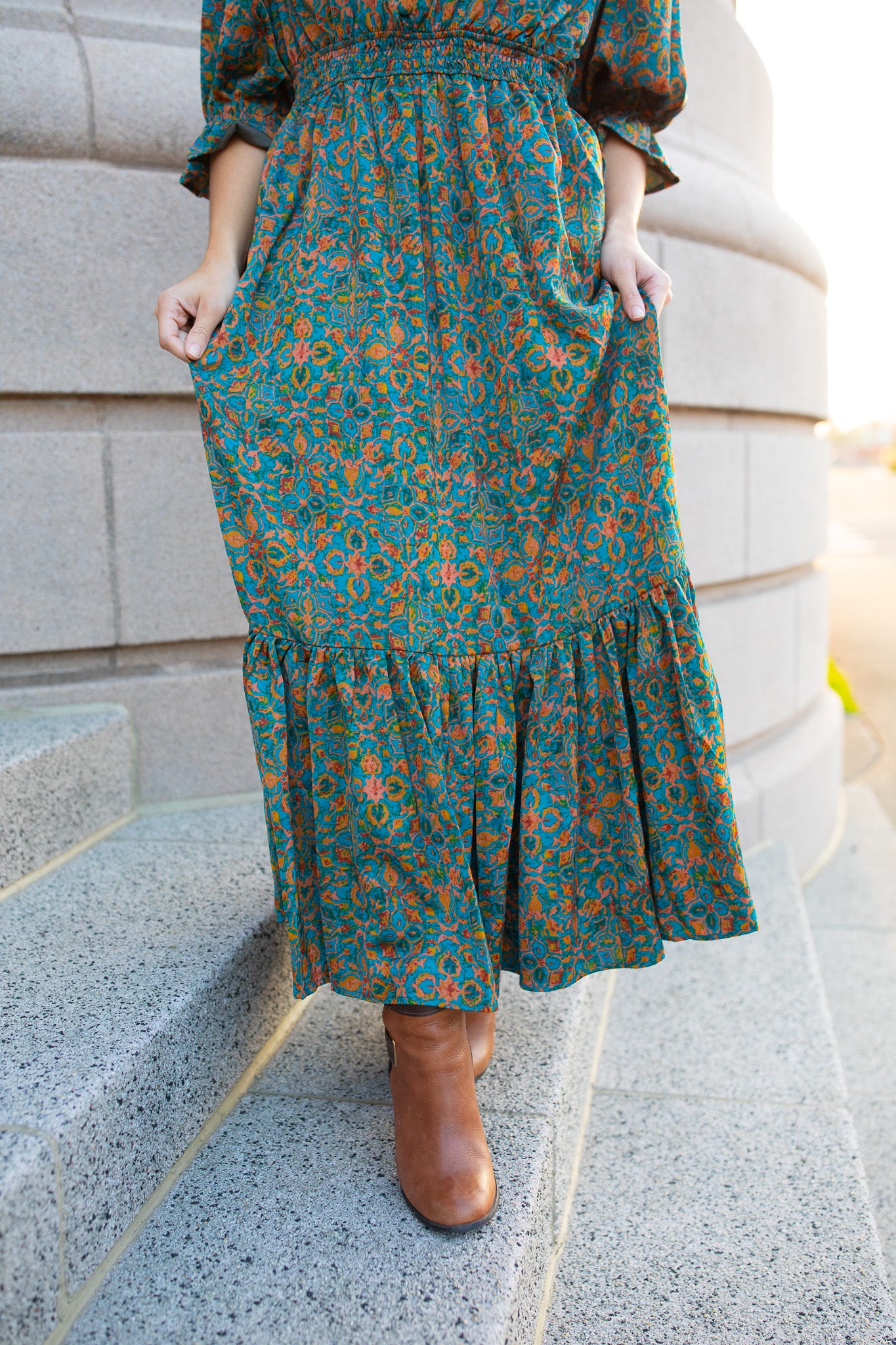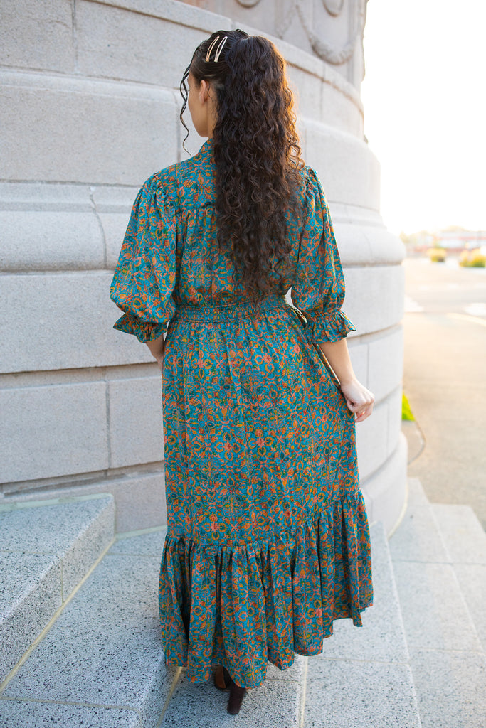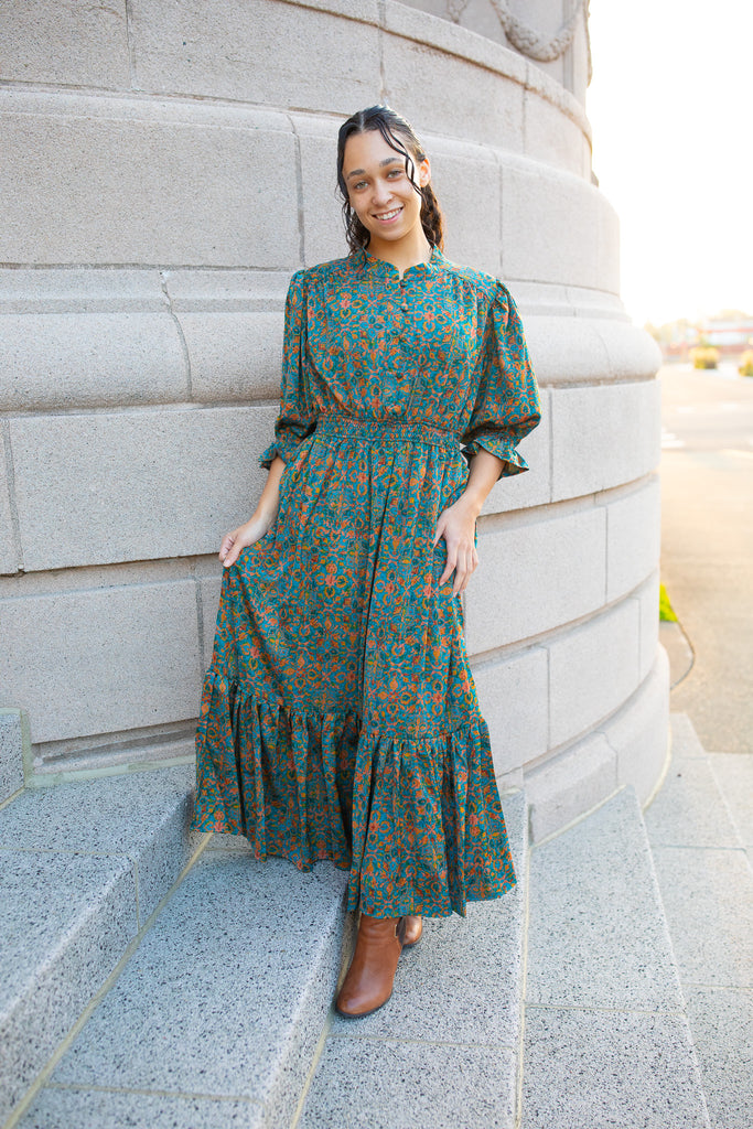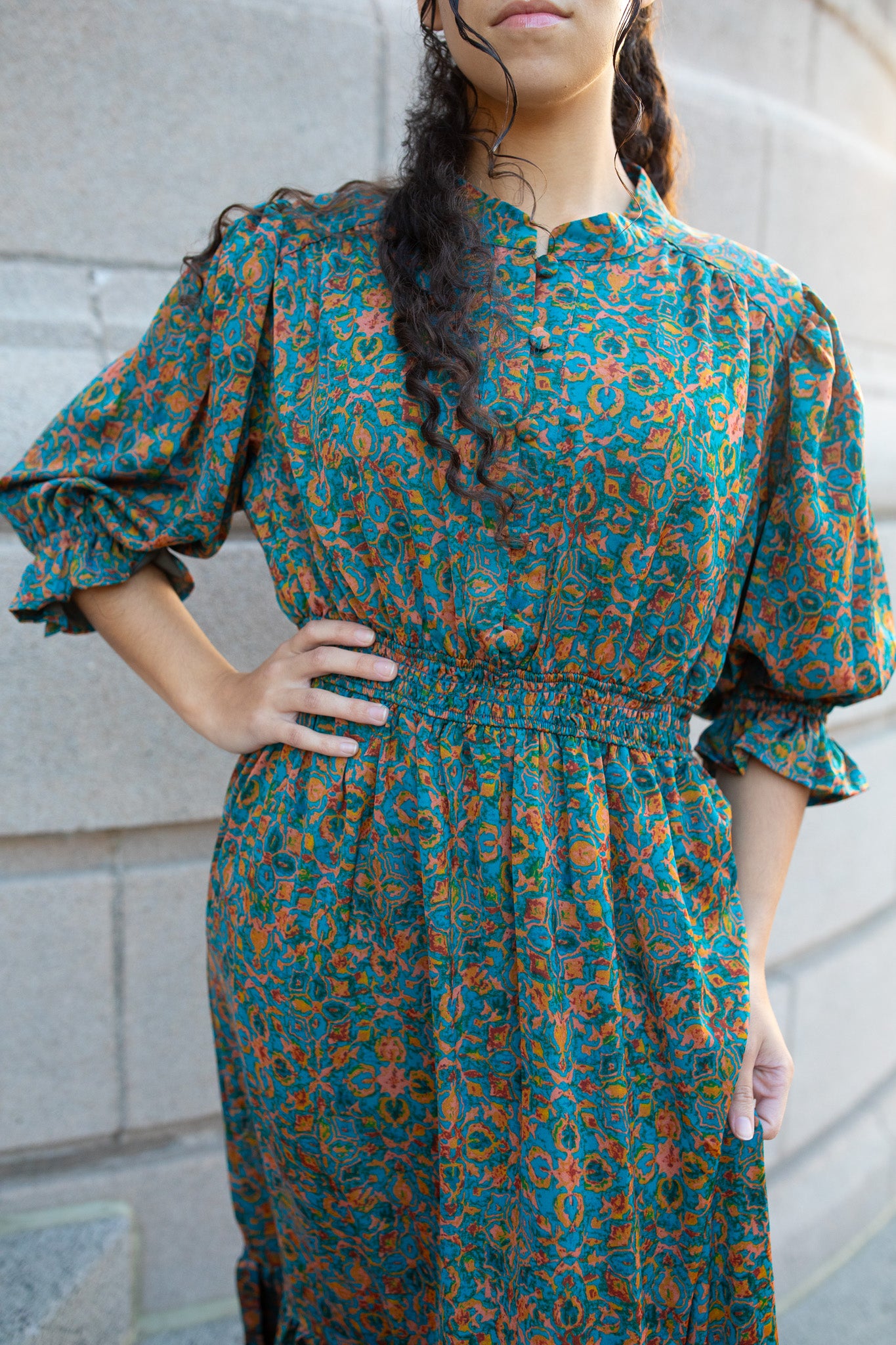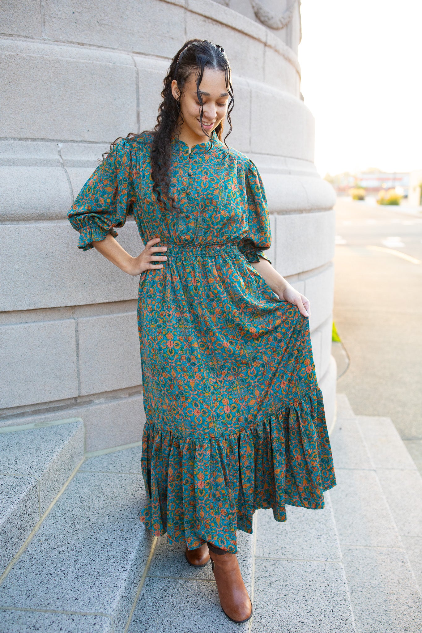 Step into timeless elegance with the Autumn Mosaic Dress. Featuring a rich tapestry-inspired print in jewel tones of teal, rust, and gold, this dress brings artistry to everyday wear. Designed with puff sleeves, a flattering elastic waist, and a tiered ruffle hem, it combines structure and flow effortlessly. The modest neckline with button detail adds charm, while the pockets make it as practical as it is beautiful. Perfect for fall and beyond, this dress is your go-to for both casual outings and special gatherings.